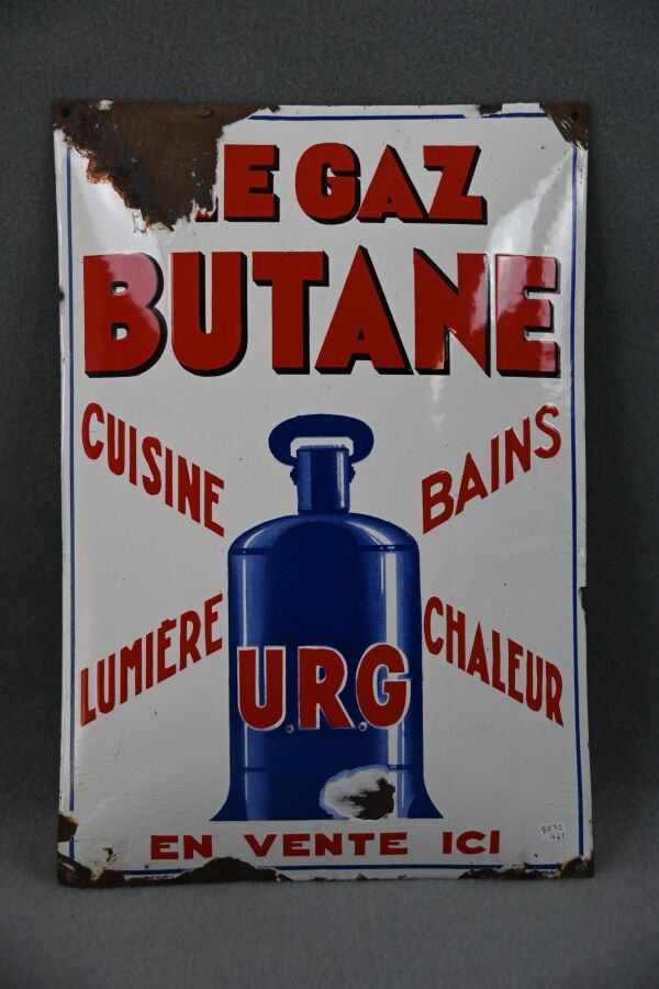 URG LE GAZ BUTANE, "Cuisine, Bains, Lumière, Chaleur" (Kitchen, Bath, Light, Warmth), Advertising plate in enamelled sheet metal, convex rectangular shape. Chips and scratches. Dimensions: 49.5 x 34 cm