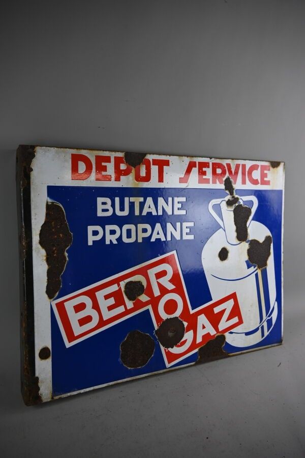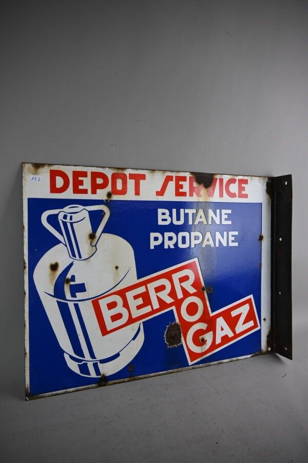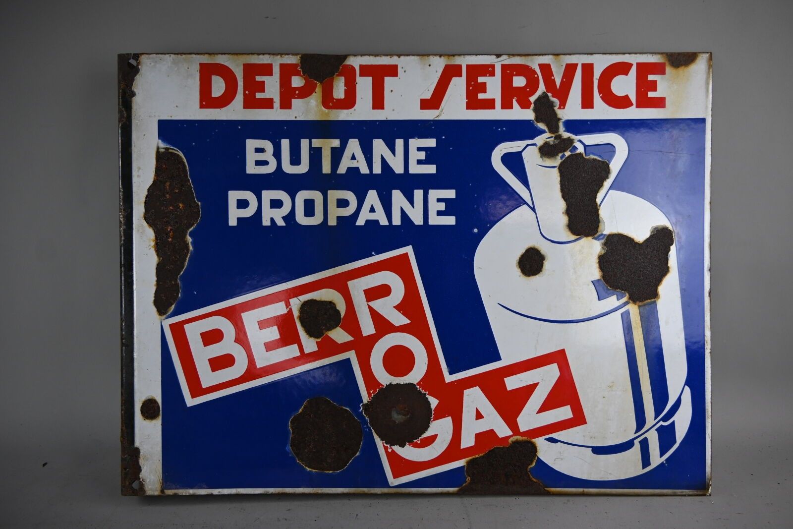 BERROGAZ, Butane Propane. Advertising plate in enamelled sheet metal, rectangular shape, double-sided at right-angles, illustrated with a gas bottle. Significant damage, deformation, chips and scratches. Dimensions: 40 x 54 cm.