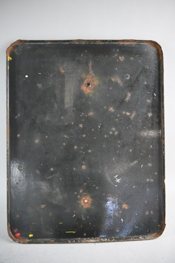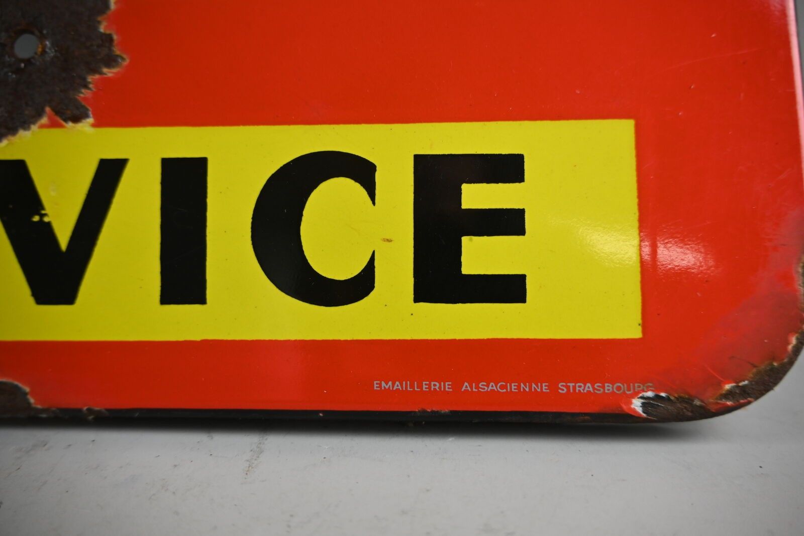 FAR Service. Advertising plate in enamelled sheet metal, rectangular shape with lining. Émaillerie Alsacienne Strasbourg Hoenheim. Significant chips, scratches, perforations, deformations. Dimensions: 48 x 38 cm.
