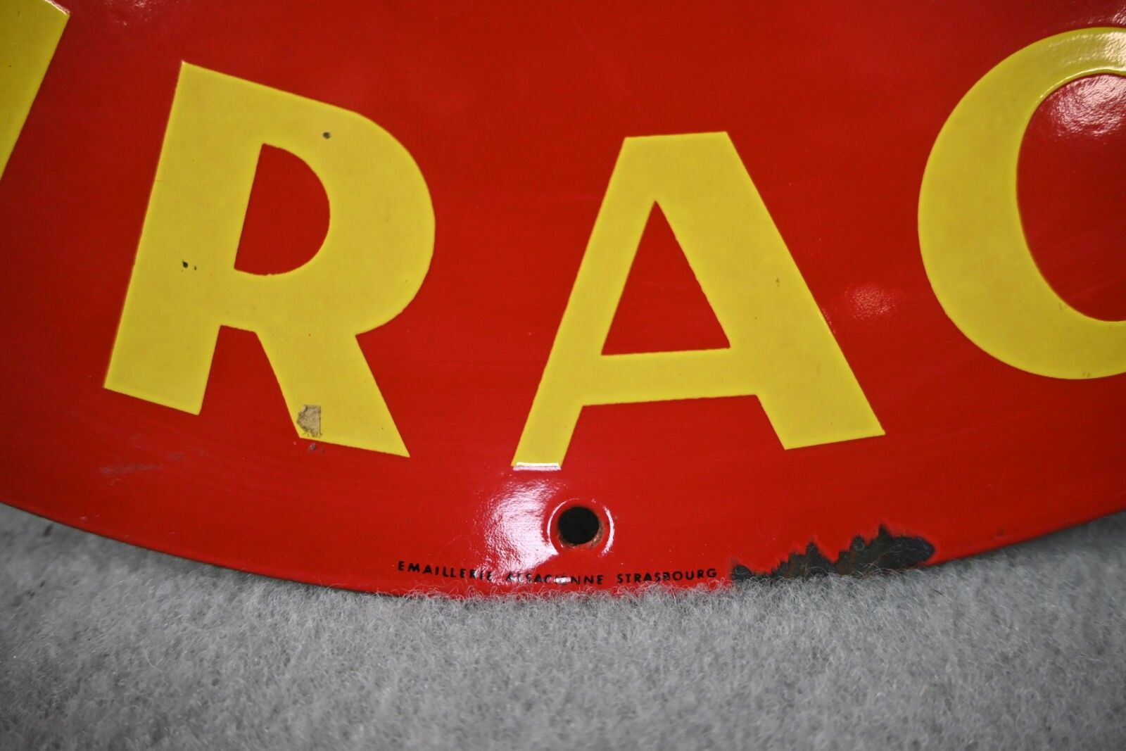 ANTHRACLAIR, "Combustible Défumé Champion", Circular enamelled sheet metal advertising plate, illustrated with an athlete carrying a coal flame. Émaillerie Alsacienne Strasbourg. Chips, scratches. Diameter: 45 cm