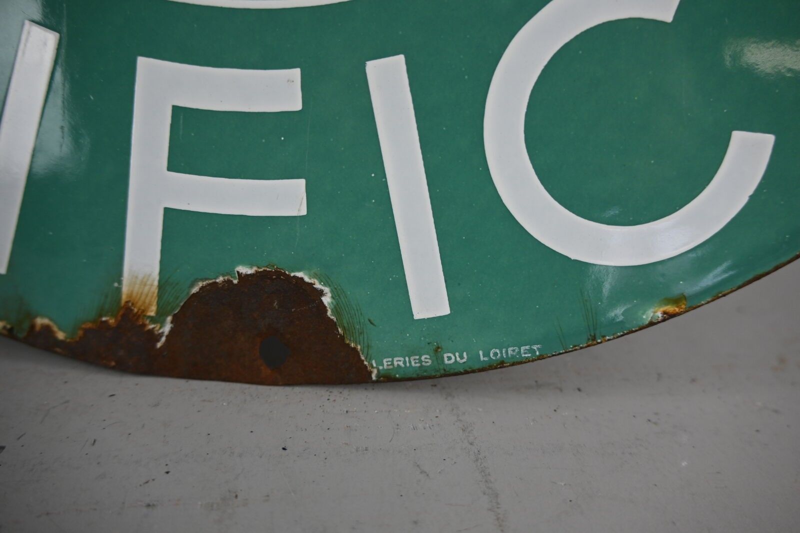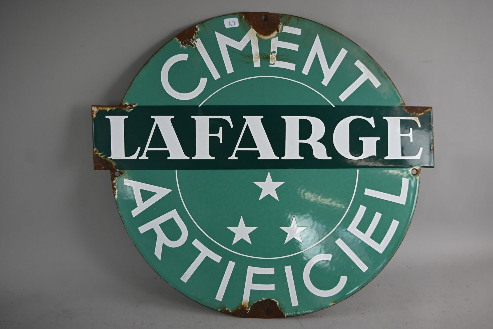 LAFARGE, Artificial cement. Advertising plate in enamelled sheet metal. Emaillerie du Loiret. Chips, scratches, deformations. Dimensions: 41 x 45 cm.