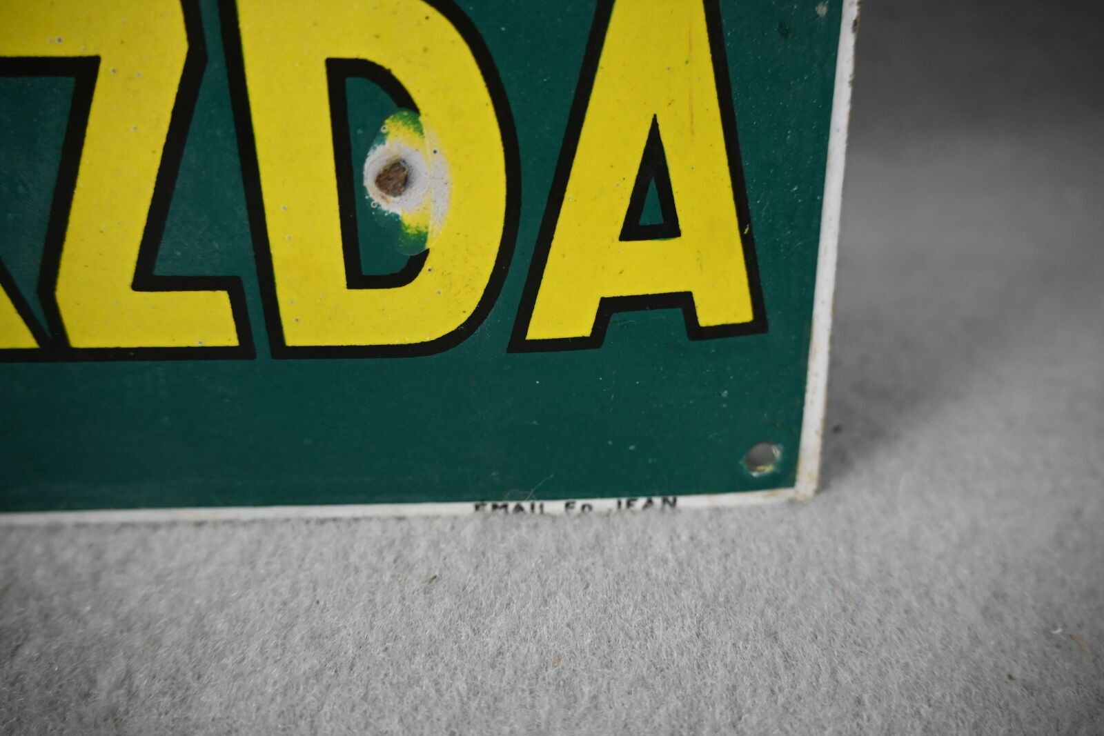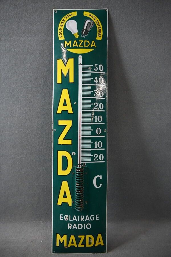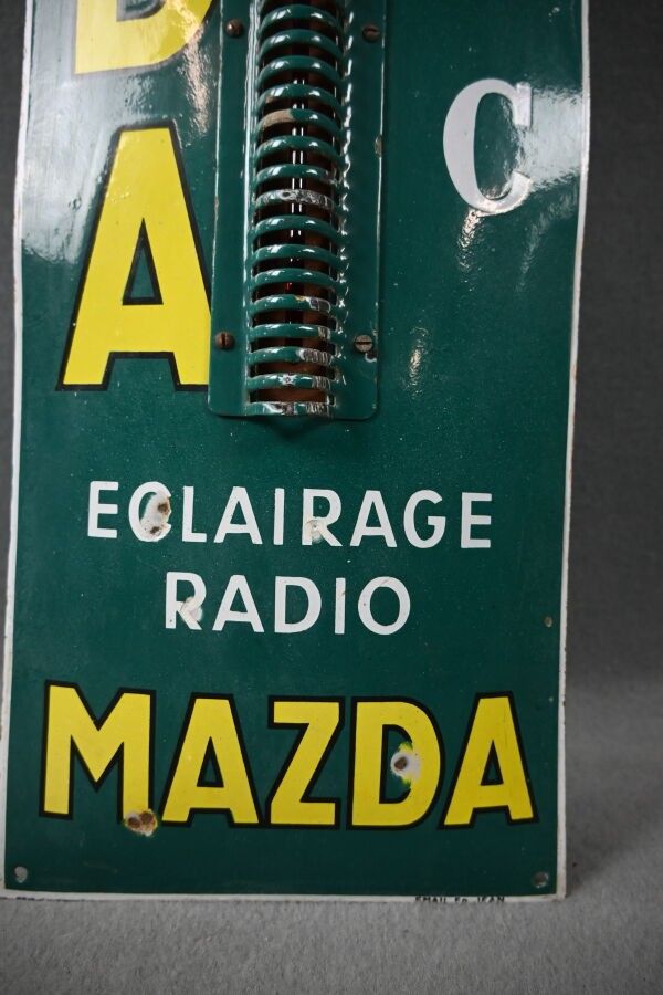 MAZDA, Éclairage Radio, "Pour bien voir.....Bien entendre, Plaque thermomètre publicitaire en tôle émaillée de forme rectangulaire, bombée. Enamelled by ED JEAN. Chips, scratches, tube attached. Dimensions: 110 x 25 cm