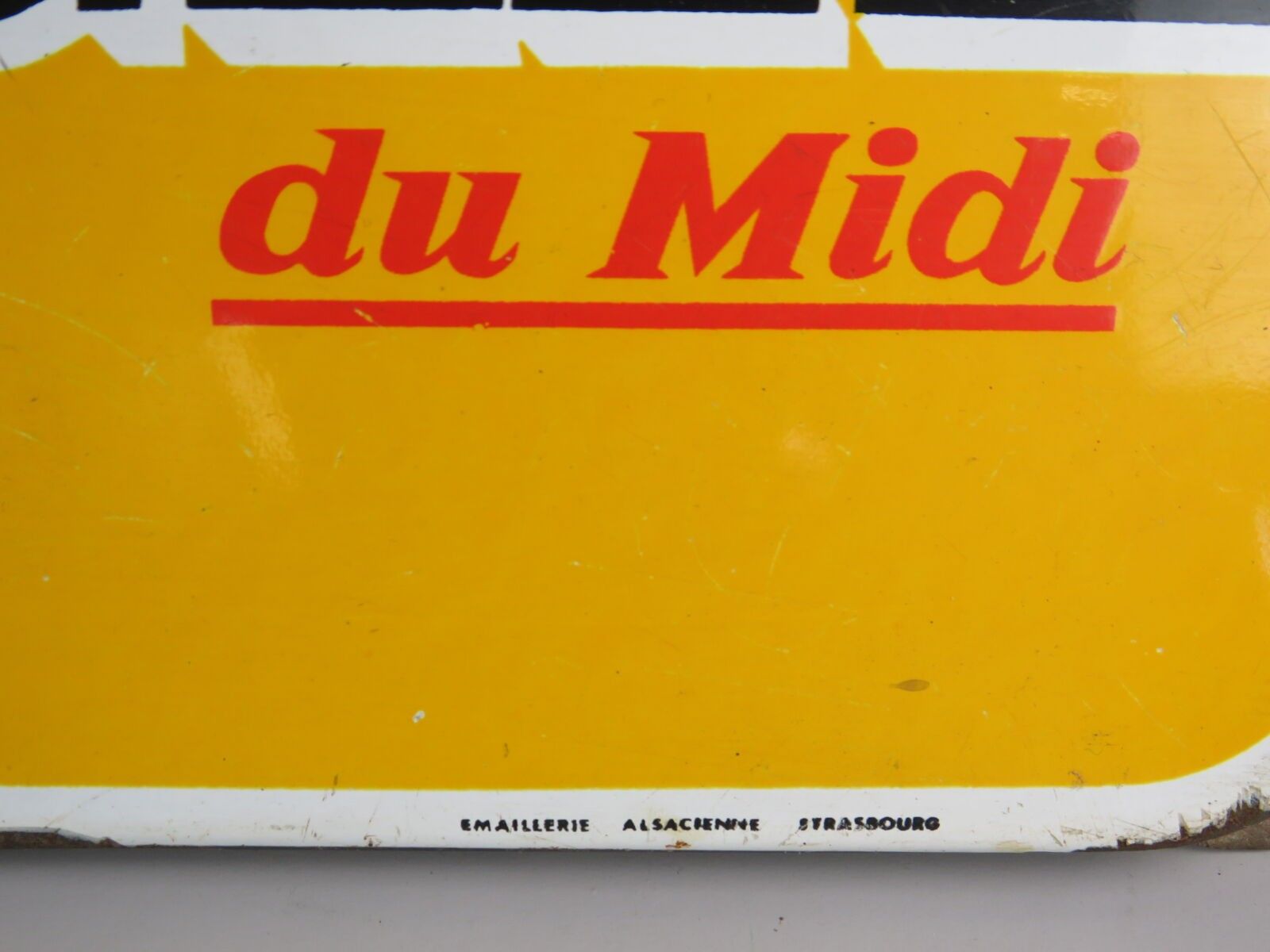 LA DEPECHE du Midi. Advertising plate in enamelled sheet metal, padded with ears. Émaillerie Alsacienne Strasbourg. Chipped enamel, scratches. Dimensions: 23.5 x 64 cm.