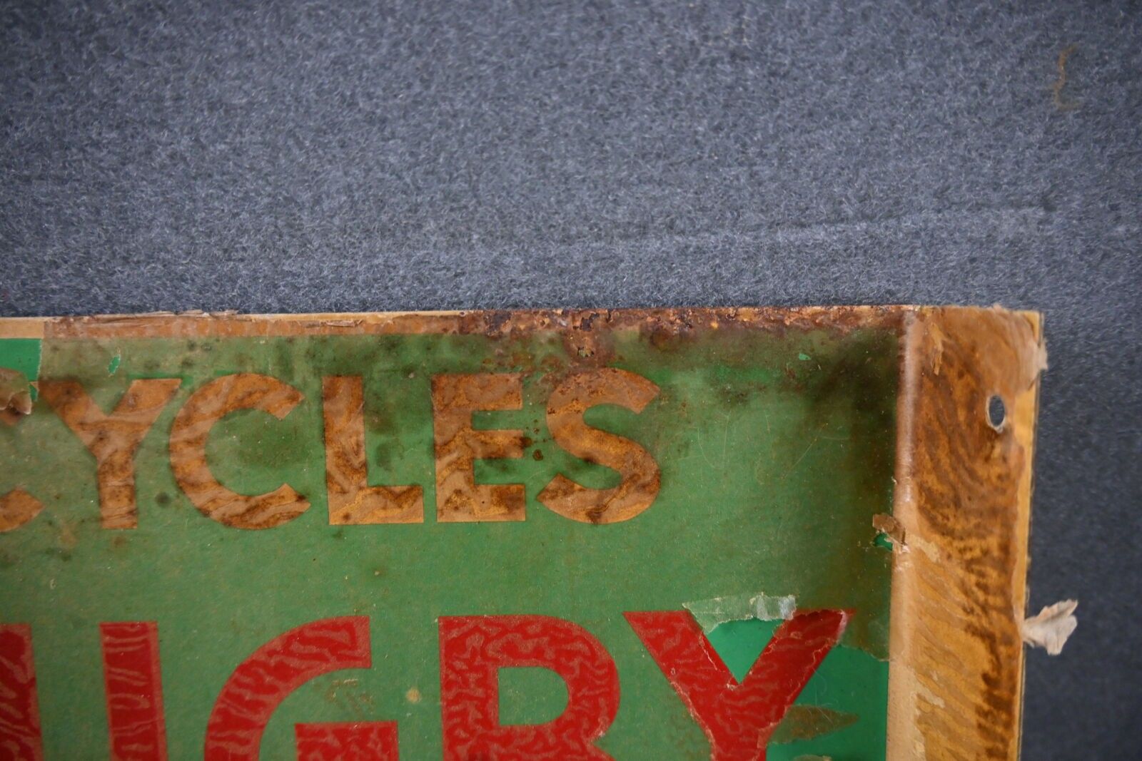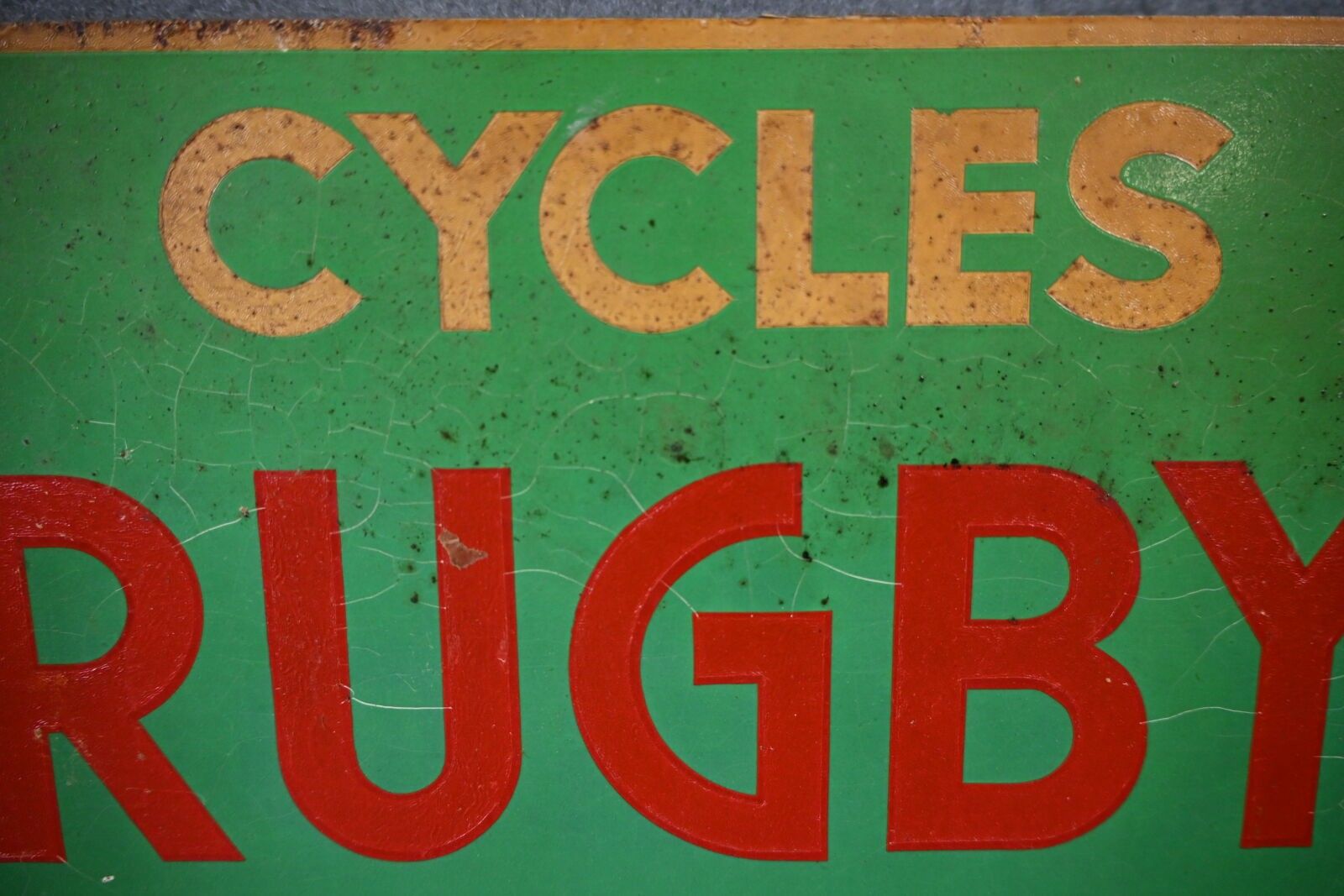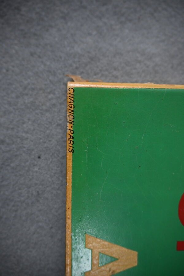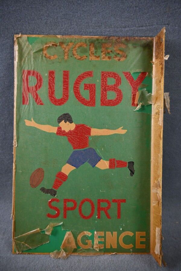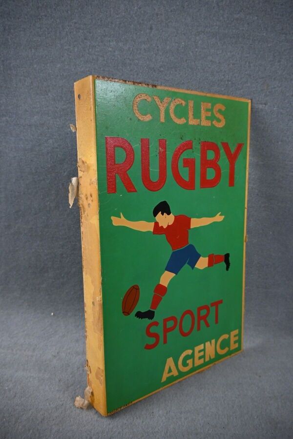 CYCLE RUGBY SPORT AGENCE. Advertising plate in rectangular, double-sided printed sheet metal, at right-angles, illustrated with a rugby player. CHAGNON PARIS. Oxidation and cracks at the top. Dimensions: 45 x 29 cm