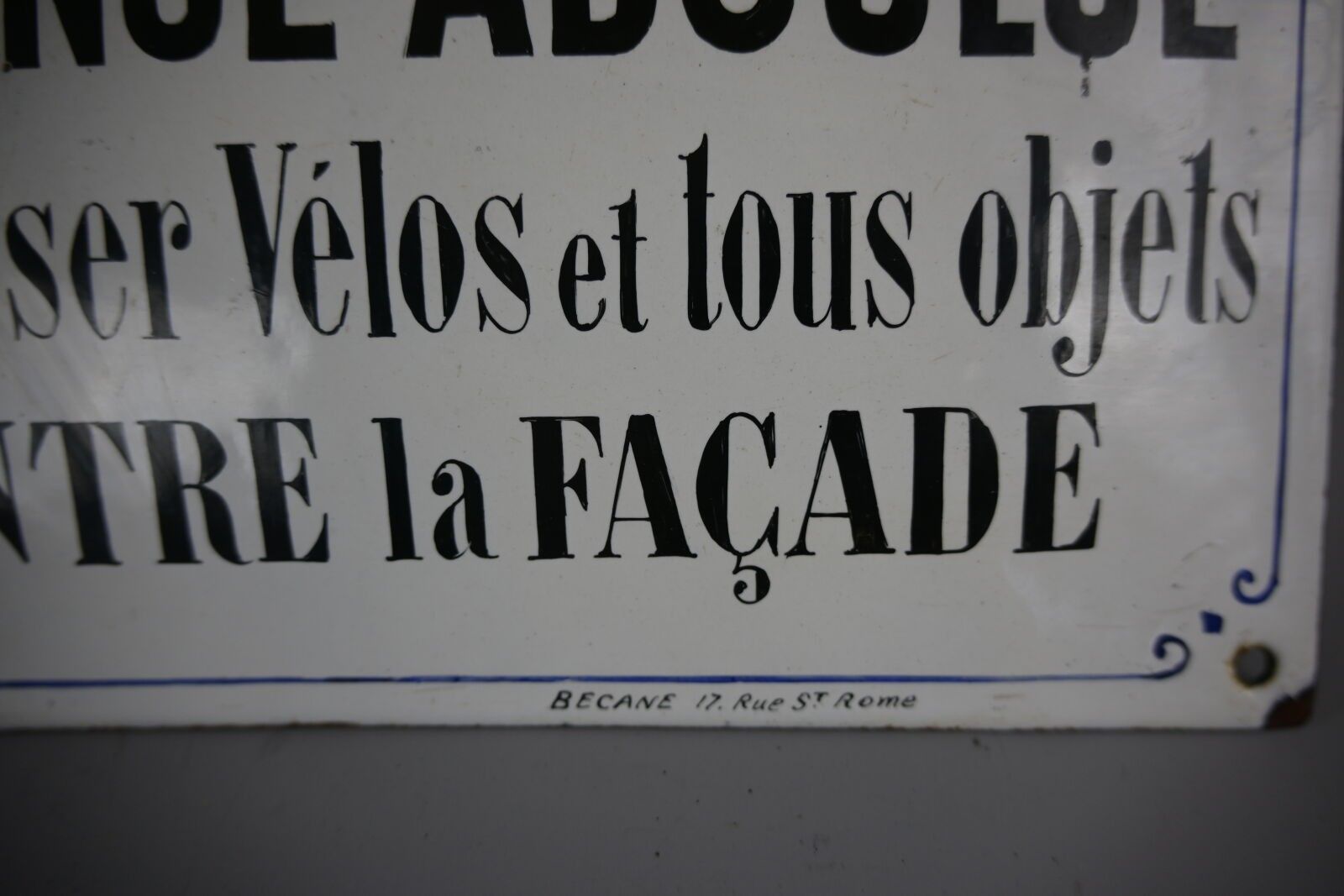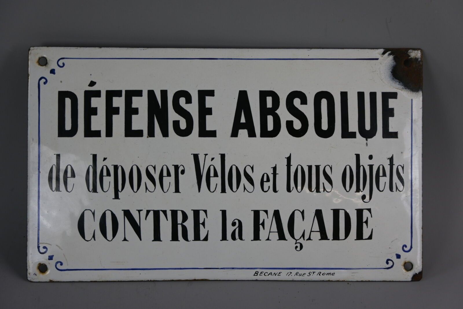 "DEFENSE ABSULUE de déposer Vélos et tous objets CONTRE LA FACADE", enamelled sheet metal plaque in a domed rectangular shape. Émaillerie Becasse, Rue St Rome. Dimensions: 14.5 x 24.8 cm
