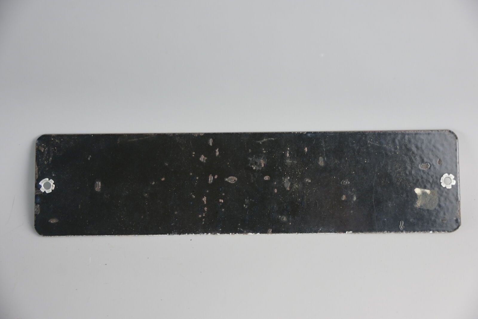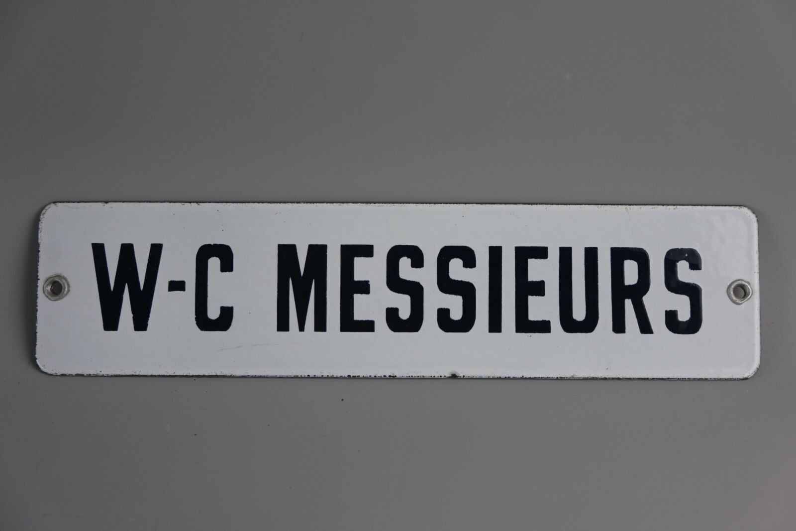 "W-C MESSIEURS", rectangular enamelled sheet metal plaque with black lettering on a white background. Dimensions: 6 x 25 cm