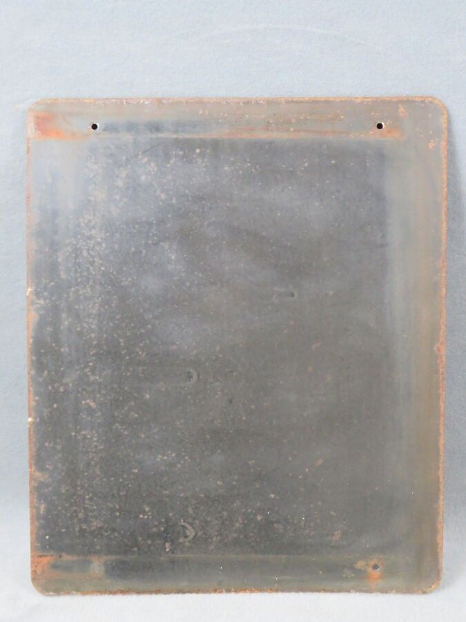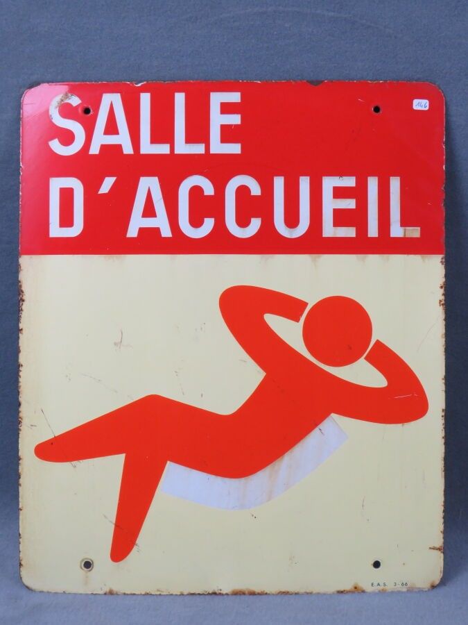 SALLE D'ACCUEIL, rectangular enamelled sheet metal plaque showing a person at rest. EAS (Emaillerie Alsacienne de Strasbourg). Chips, scratches. Dimensions: 60 x 50 cm.