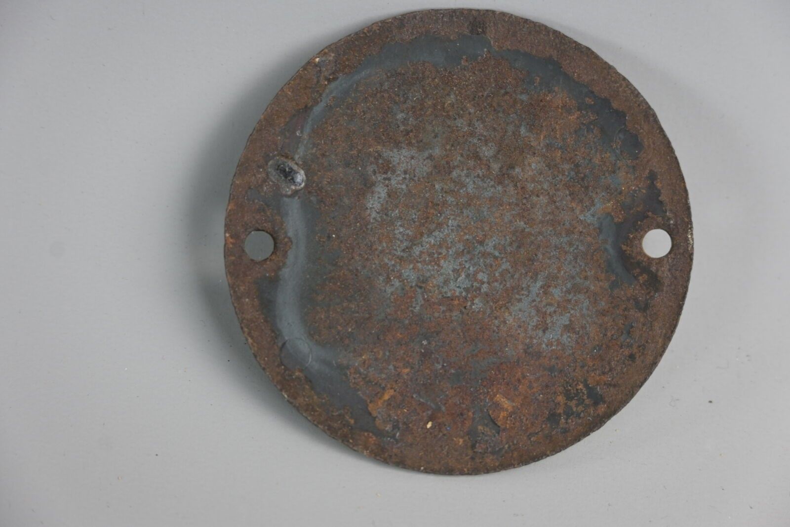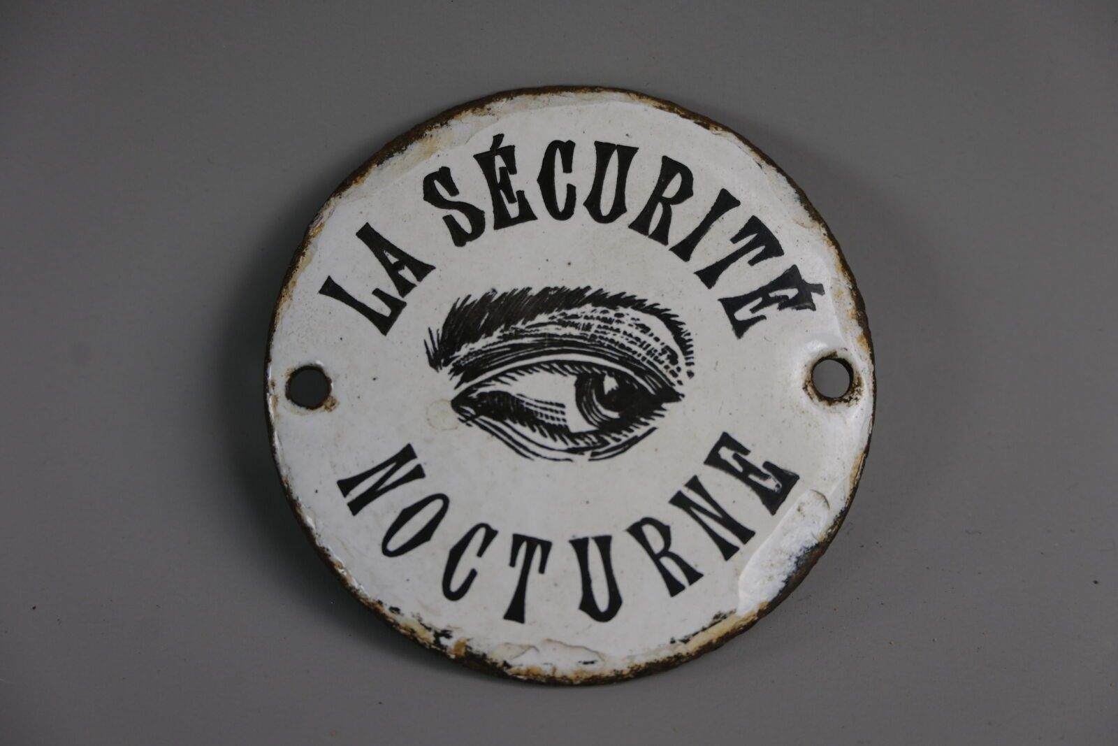 "LA SECURITE NOCTURNE", round enamelled sheet metal plate, illustrated with an eye. Chips on the edge. Diameter: 6 cm
