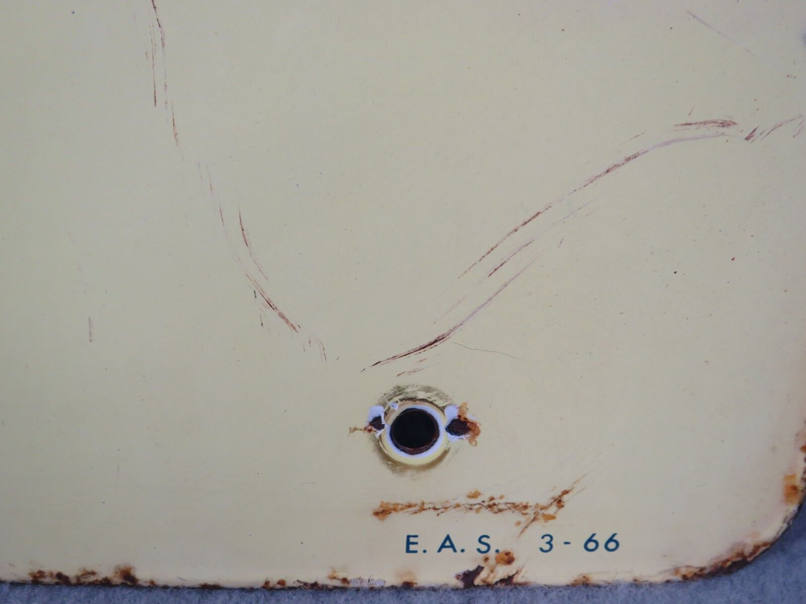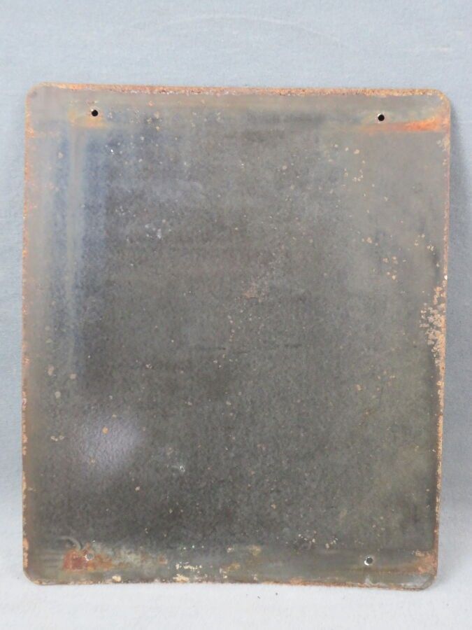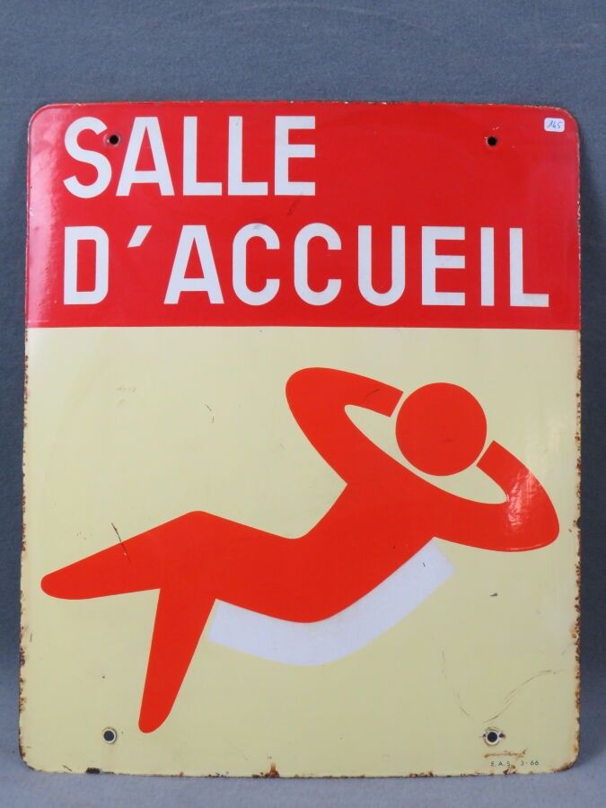 SALLE D'ACCUEIL, rectangular enamelled sheet metal plaque showing a person at rest. EAS (Emaillerie Alsacienne de Strasbourg). Chips, scratches. Dimensions: 60 x 50 cm.