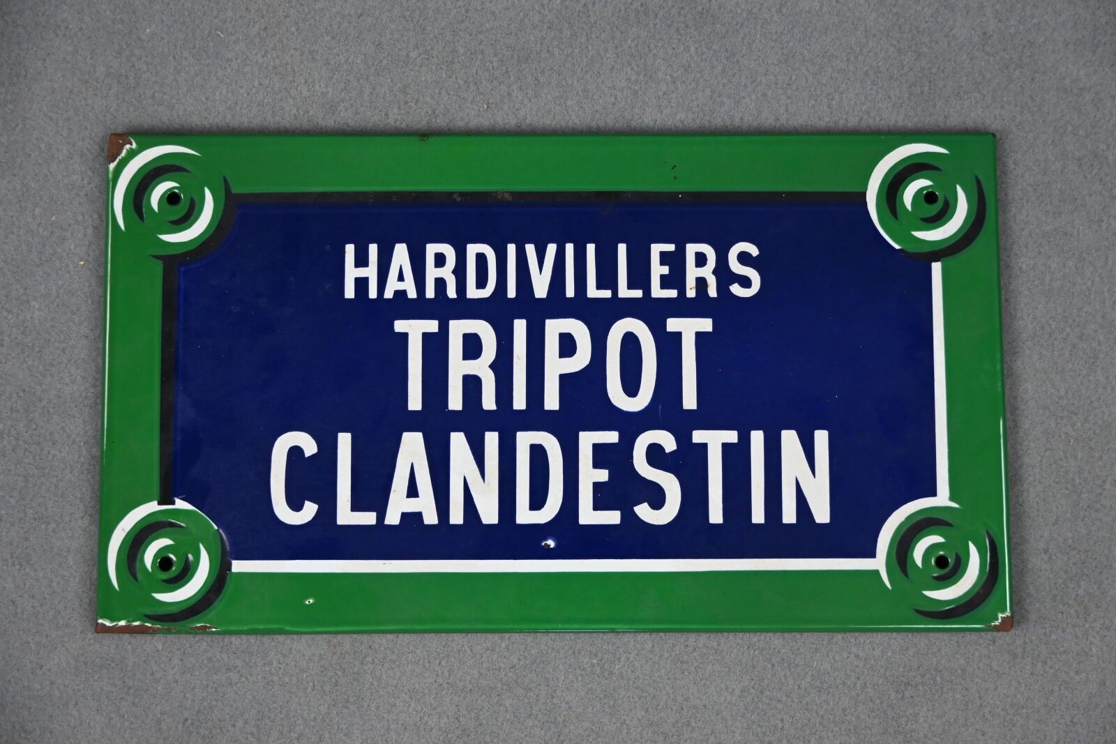 Enamelled sheet metal plate inscribed "Hardivilliers Tripot Clandestin", padded. Dimensions: 25 x 45 cm. Chips.