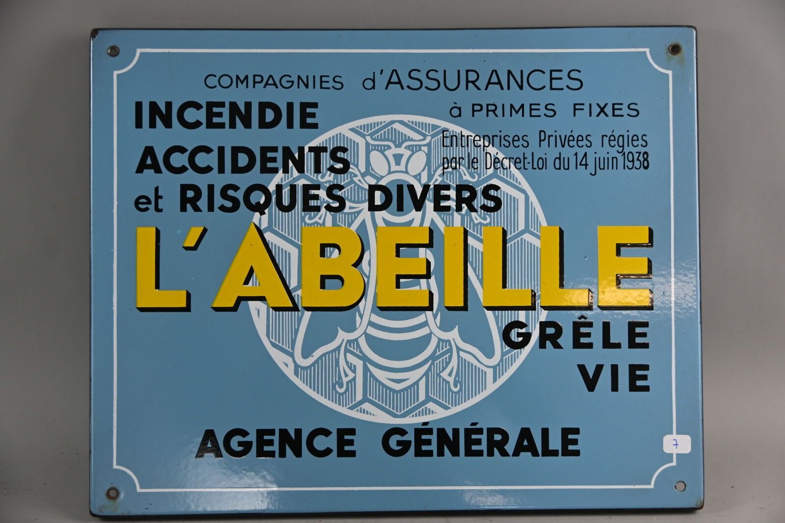 L'ABEILLE, Agence Générale, "Incendie, Accidents et risques divers, grêle, vie. Advertising plate in enamelled sheet metal, rectangular shape with lining. Illustrated with a bee in a medallion. Slight chips and scratches. Dimensions: 32 x 40 cm.