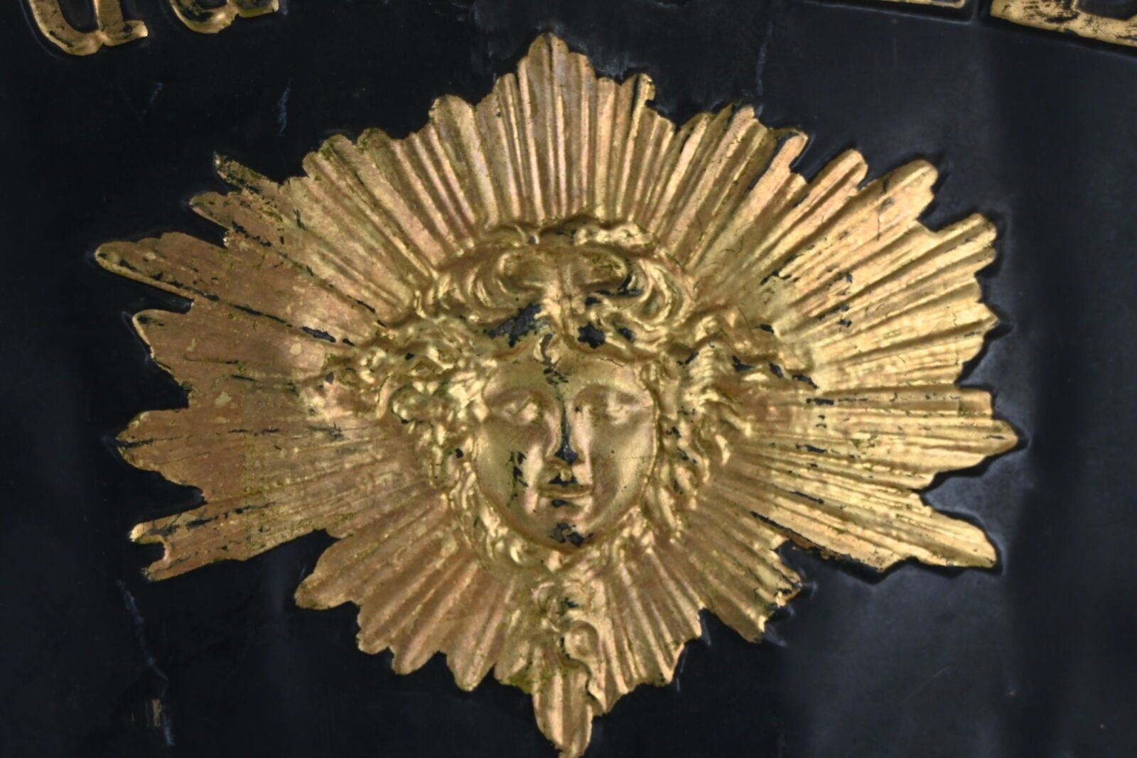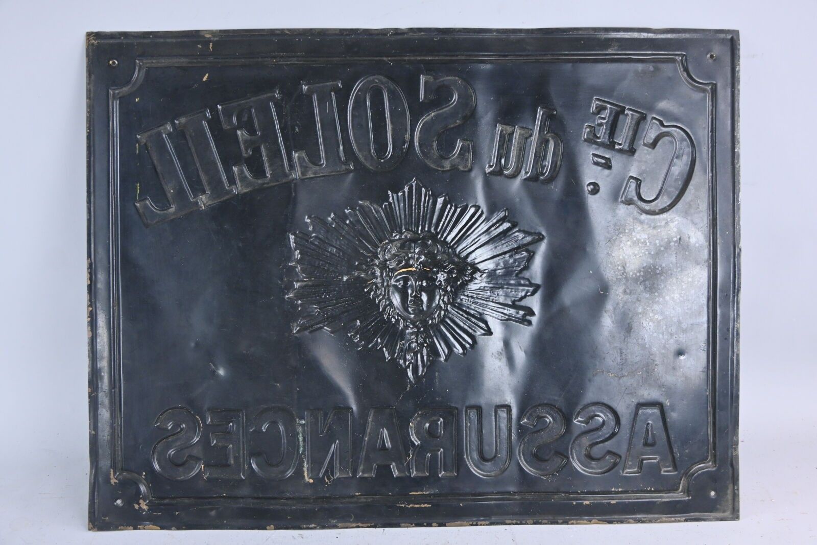COMPAGNIE DU SOLEIL INSURANCE, Embossed lithographed sheet metal advertising plate illustrated with a sun. Missing paint, deformations. Dimensions: 39 x 50.5 cm.