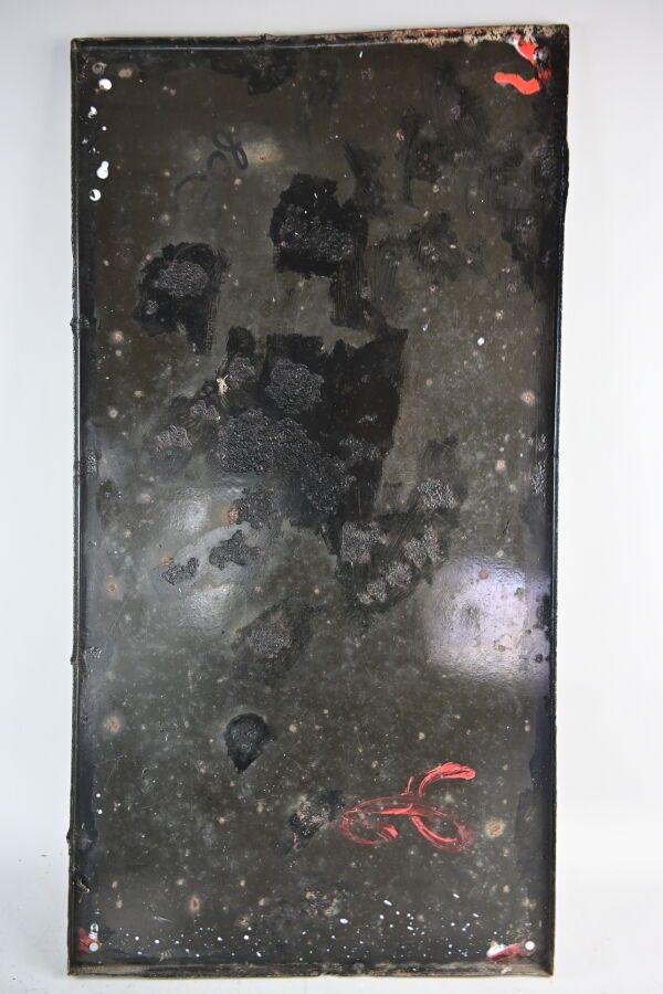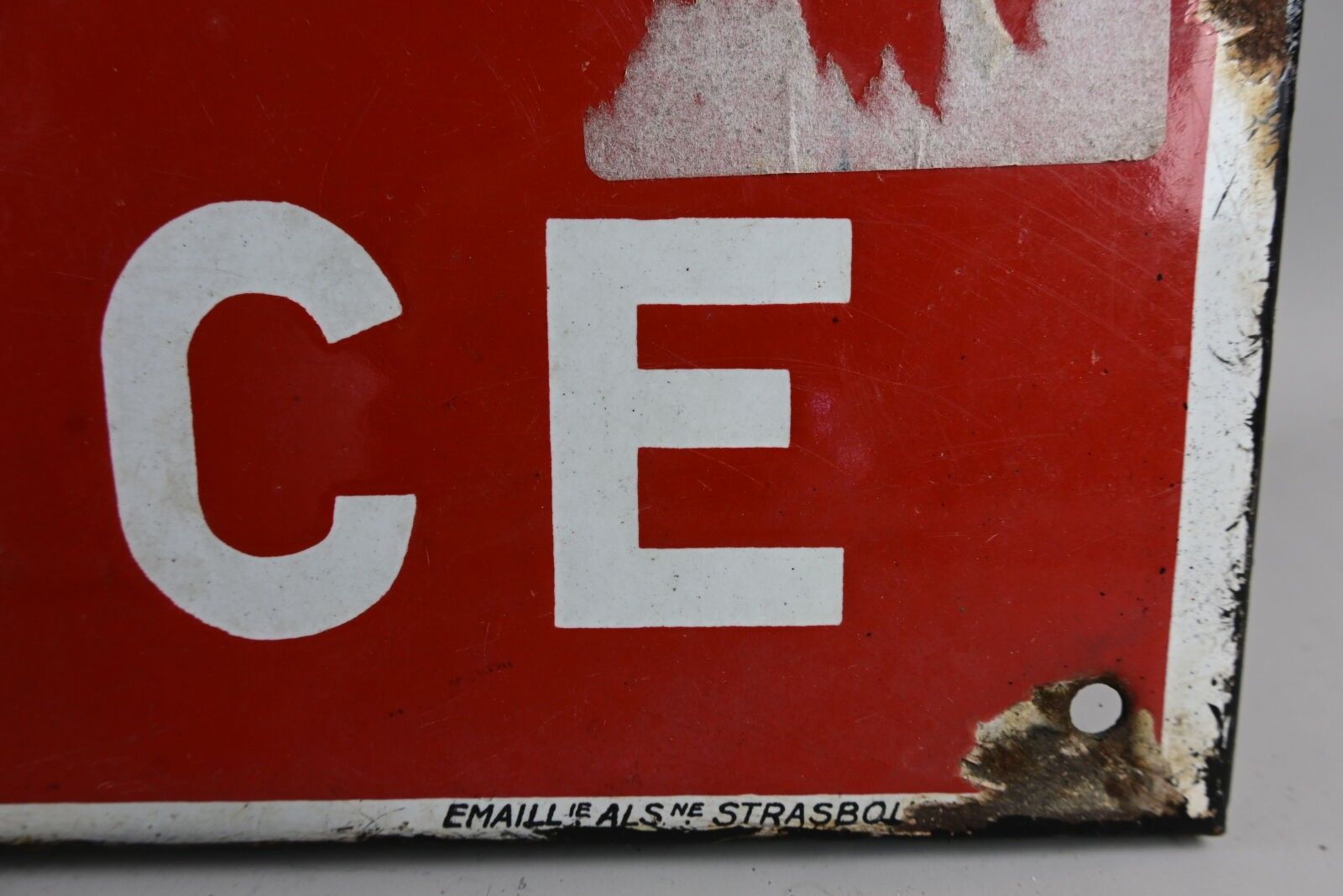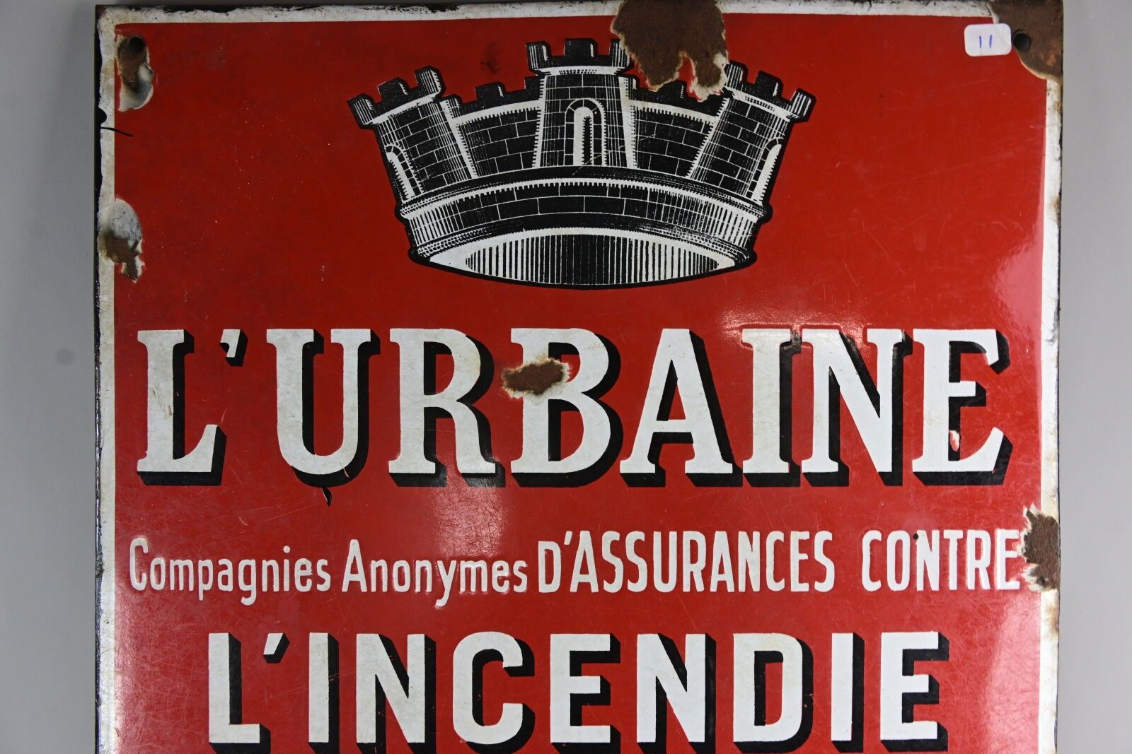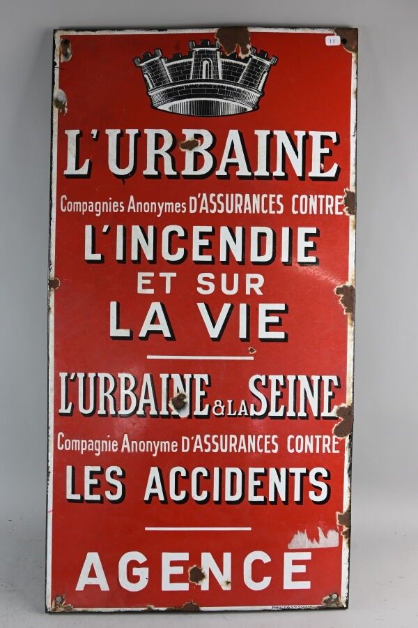 L'URBAINE, Compagnie anonyme d'assurances contre l'incendie et sur la vie. Advertising plate in enamelled sheet metal, rectangular shape, padded, with white lettering overlaid with black on a red background. Emaillerie Alsacienne Strasbourg. Chips and scratches. Dimensions: 73 x 38 cm.