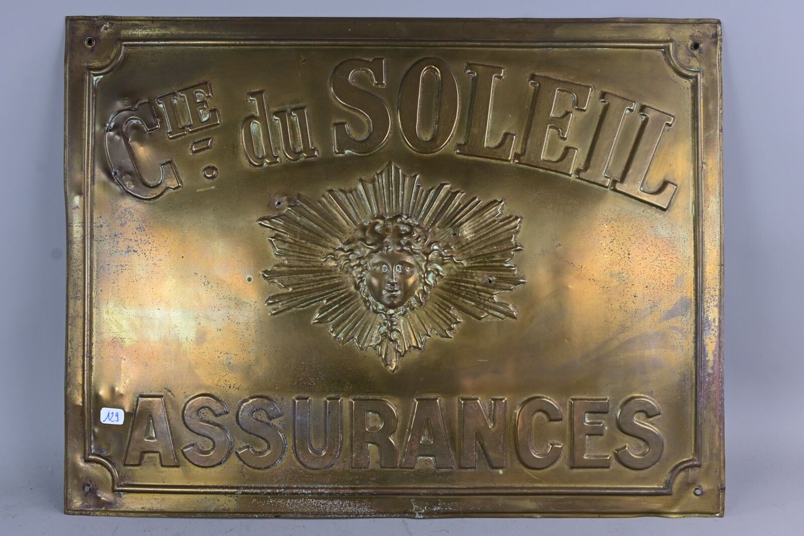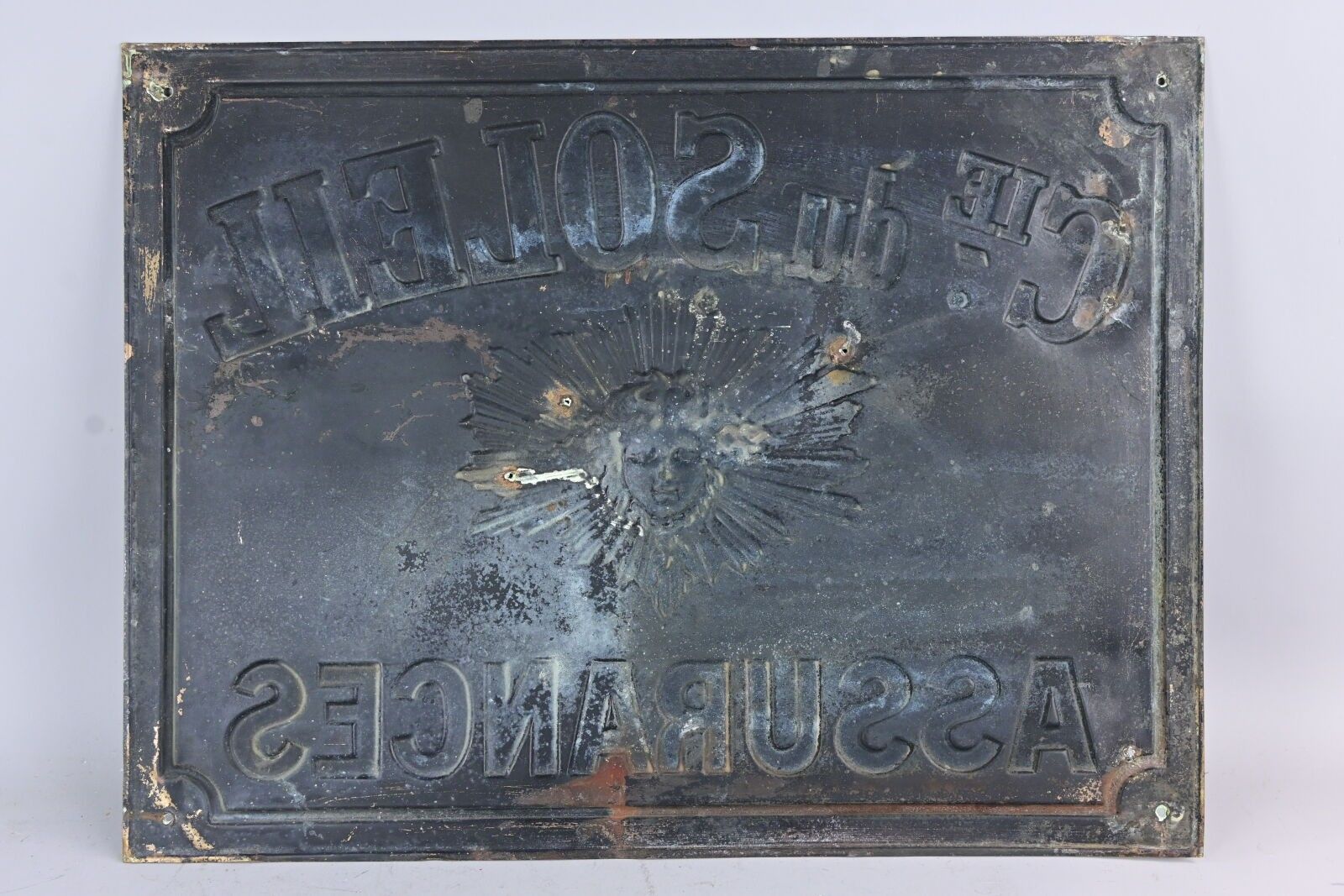 COMPAGNIE DU SOLEIL Insurance. Advertising plate in rectangular sheet metal with embossed lettering and sun decoration. Perforations, deformations. Dimensions: 38 x 50 cm.