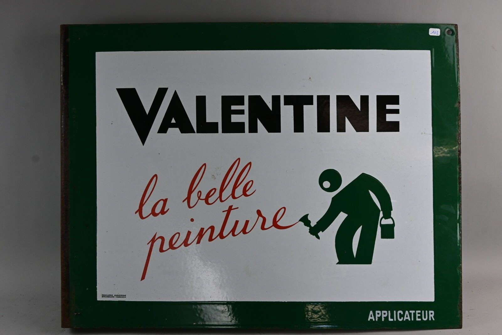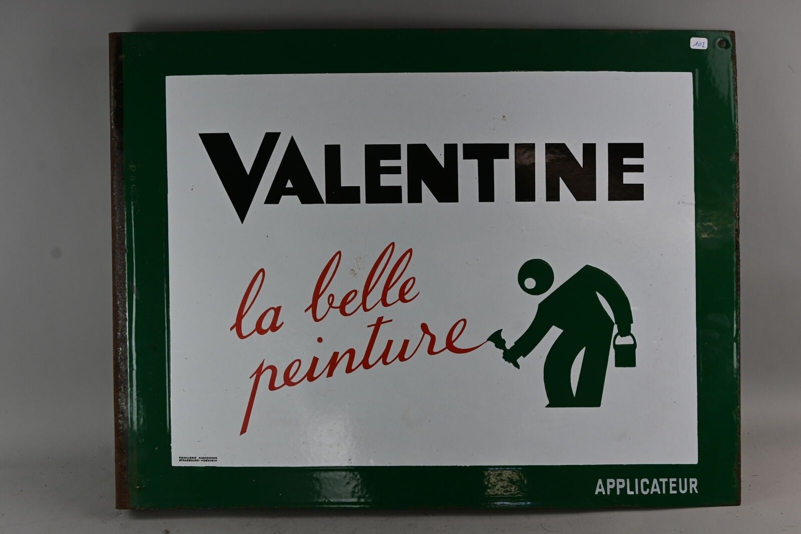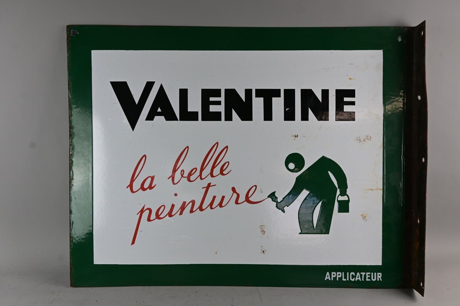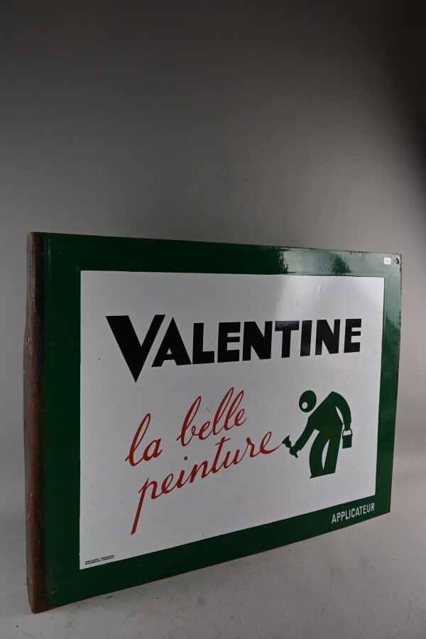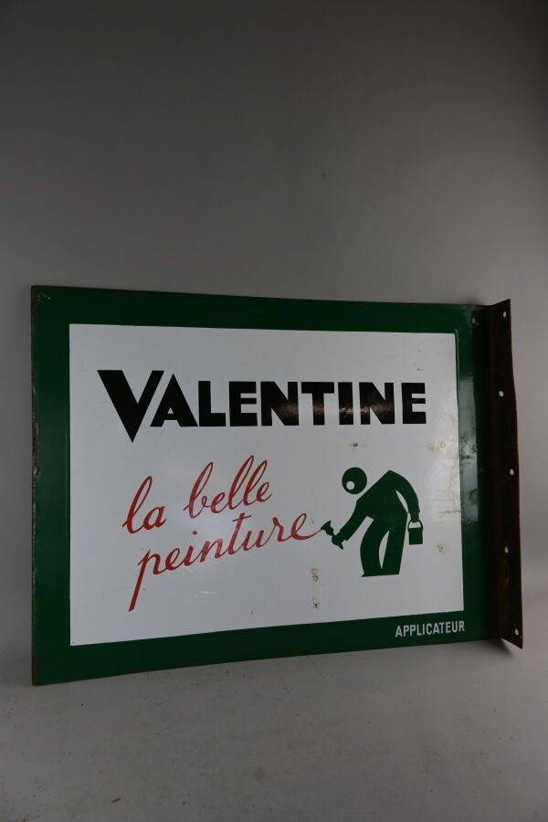 VALENTINE, "La Belle Peinture", Advertising plate in enamelled sheet metal, rectangular shape, double-sided at right-angles. Émaillerie Alsacienne Strasbourg Hoenheim. Chips, scratches. Dimensions: 49.5 x 65.5 cm.