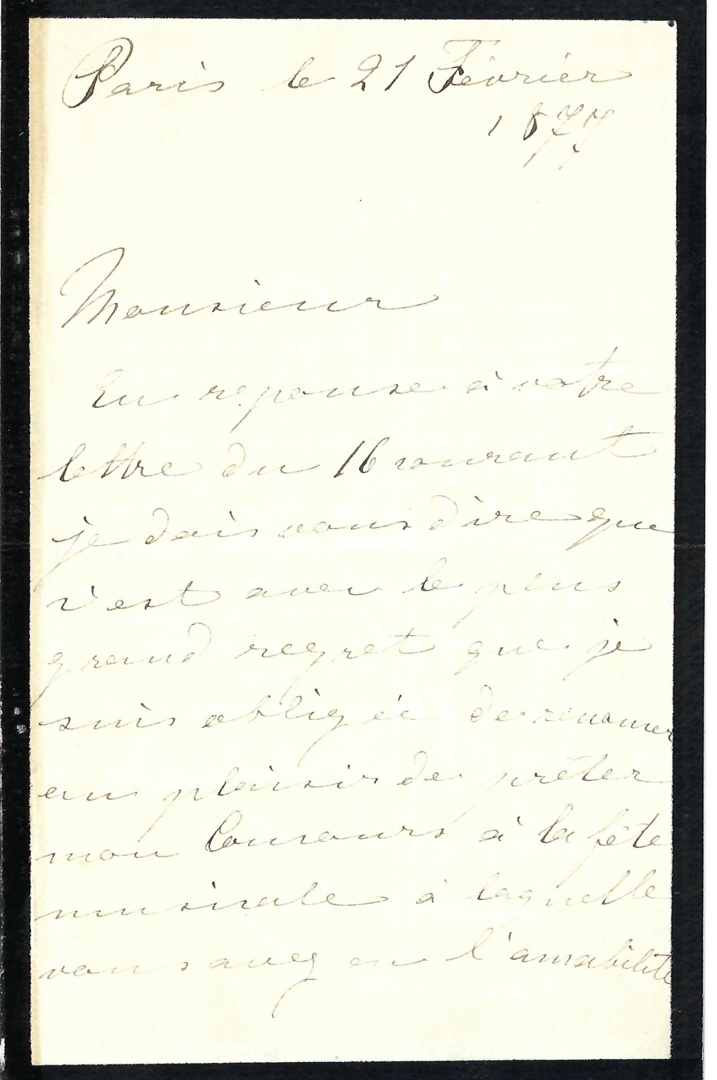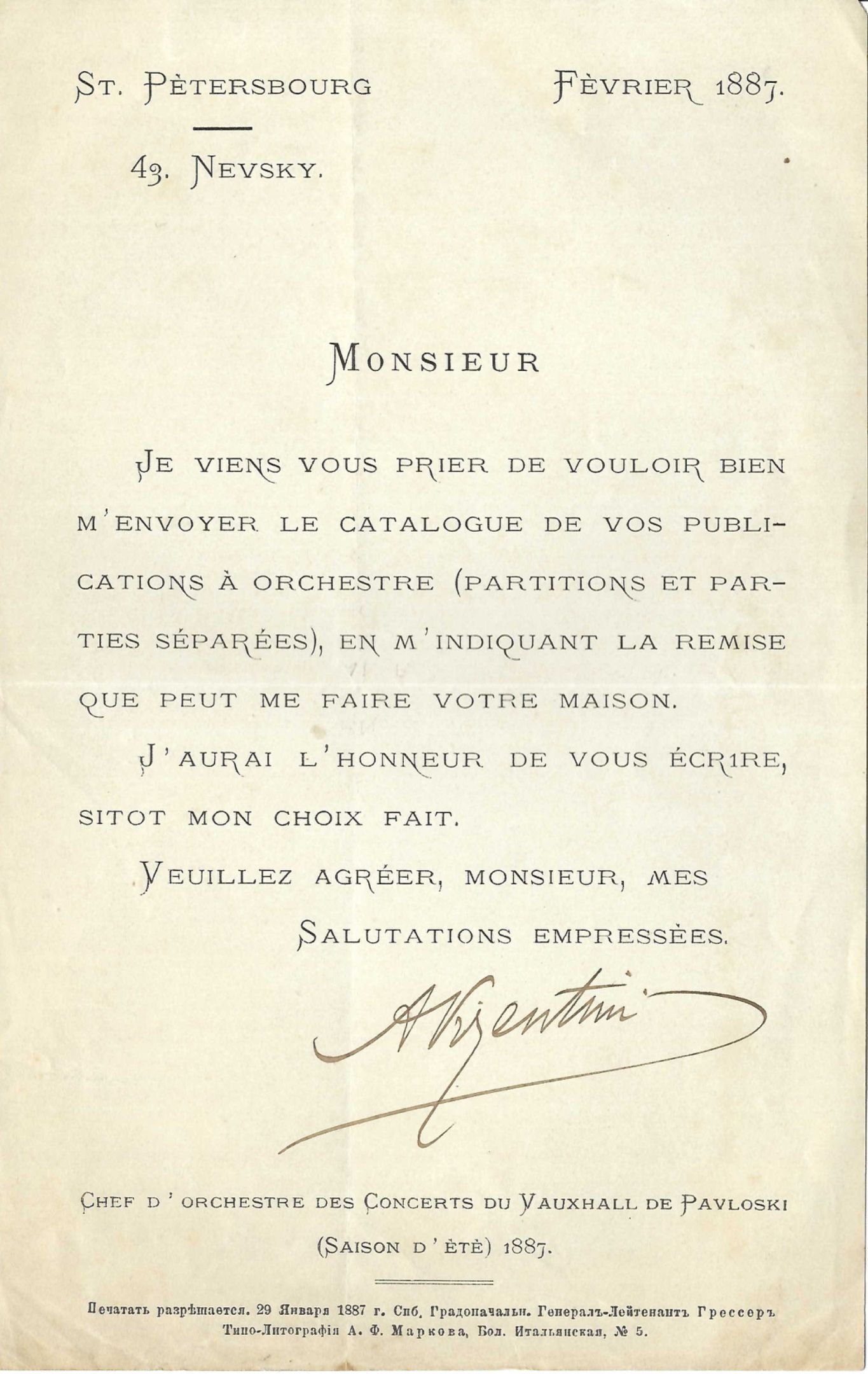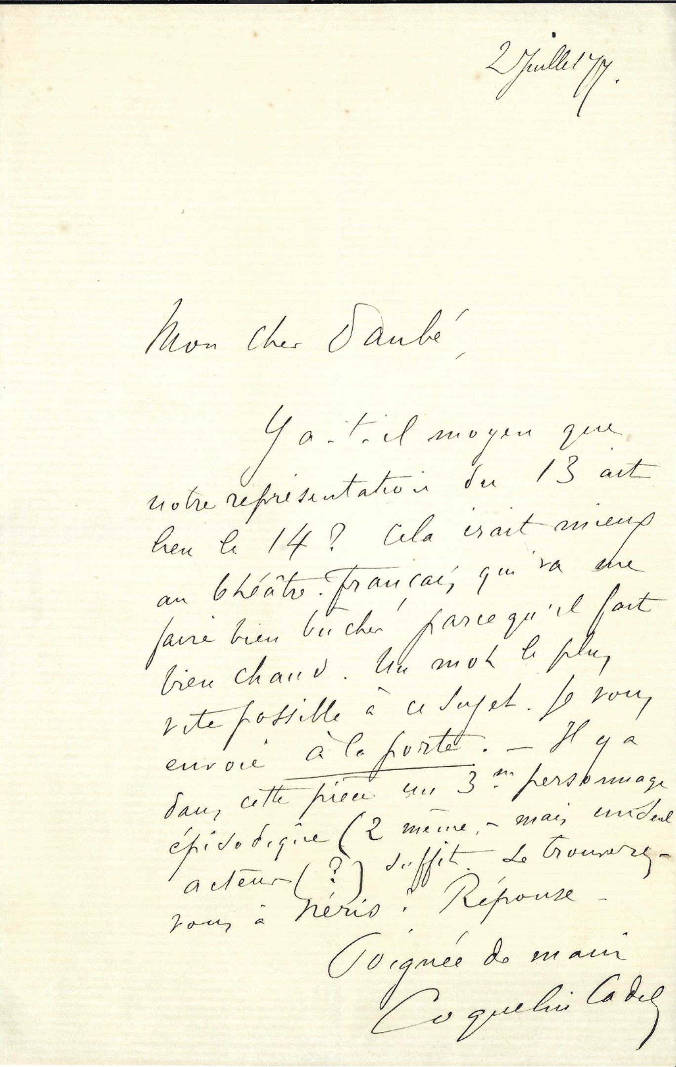 An interesting collection of letters from foreign artists who performed in Russia at different times. It reflects the unique spirit of openness of the Russian theatre towards foreign singers and actors, the wide range of opportunities open to them and the importance of international contacts for the development of the world classical stage. SIX LAS and one typescript letter signed by: actor Coquelin cadet; soprano G. Krauss; basso L. Lablanche; soprano C. Novello; actress Réjane; pianist, composer and singer Pauline Viardo; conductor A. Vizentini. In French, various formats, 1855-1887.