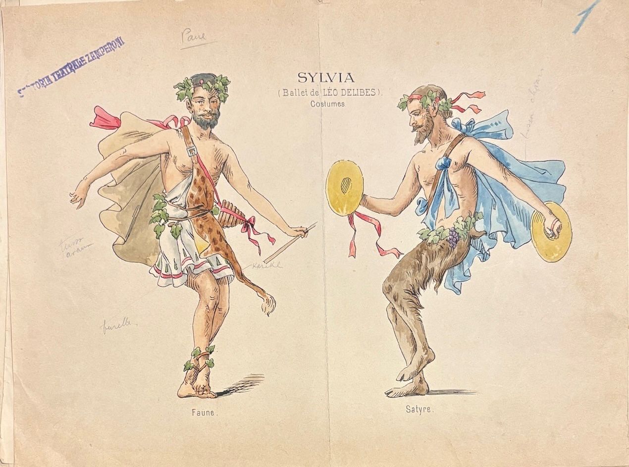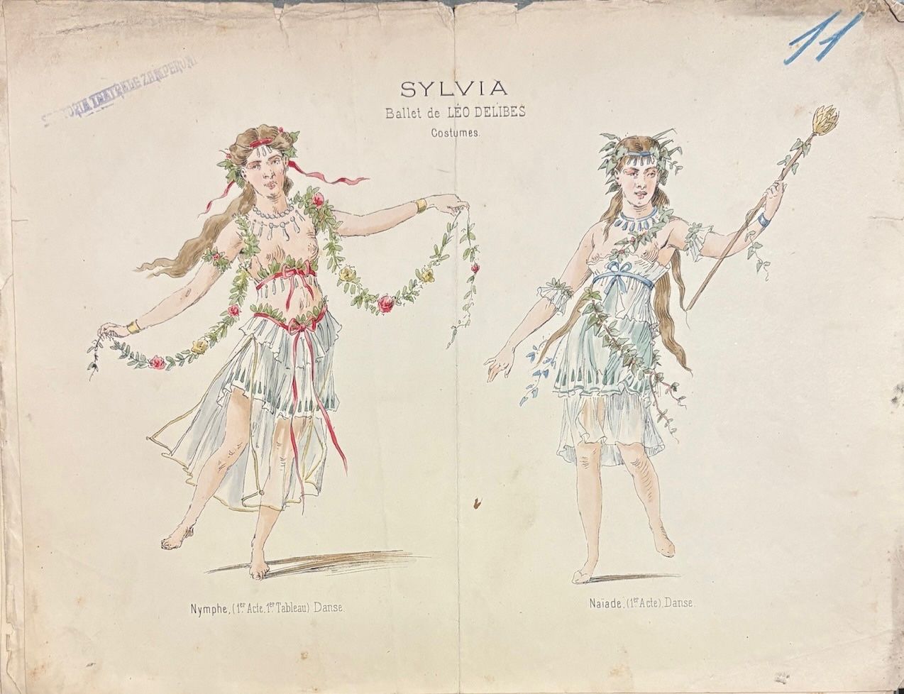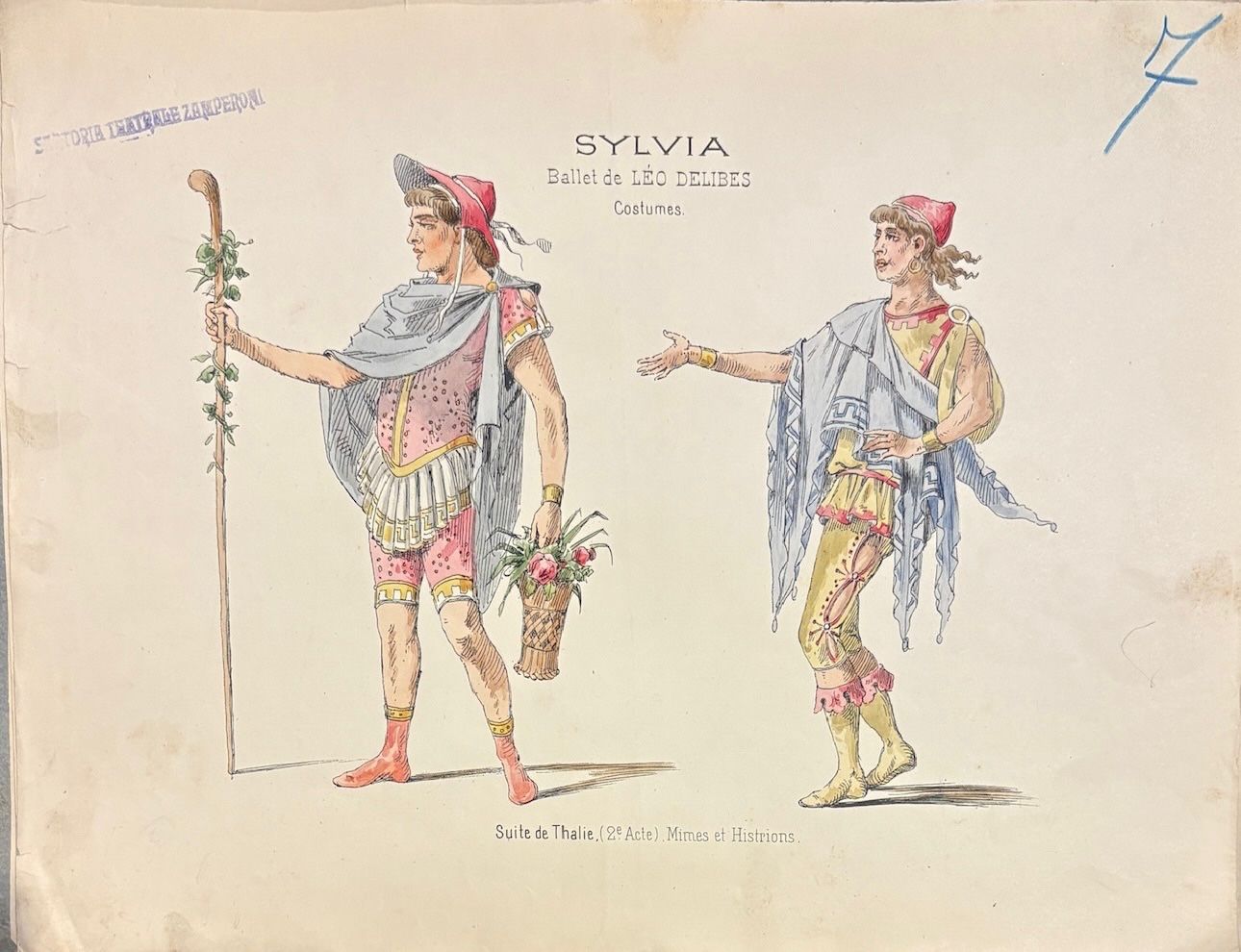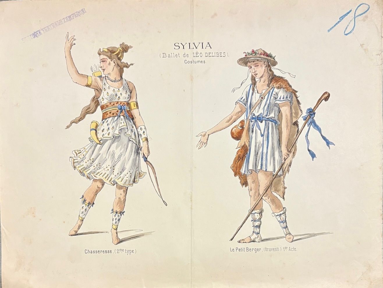 SET of eighteen plates representing the costumes for "Sylvia" by Léo Delibes. Printed on paper, enhanced with watercolour. Plates numbered from 1 to 18 by hand, stamped "Sentoria theatrale Zamperoni" on each plate, 26.5 x 35 cm, A.B.E. (soiling, slight tears at edges). The plates are presented in a sleeve annotated "Cartelle №9".