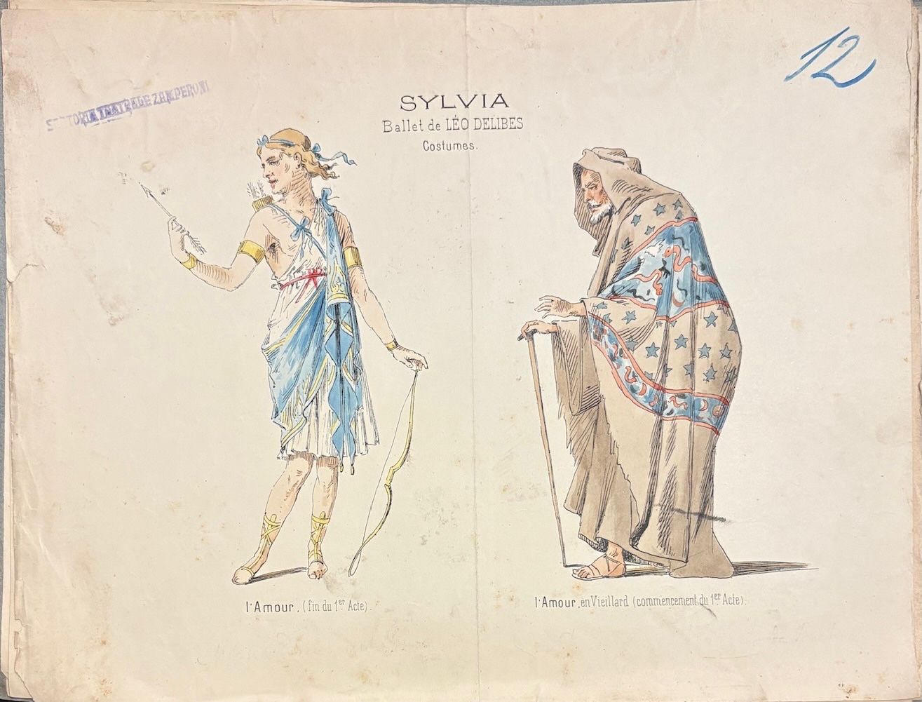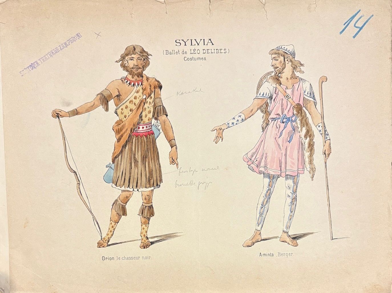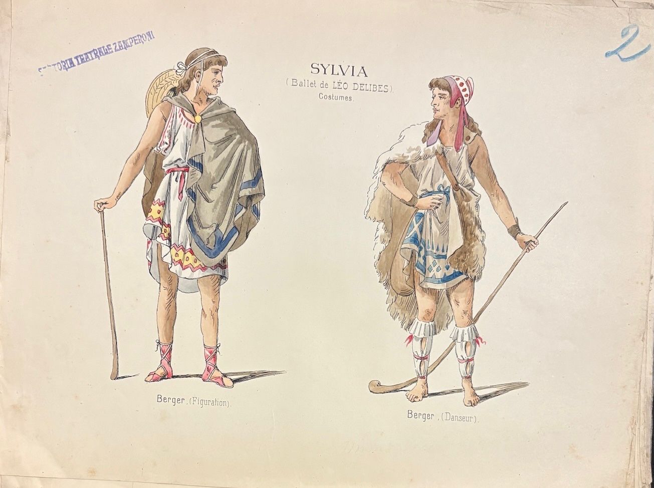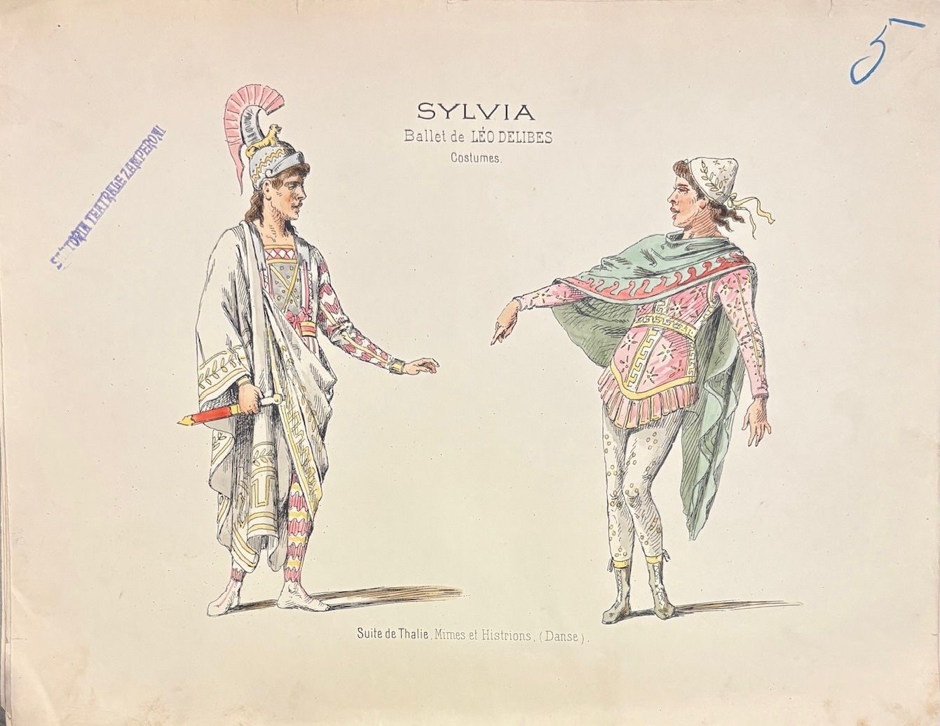 SET of eighteen plates representing the costumes for "Sylvia" by Léo Delibes. Printed on paper, enhanced with watercolour. Plates numbered from 1 to 18 by hand, stamped "Sentoria theatrale Zamperoni" on each plate, 26.5 x 35 cm, A.B.E. (soiling, slight tears at edges). The plates are presented in a sleeve annotated "Cartelle №9".