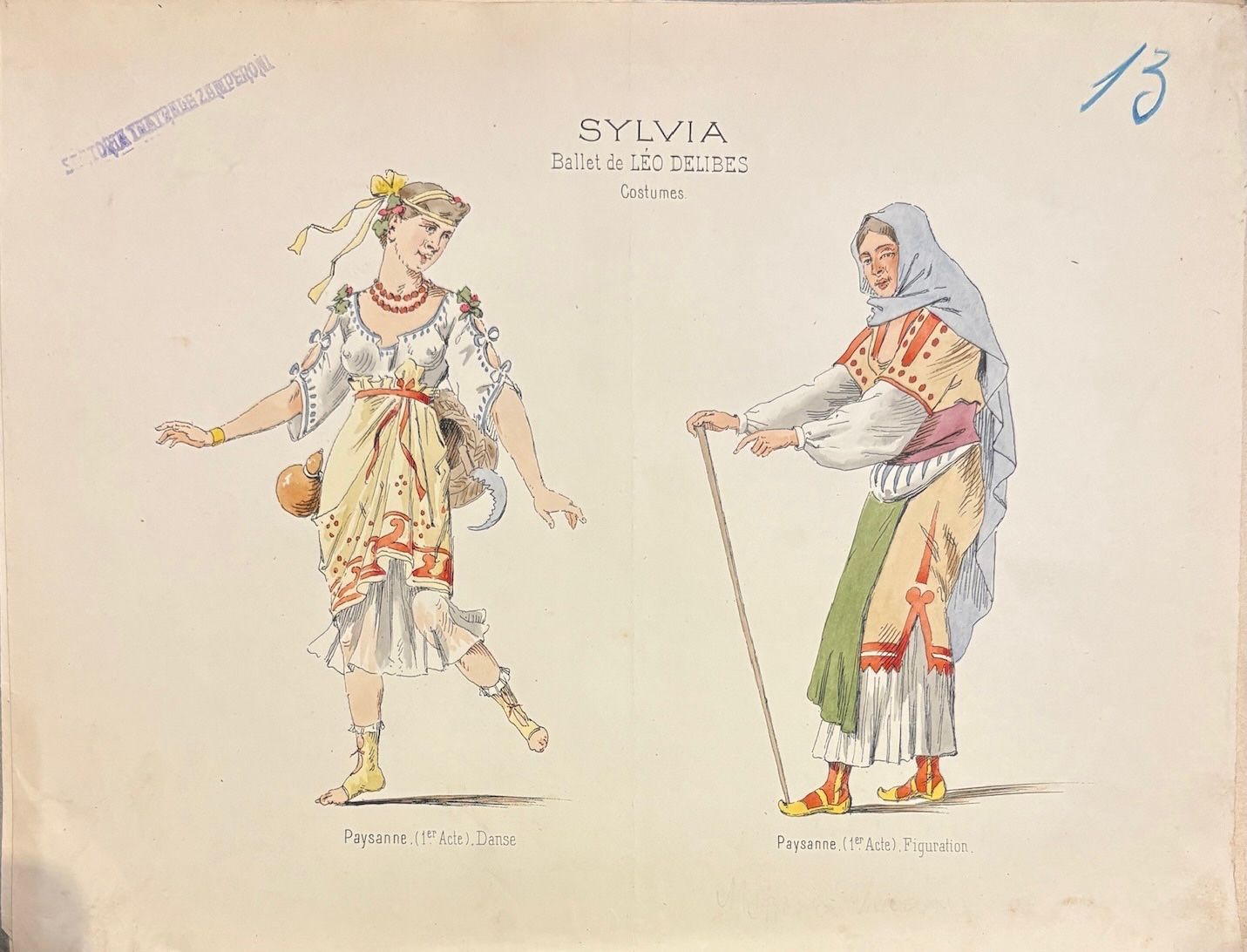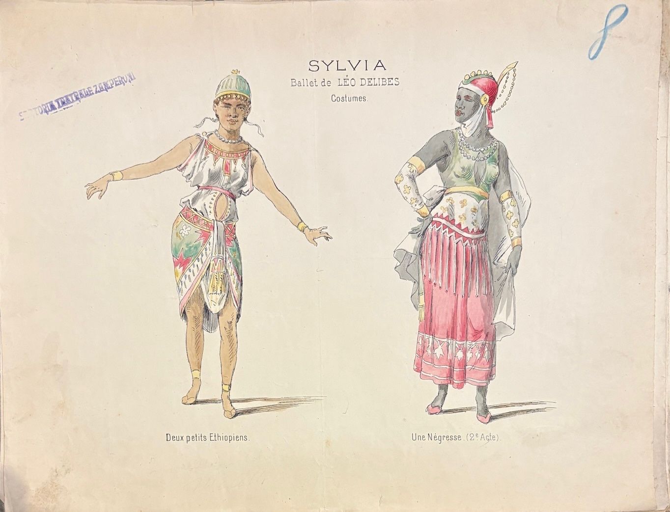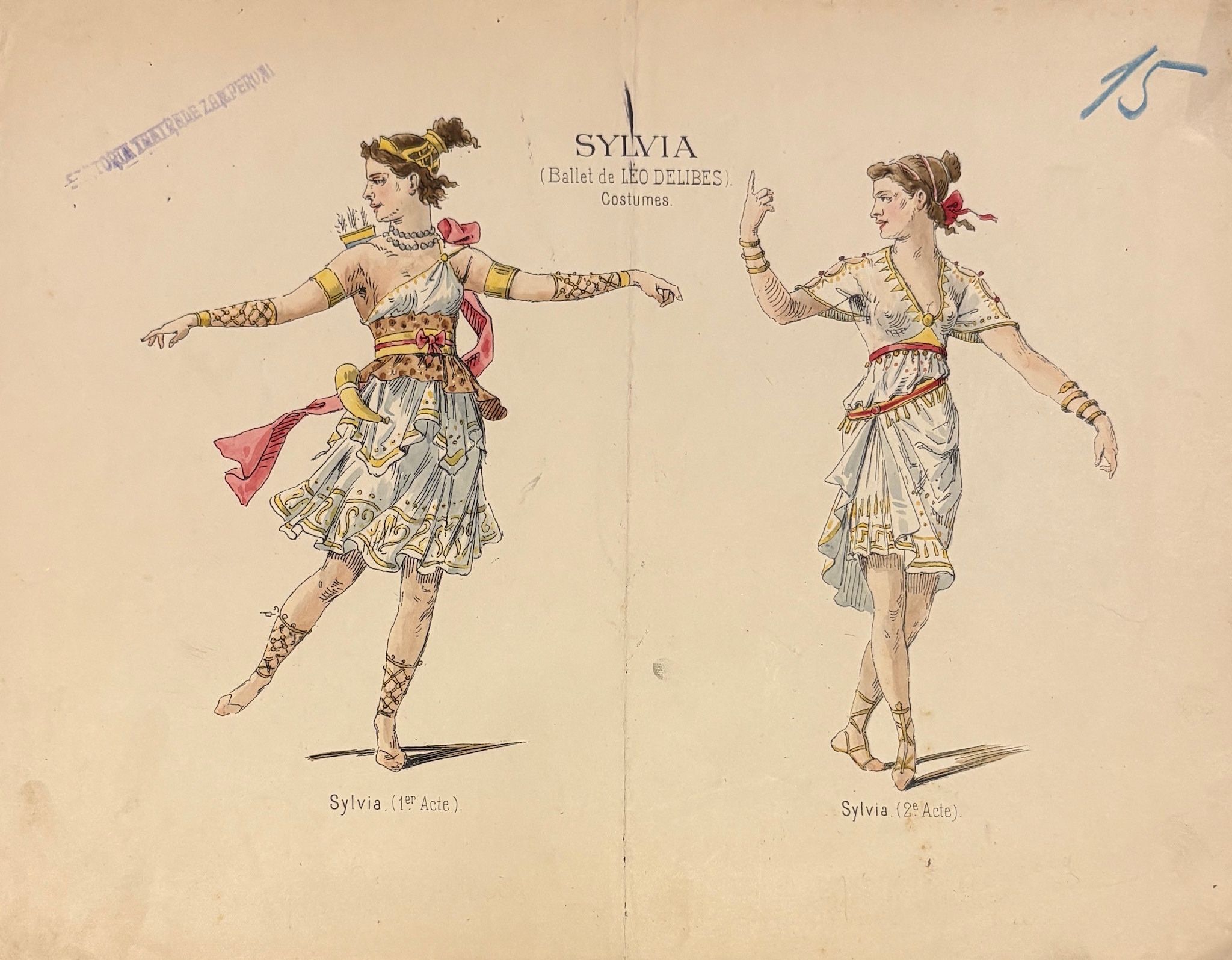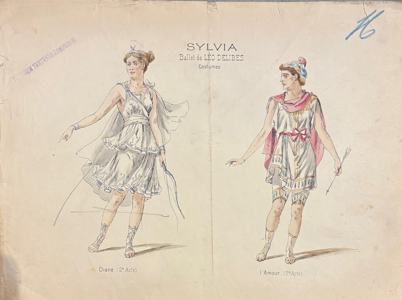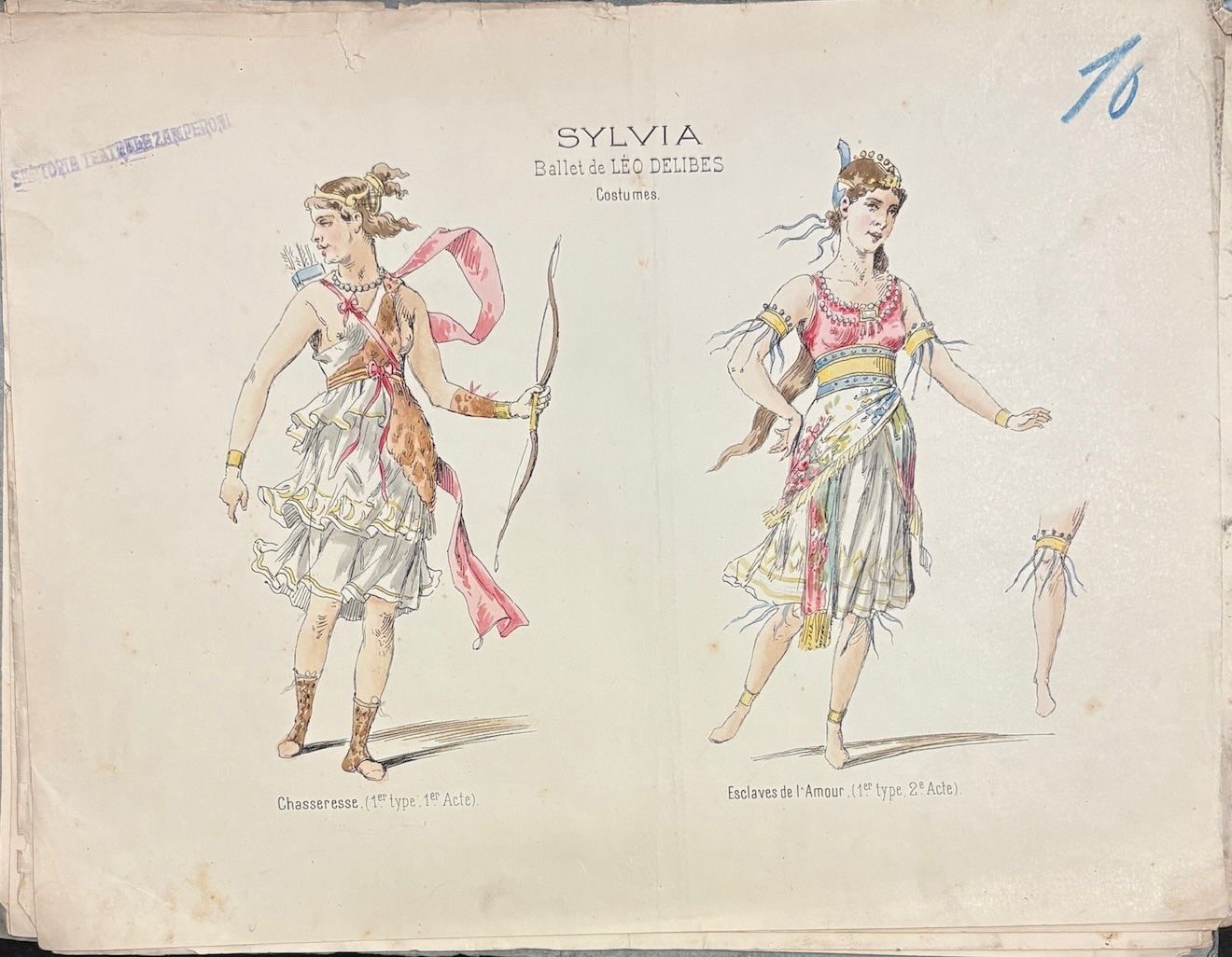 SET of eighteen plates representing the costumes for "Sylvia" by Léo Delibes. Printed on paper, enhanced with watercolour. Plates numbered from 1 to 18 by hand, stamped "Sentoria theatrale Zamperoni" on each plate, 26.5 x 35 cm, A.B.E. (soiling, slight tears at edges). The plates are presented in a sleeve annotated "Cartelle №9".