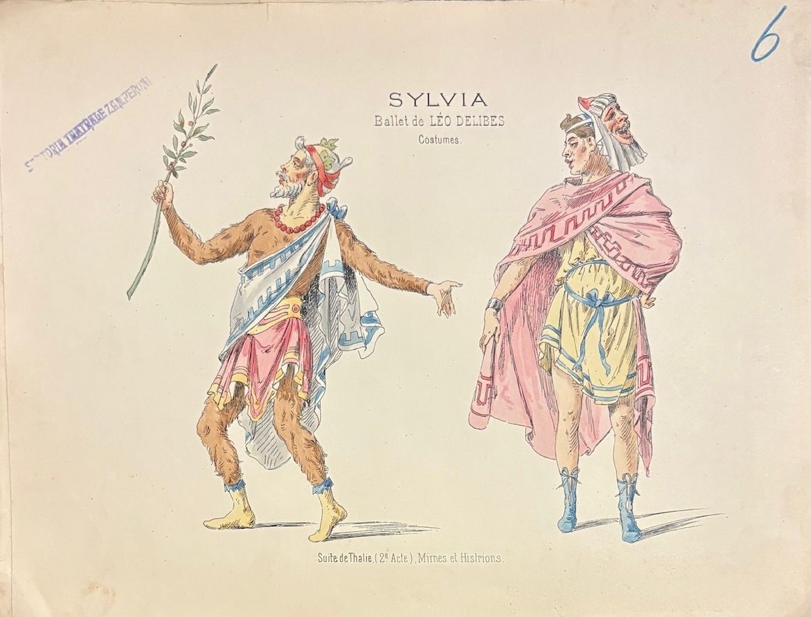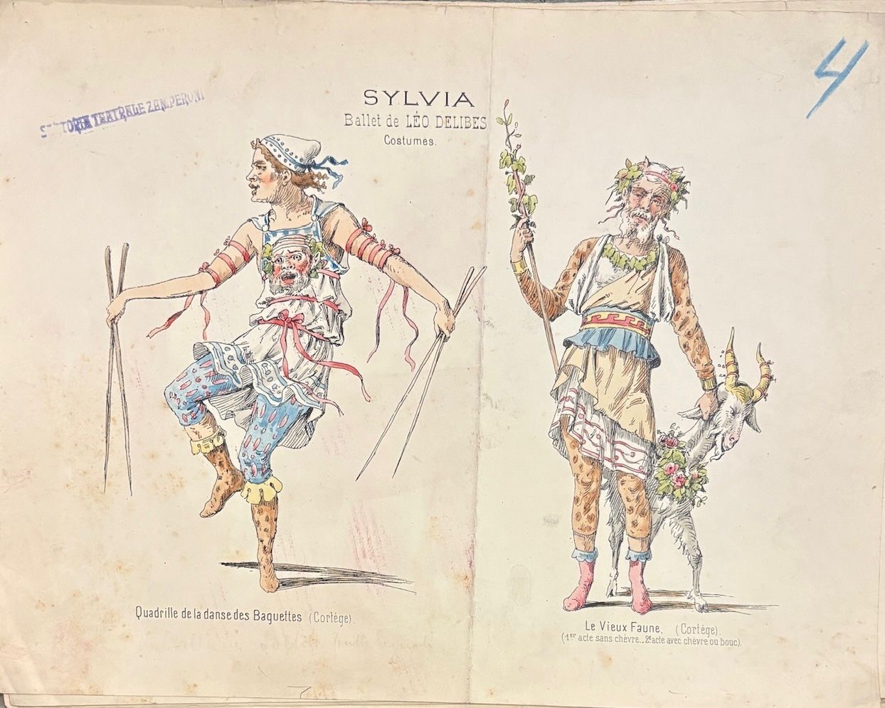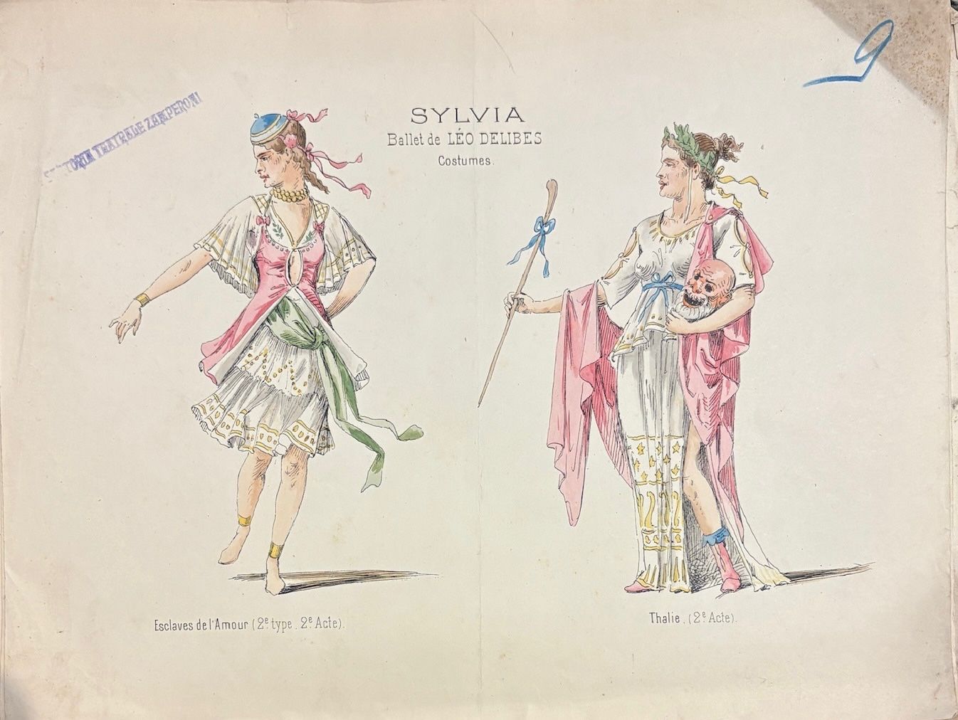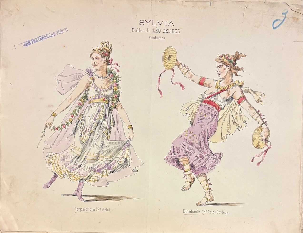 SET of eighteen plates representing the costumes for "Sylvia" by Léo Delibes. Printed on paper, enhanced with watercolour. Plates numbered from 1 to 18 by hand, stamped "Sentoria theatrale Zamperoni" on each plate, 26.5 x 35 cm, A.B.E. (soiling, slight tears at edges). The plates are presented in a sleeve annotated "Cartelle №9".
