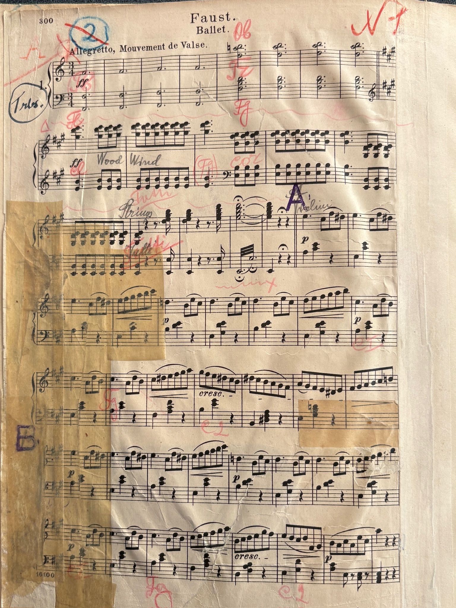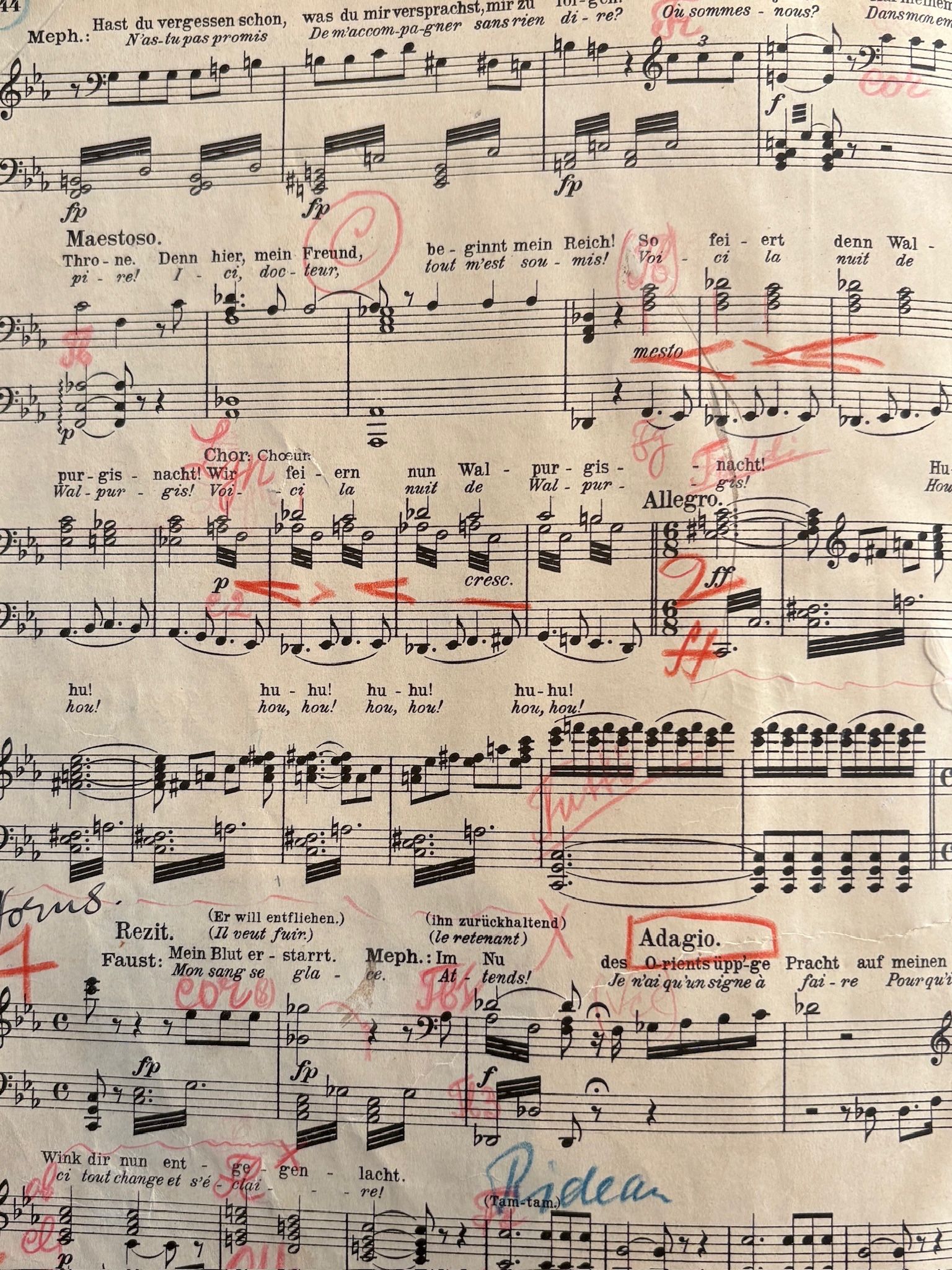 - Faust. Piano. Walpurgis Night. Printed score. Without title page. Numerous annotations and corrections, page tears (partly reglued), Boston Opera stamp, 30 pp. (page numbering is mixed up), in-4, as is.