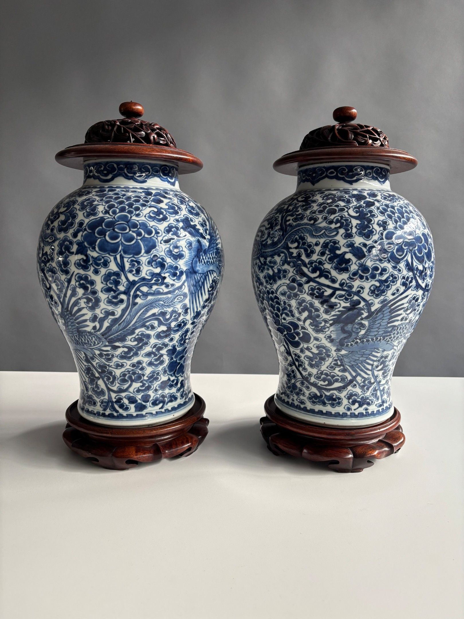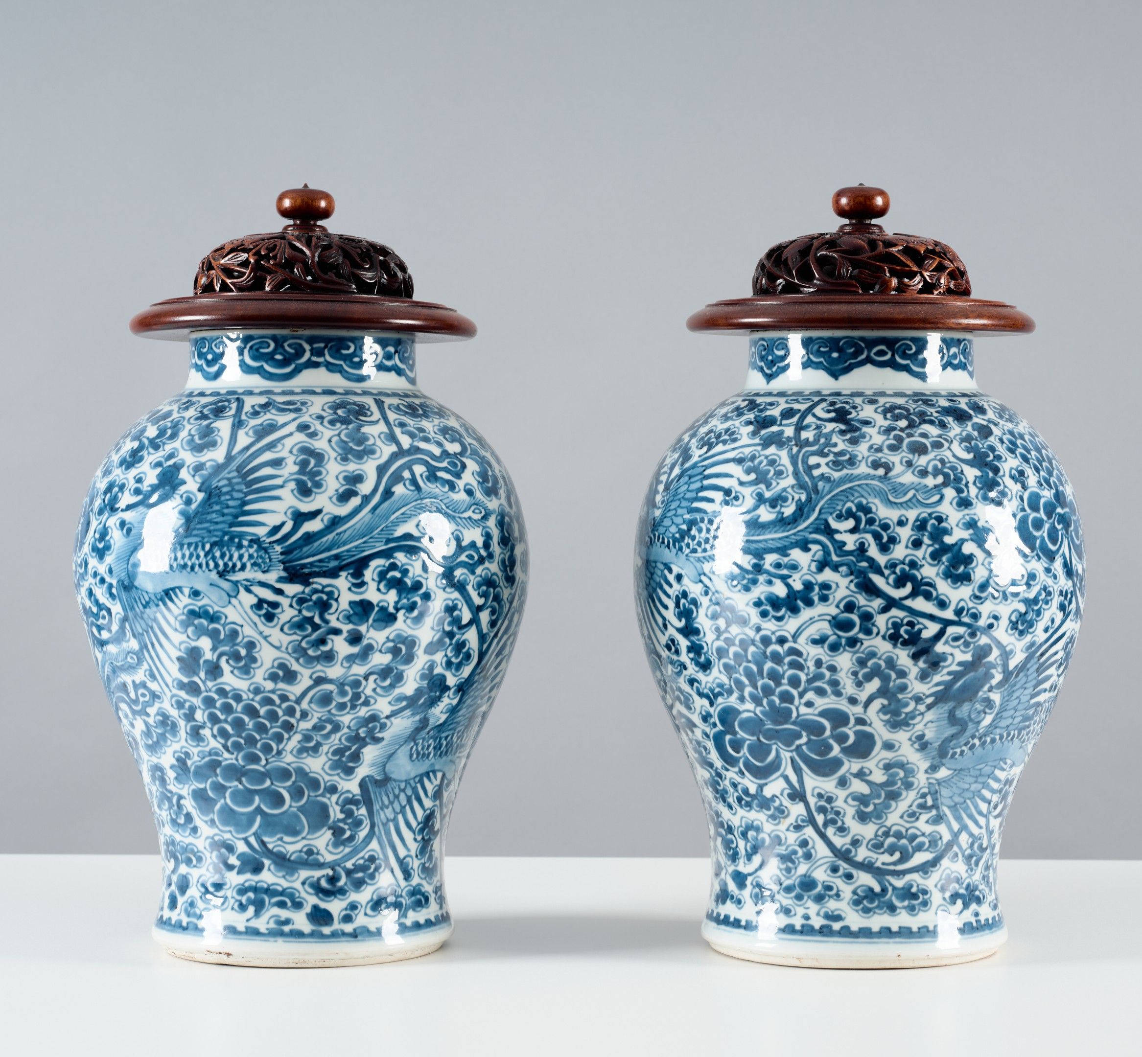 A pair of covered porcelain potiches of baluster form, with arched bases and swollen sides, decorated in cobalt blue on a white background with phoenixes in flight among scrolls of peonies. With lids and adapted wooden bases