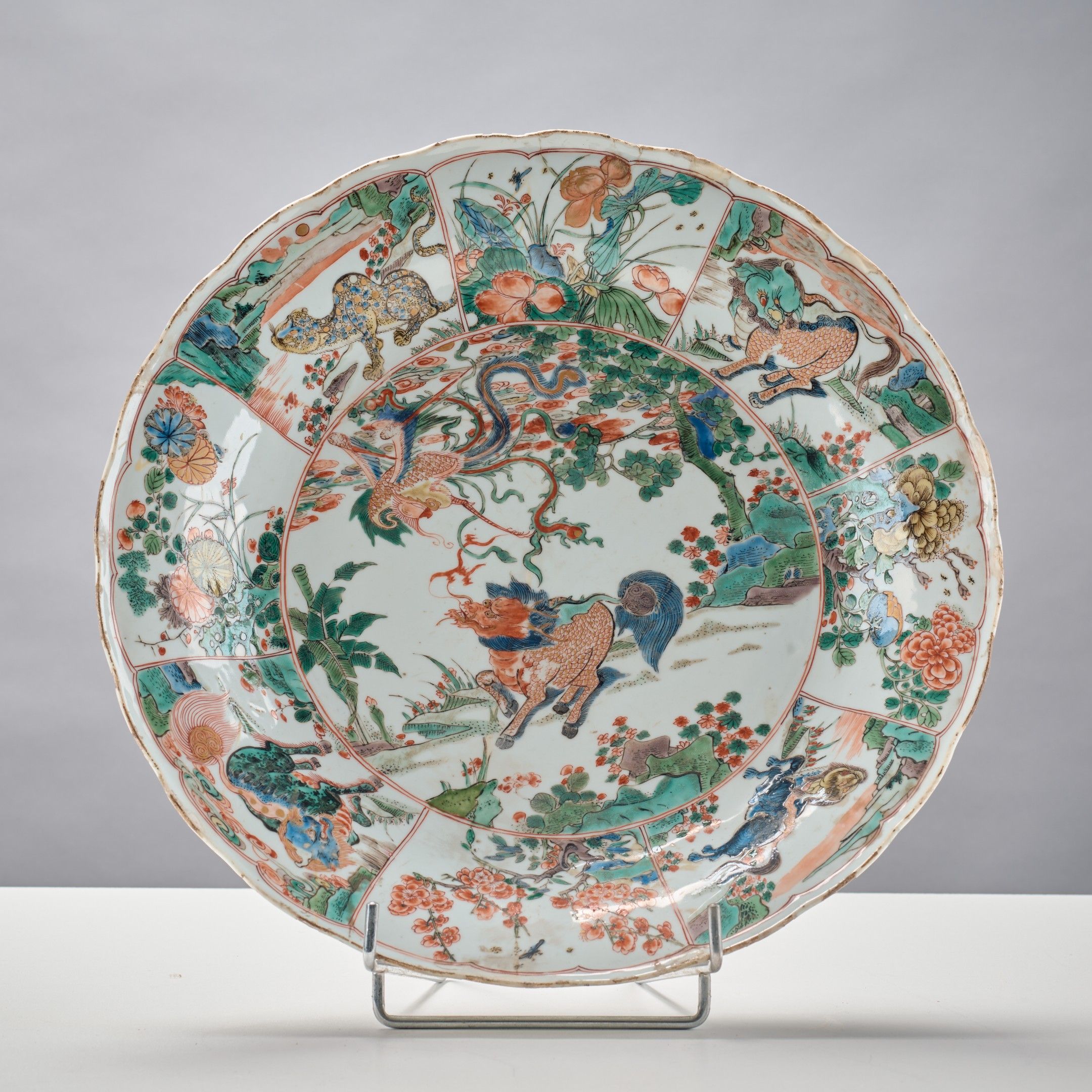 Large circular porcelain dish with scalloped lip, decorated in green family enamels with a baize and a phoenix in a landscape in the central medallion, cartouches alternating fantastic animals and flowering branches radiating out from the rim. A stamped mark within a double blue border below the base.