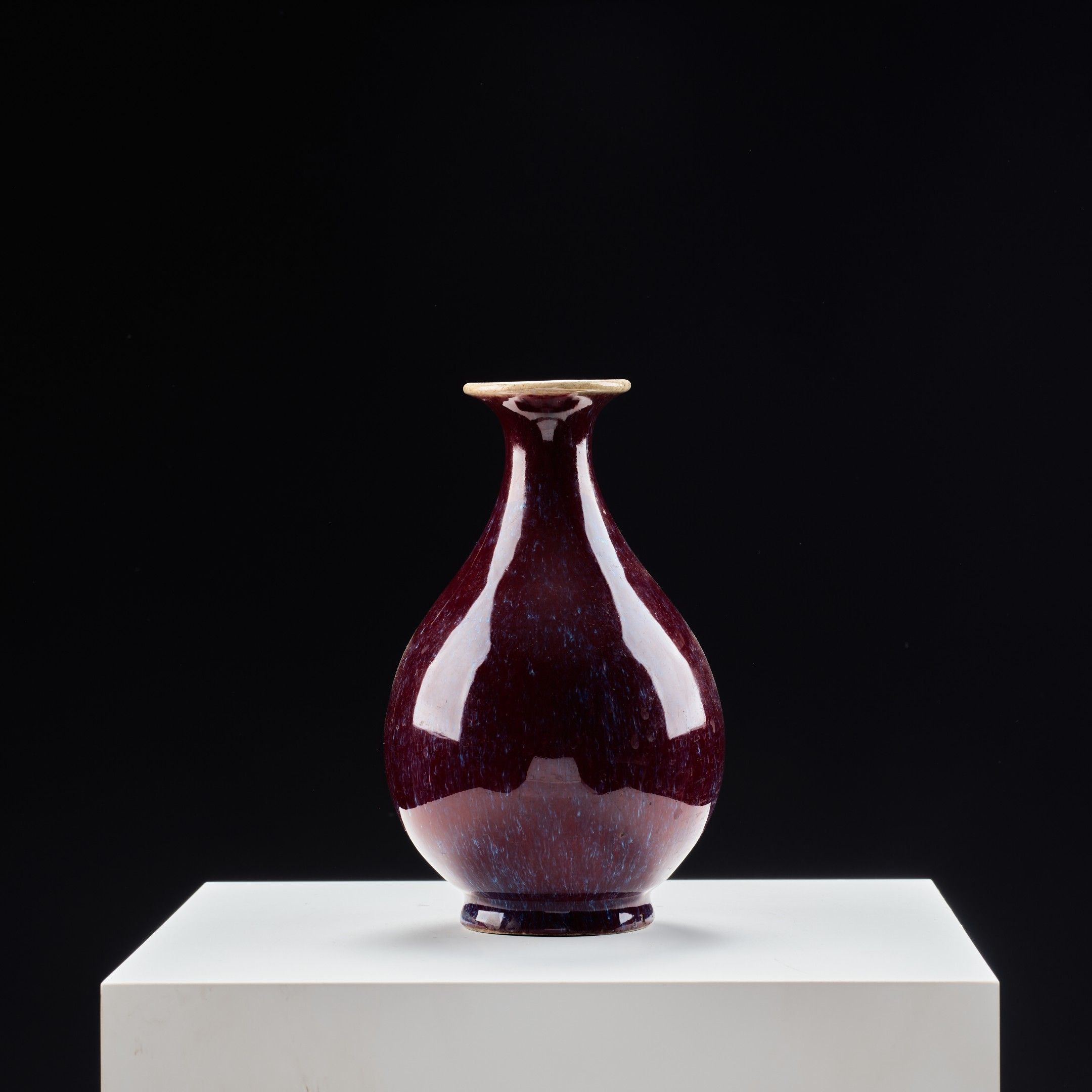 A "yuhuchun" shaped porcelain vase, standing on a short foot, with a wide, pear-shaped body topped by a short, flared neck, covered throughout with a flamed glaze.
