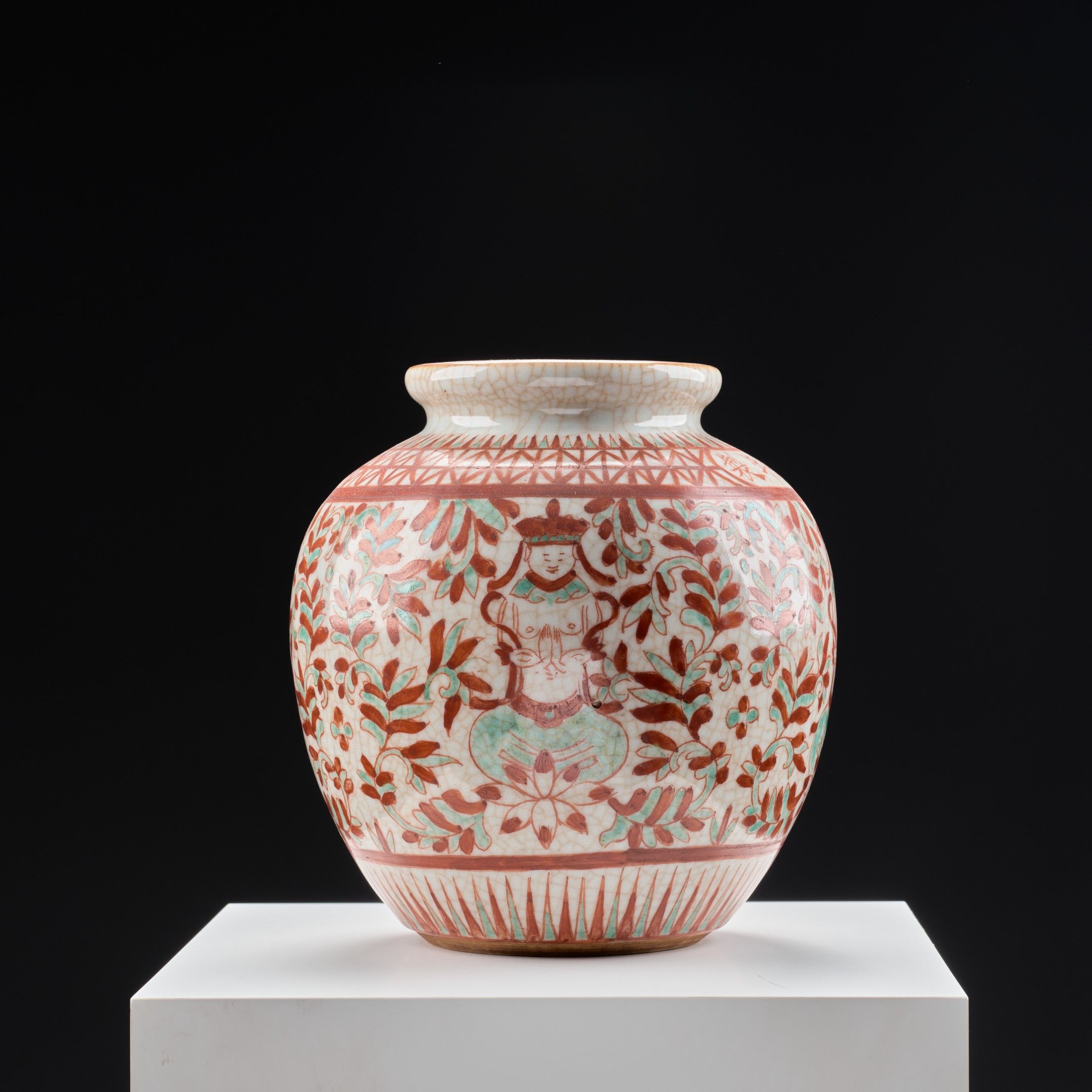 A red and green glazed benjarong vase depicting seated and praying Buddha among foliage. An apocryphal six-character Yongle mark around the neck.