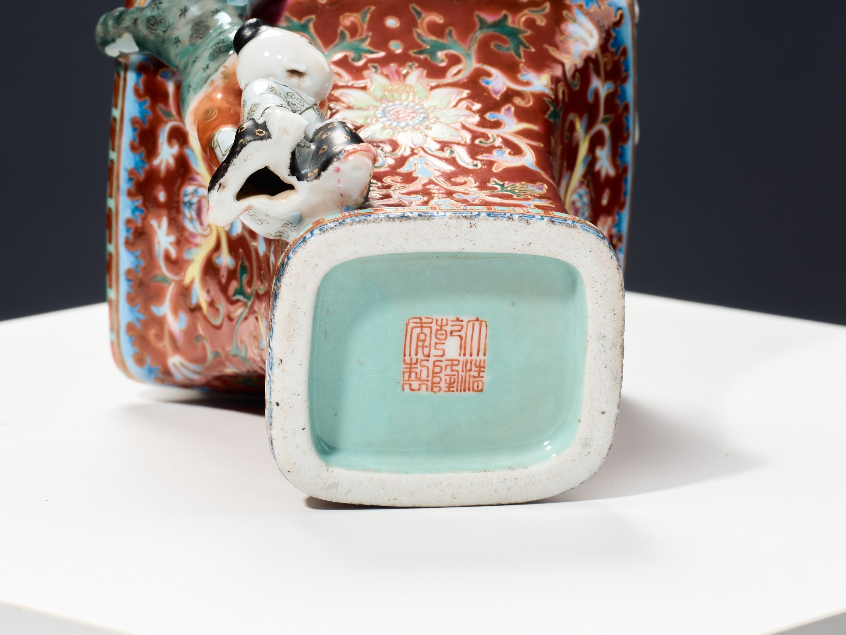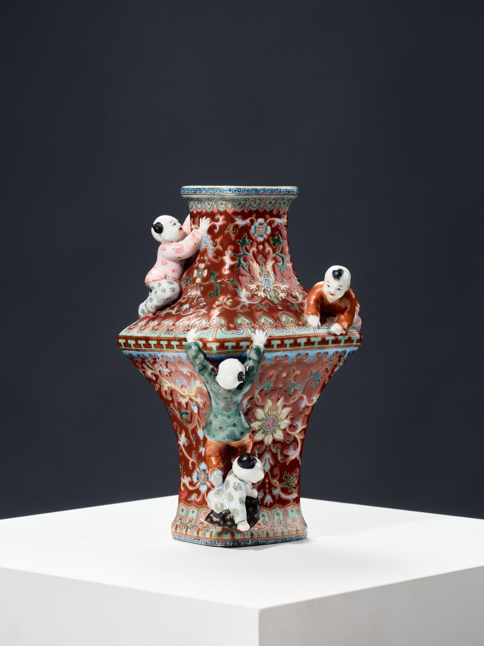 An amusing and original small porcelain vase, of baluster form, the diamond-shaped quadrangular body surmounted by a straight neck, covered throughout with a decoration in polychrome enamels of lotus scrolls on a ruby-red ground, as well as a decoration in high relief of small children climbing all over the body and the shoulder. An apocryphal six-character Qianlong mark in iron red below the base.