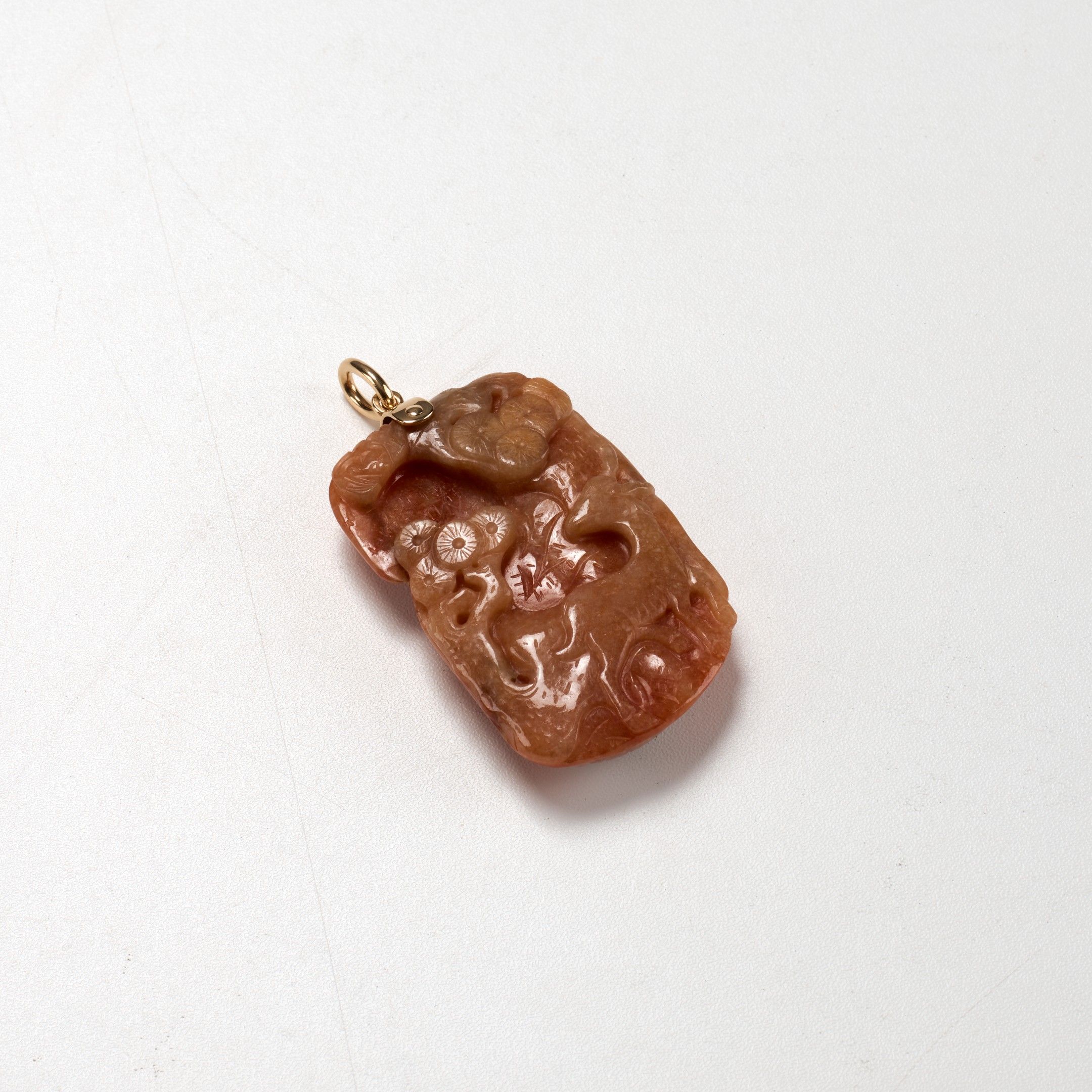 Jadeite medallion, decorated in relief with two chimeras playing on one side, and a deer under the pines on the other, the stone in orange and white tones whose decoration plays with this bichromy.
