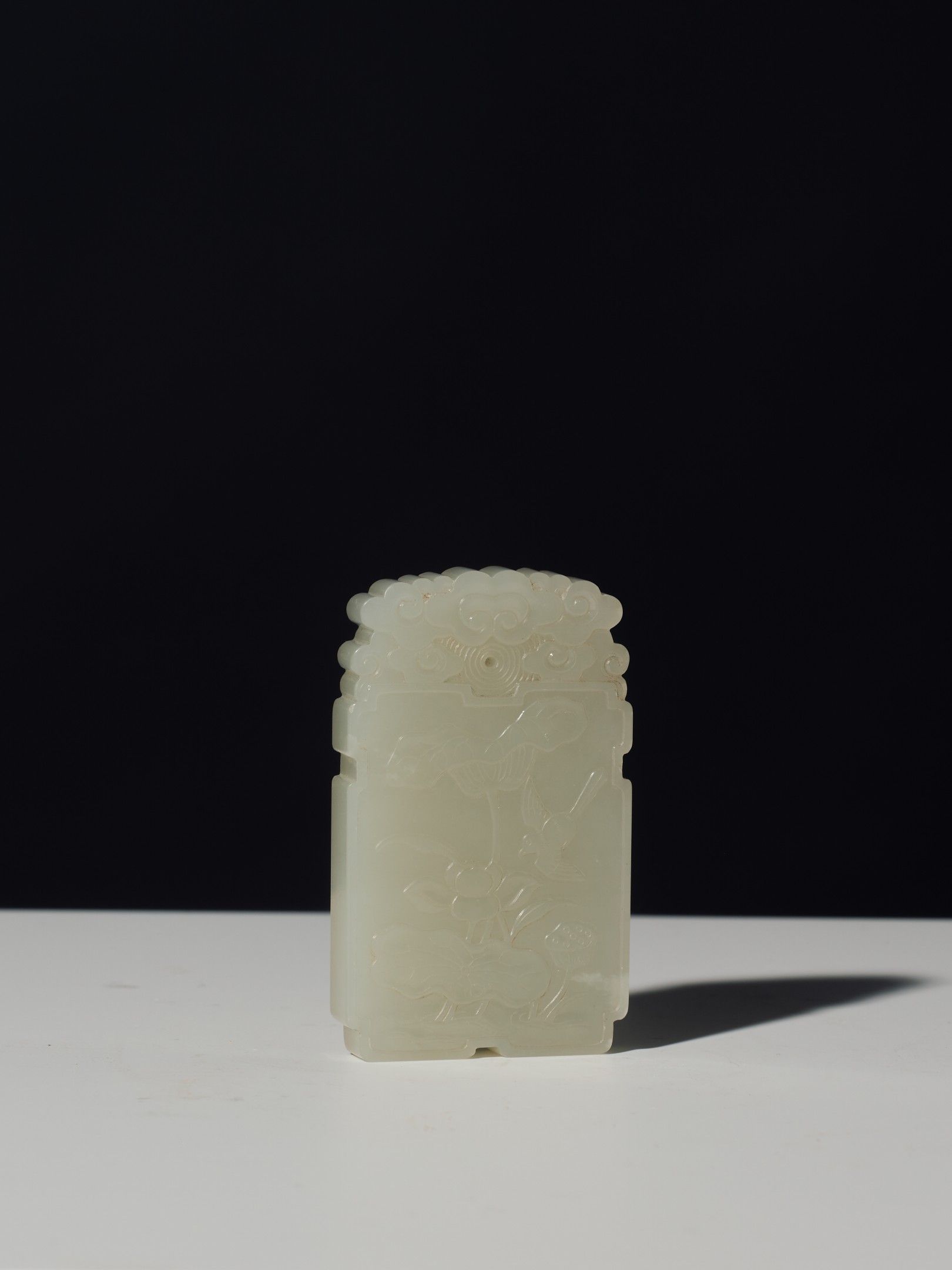 A small white jade plaque, quadrangular in shape with carved decoration in light relief of a bird in flight above lotus flowers on one side, a decoration of auspicious characters on the other.
