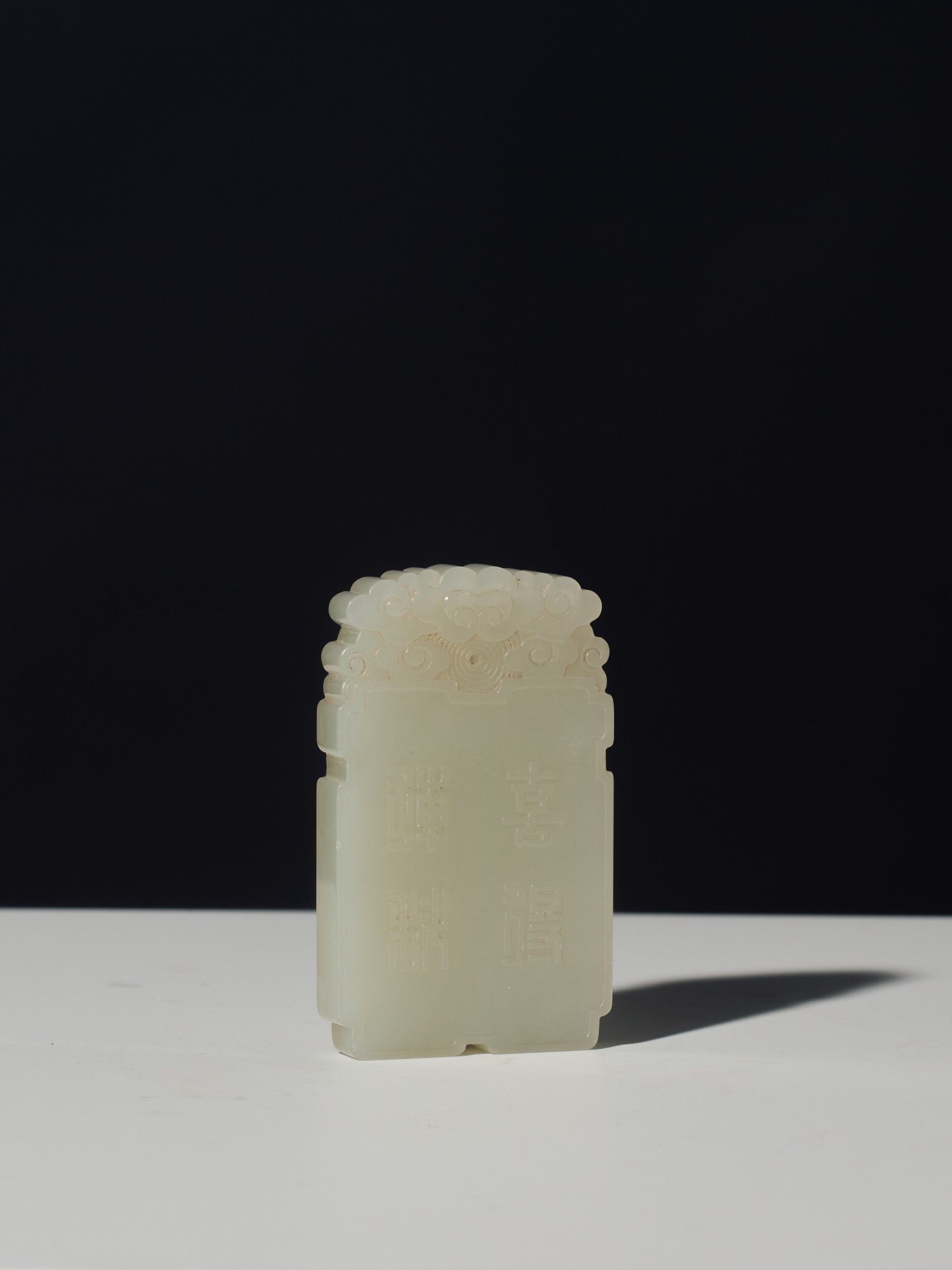 CHINA, 20th century A small white jade plaque, quadrangular …