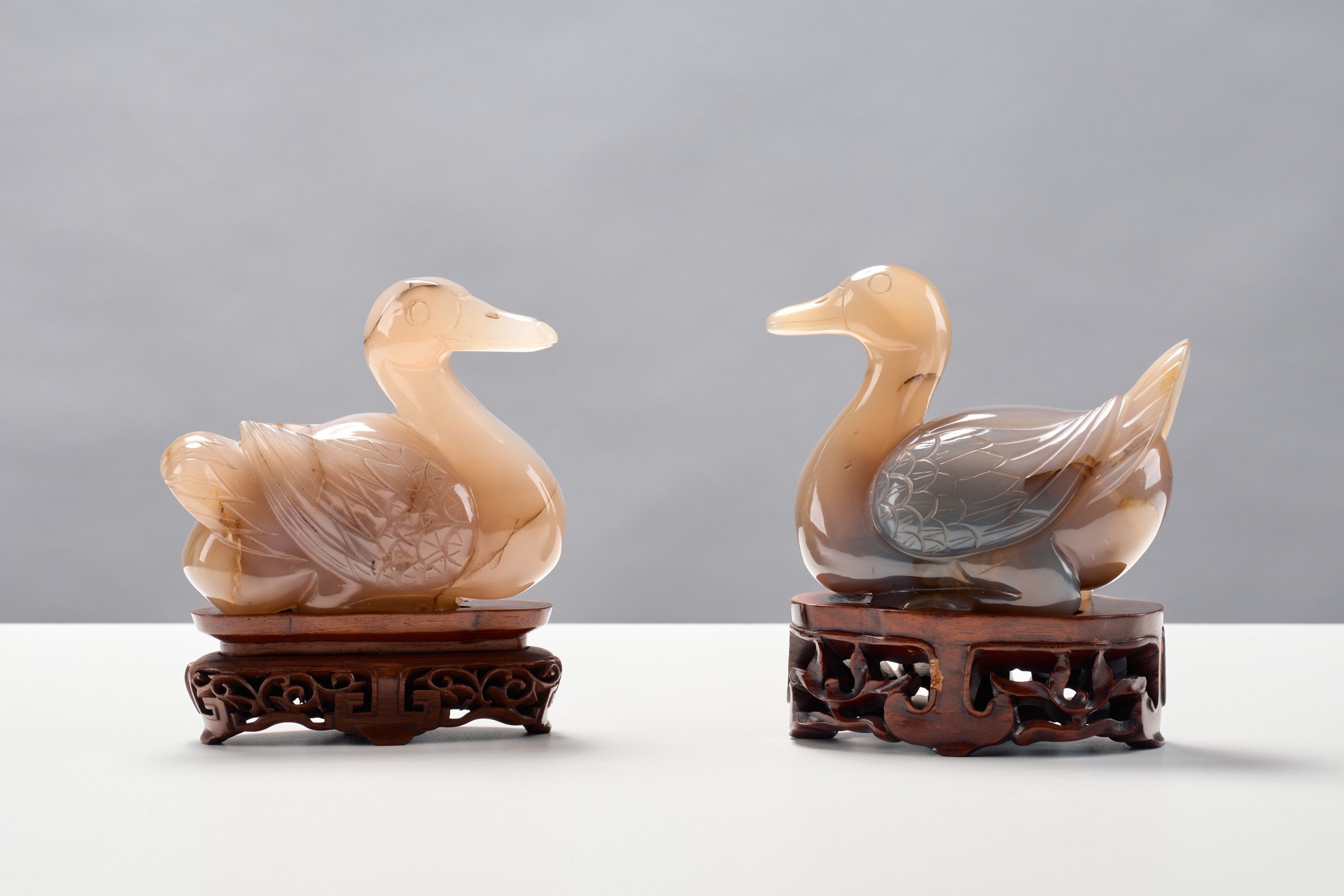 A pair of carved agate groups in the form of ducks. Resting on adapted wooden bases.