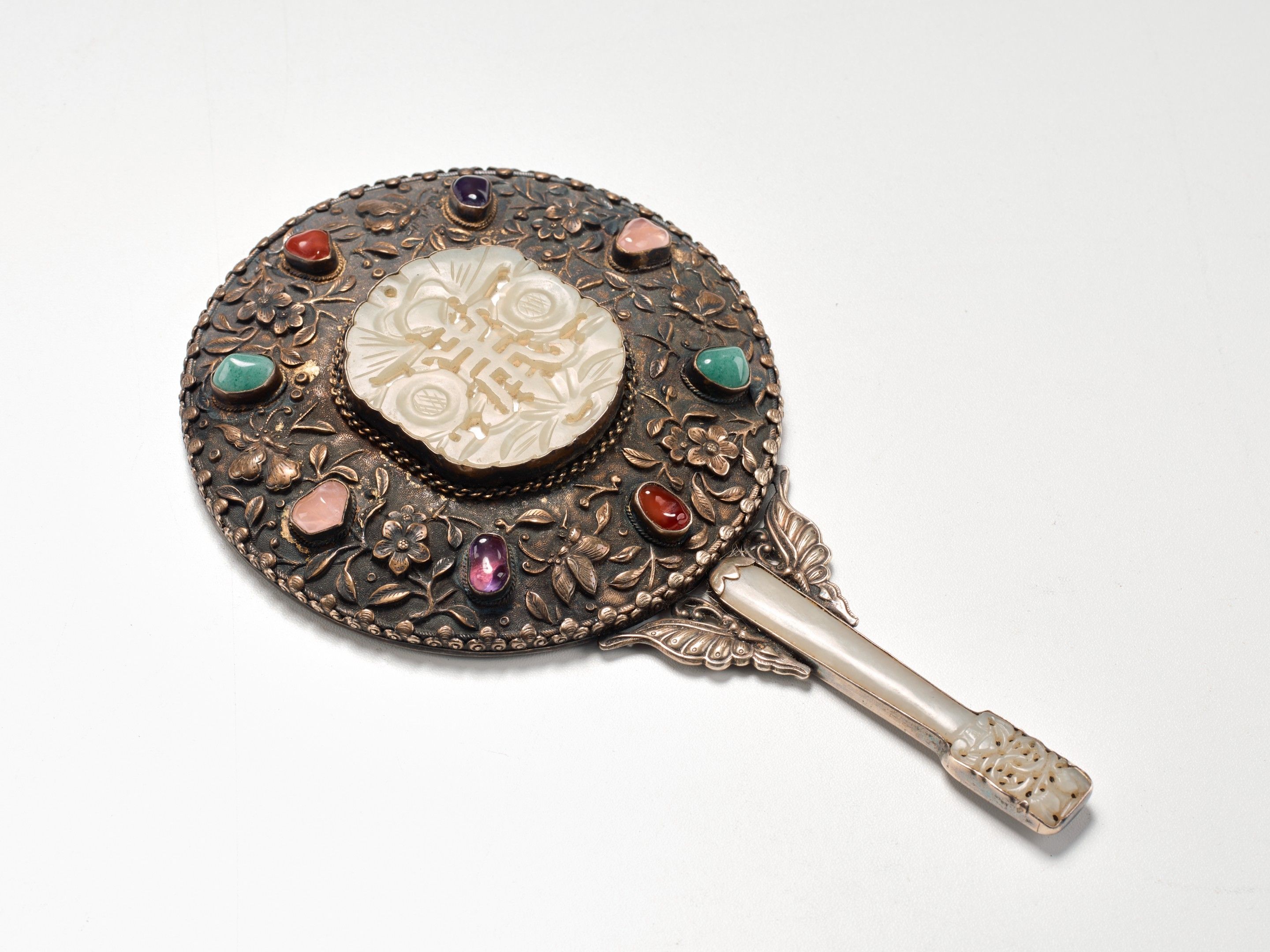Face-to-face mirror, the handle consisting of a celadon jade pin with openwork decoration of bats and sapecas, the mirror of circular form in a silvered metal frame chased and treated in repoussé of floral motifs with additions of semi-precious stones in cabochon, comprising in its centre an openwork jade plaque of an auspicious character and flowers.