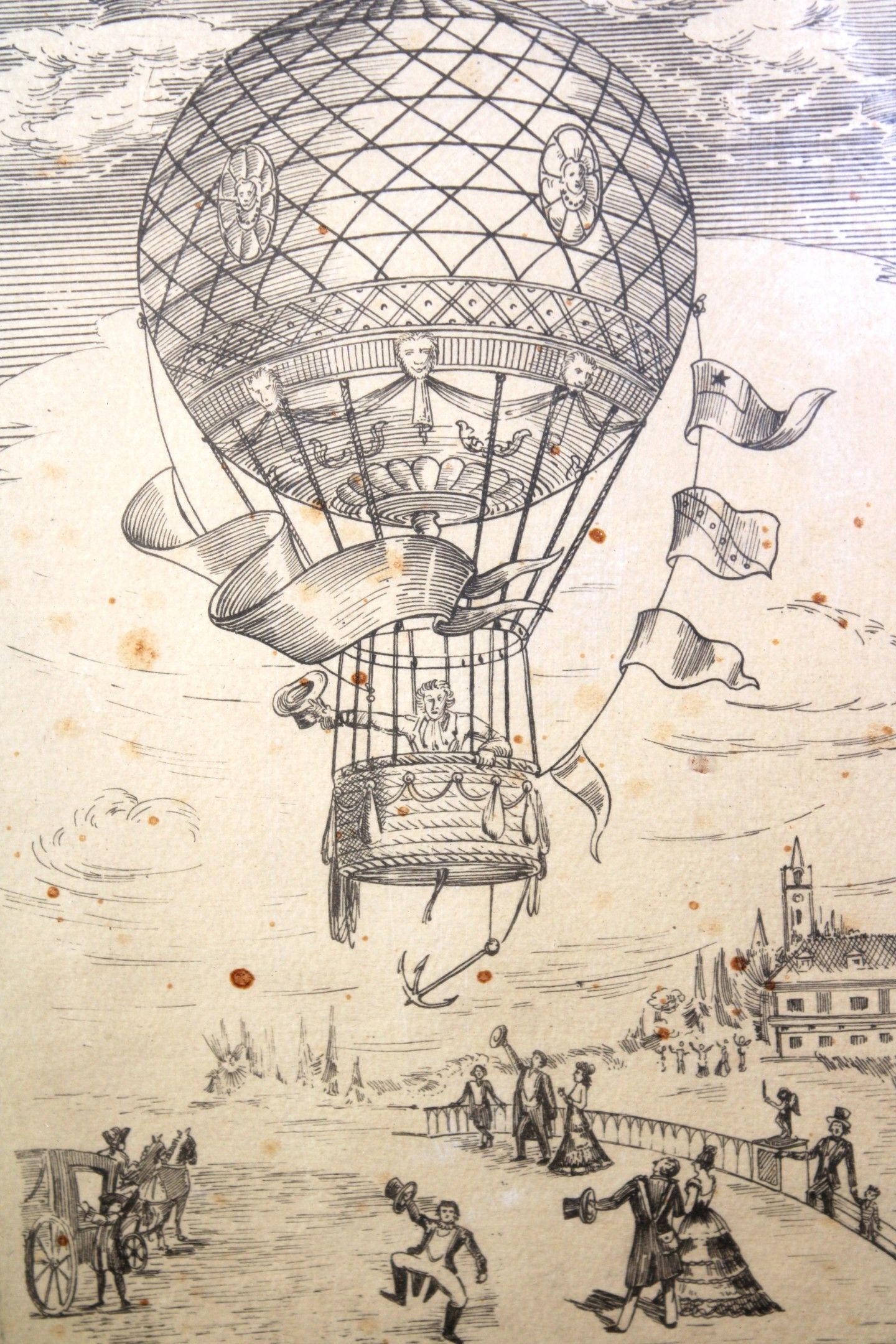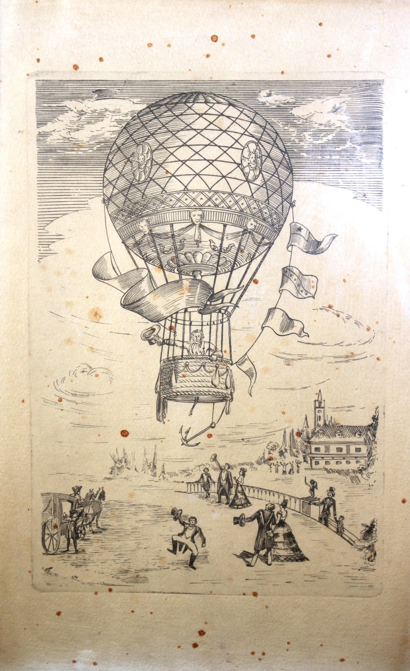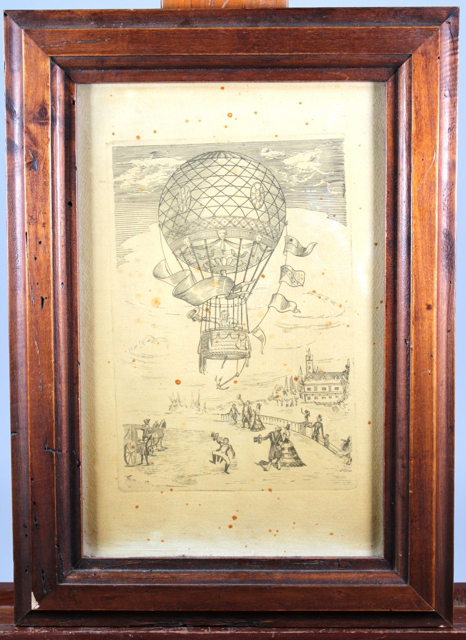 NINETEENTH CENTURY SCHOOL Hot-air balloon in flight. Black engraving. (foxing, discoloration) Sight: 34 x 21.5 cm (frame: 44 x 32 c)