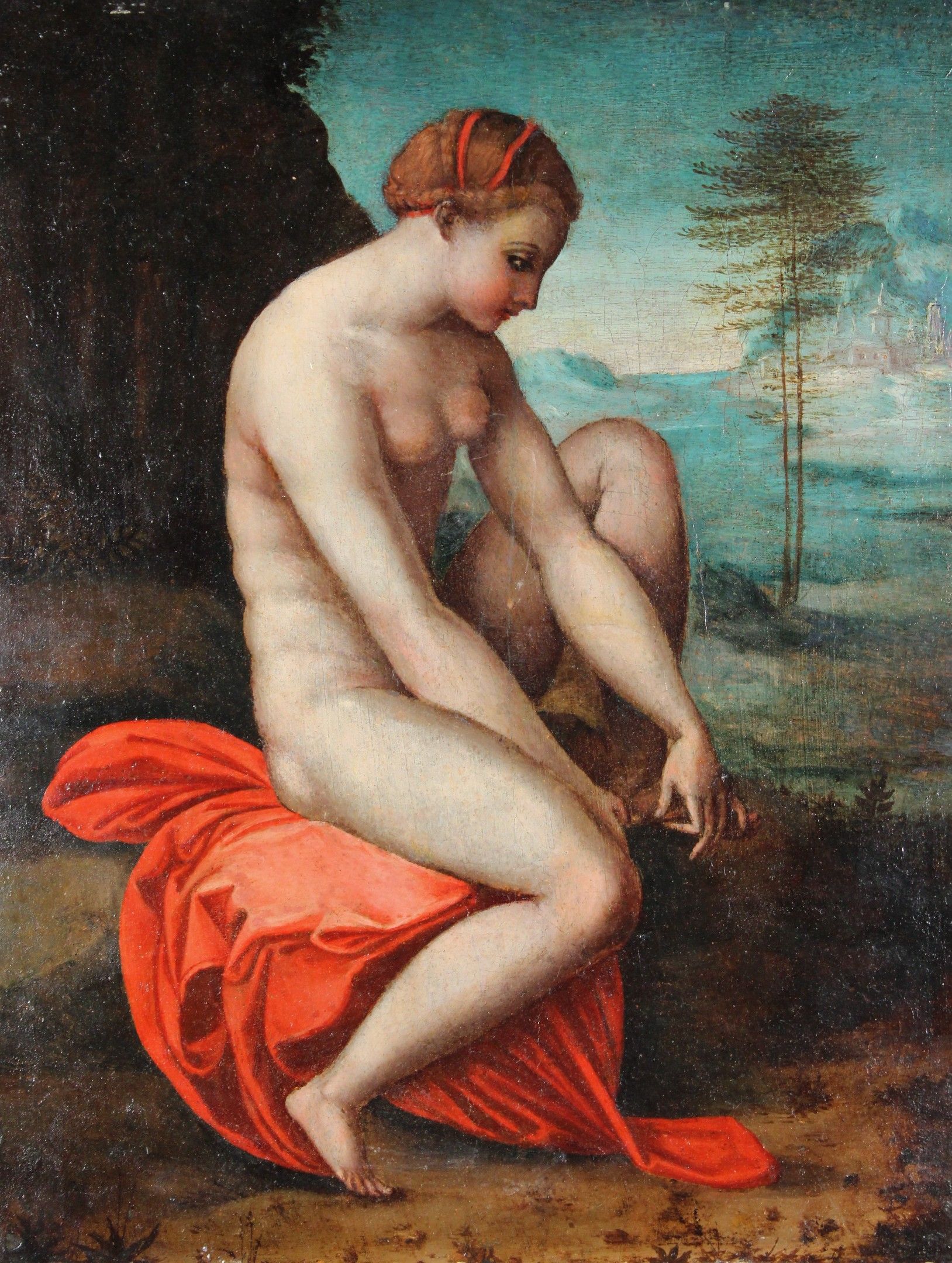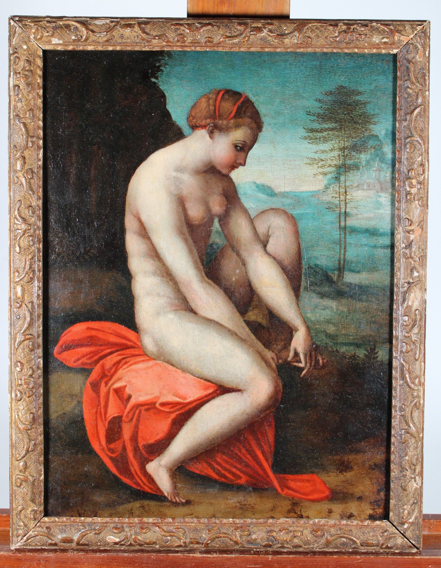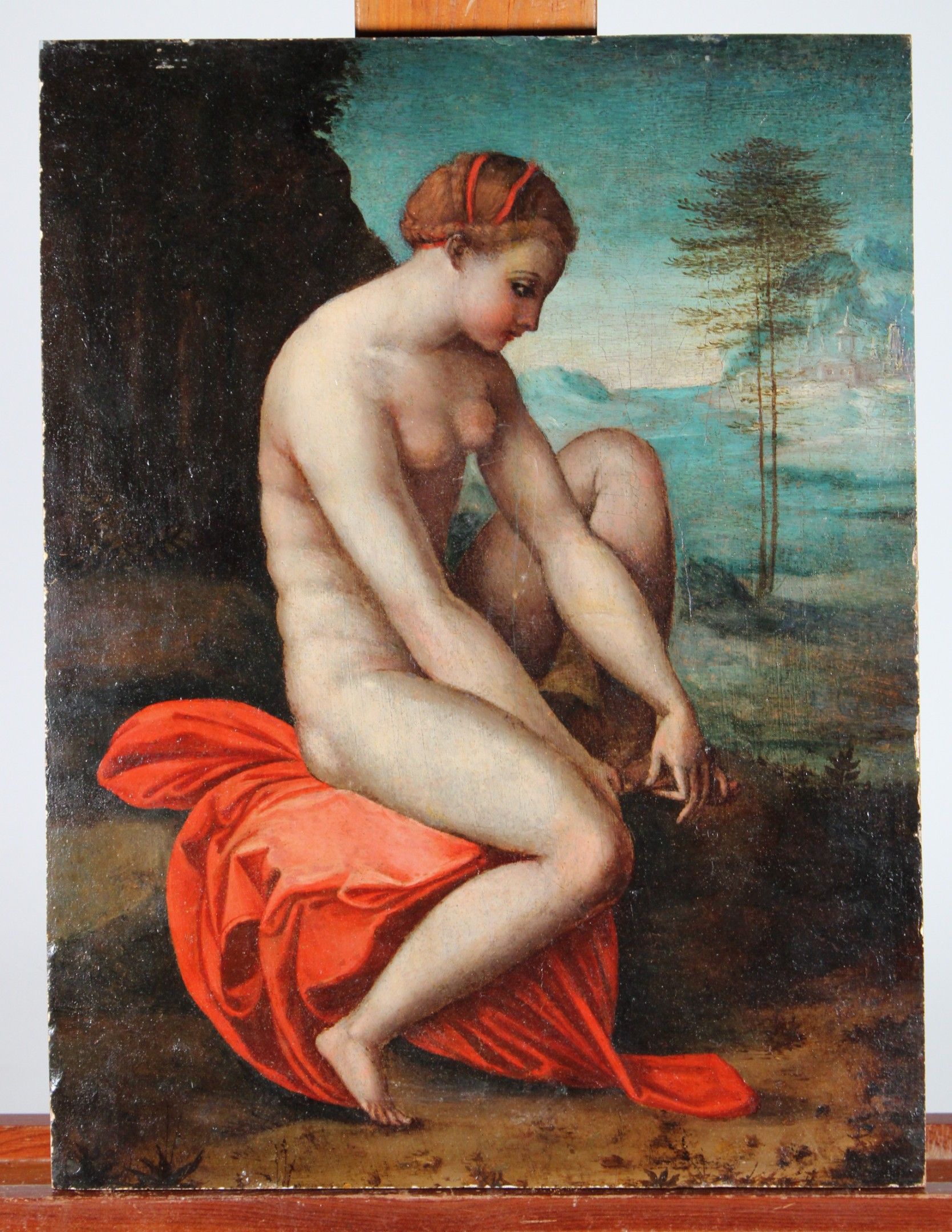 16th CENTURY SPANISH SCHOOL, after RAPHAEL Venus stung by a rose Panel. (old restorations) 42.8 x 32.5 cm Note: Another version of this composition, formerly attributed to Correggio, is in the Isabella Stewart Gardner Museum in Boston (inventory P26w3; canvas, 97 x 72 cm). Both are derived from the engraving by Marco Dente da Ravenna, circa 1516, taken from the decoration by Raphael's workshop for the Stufetta in Rome. Raphael's workshop for the Stufetta of Cardinal Bibbiena. The subject was inspired by The Lamentation of Adonis by the Greek poet Bion (active around 100 BC): Venus, distraught at the death of her lover Adonis, wanders barefoot through the woods and is wounded by brambles. Expert : Stéphane PINTA - Cabinet TURQUIN.