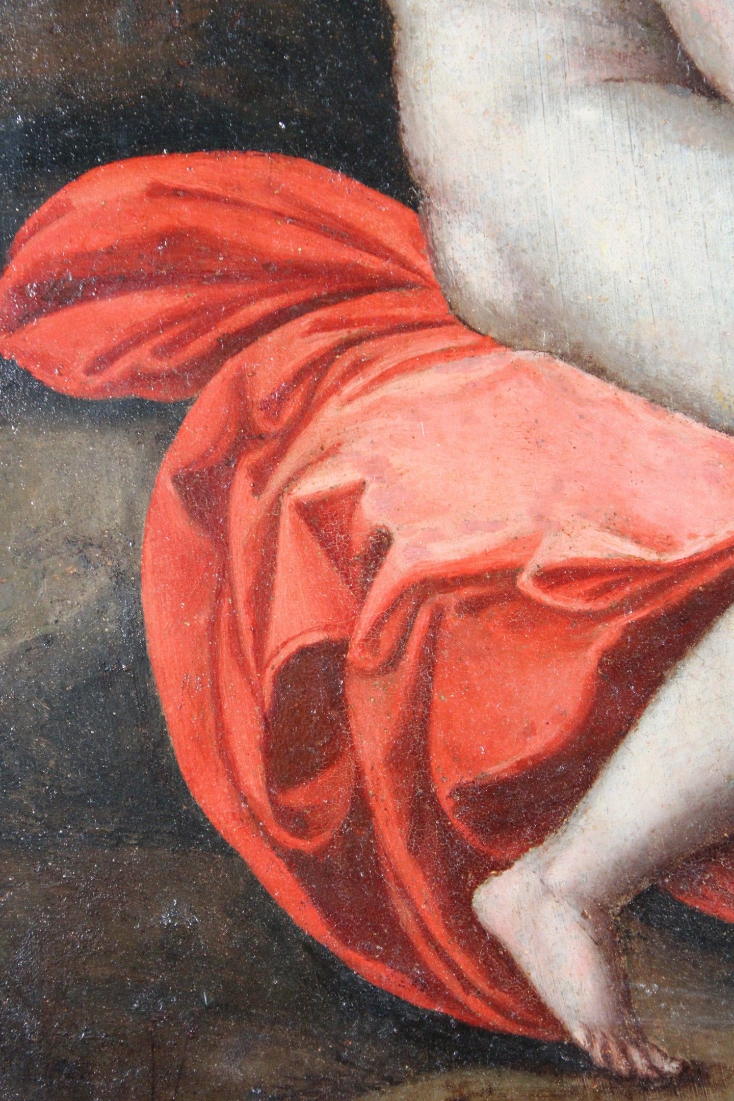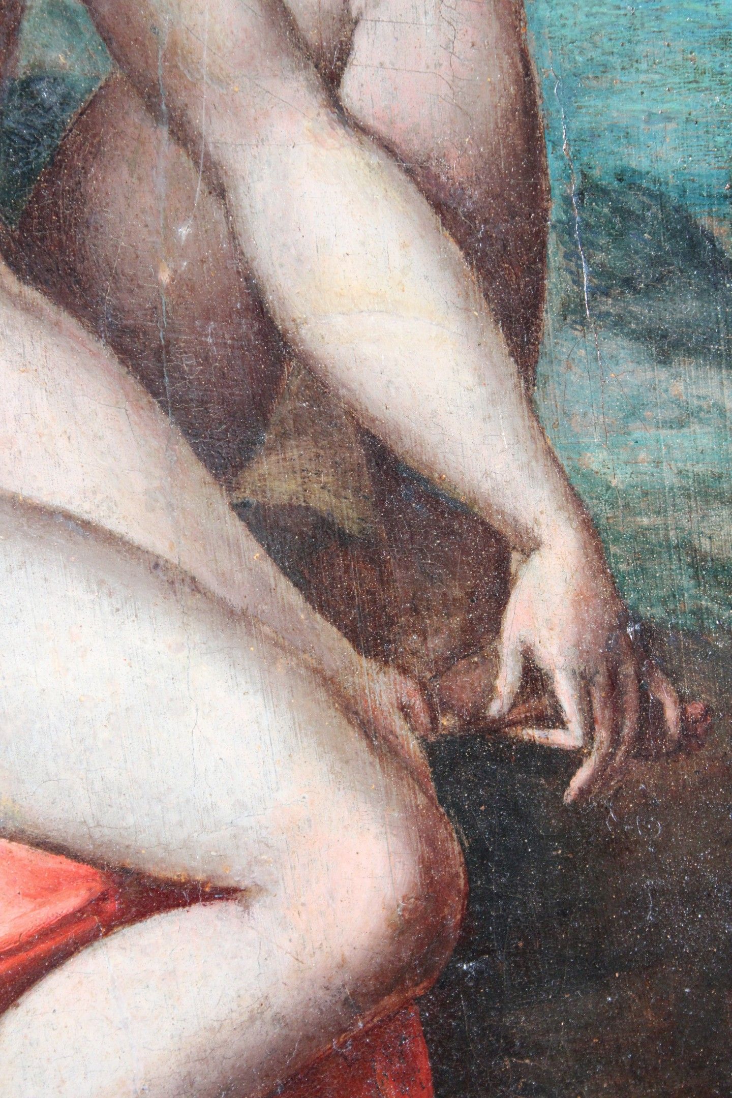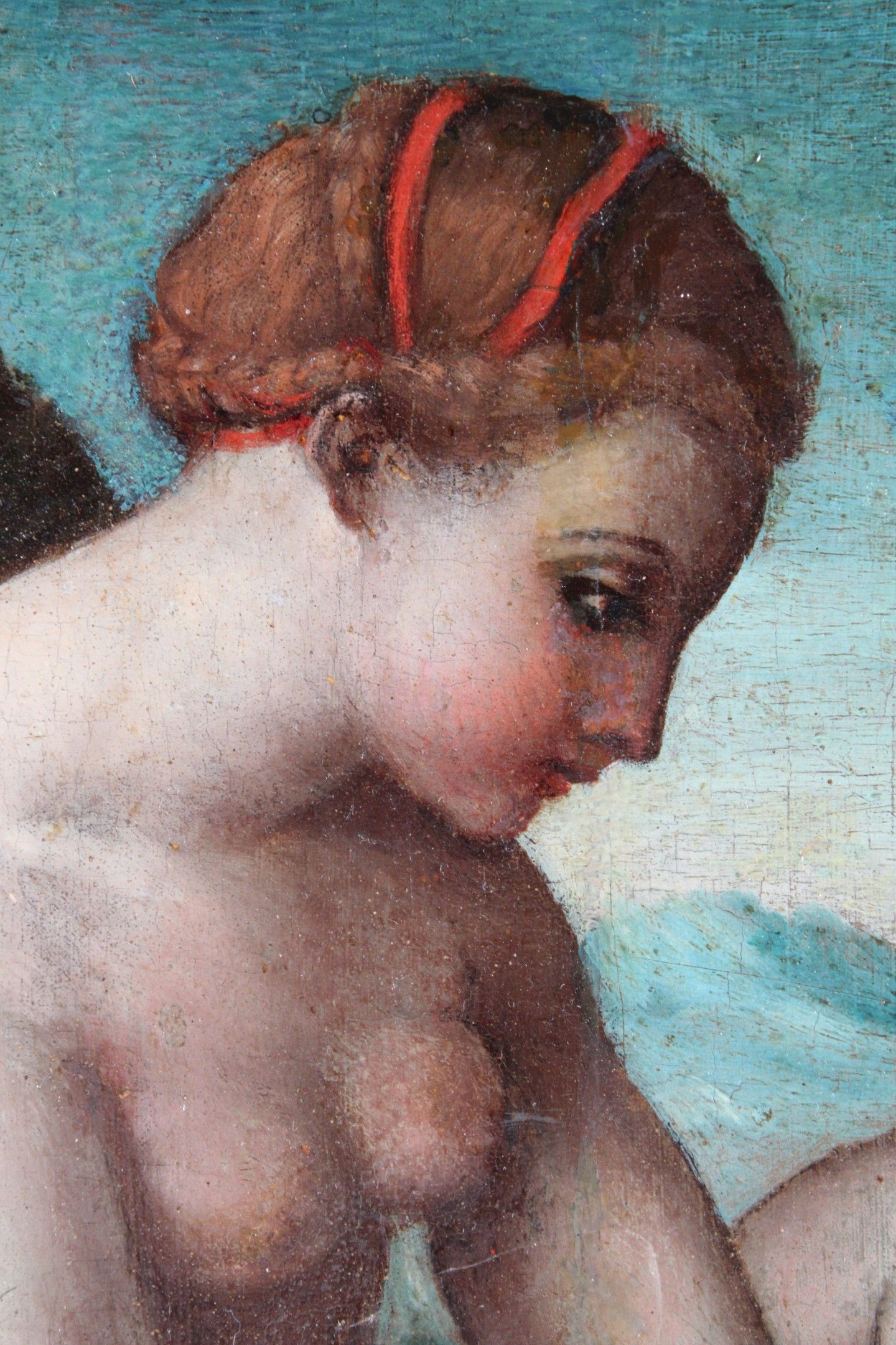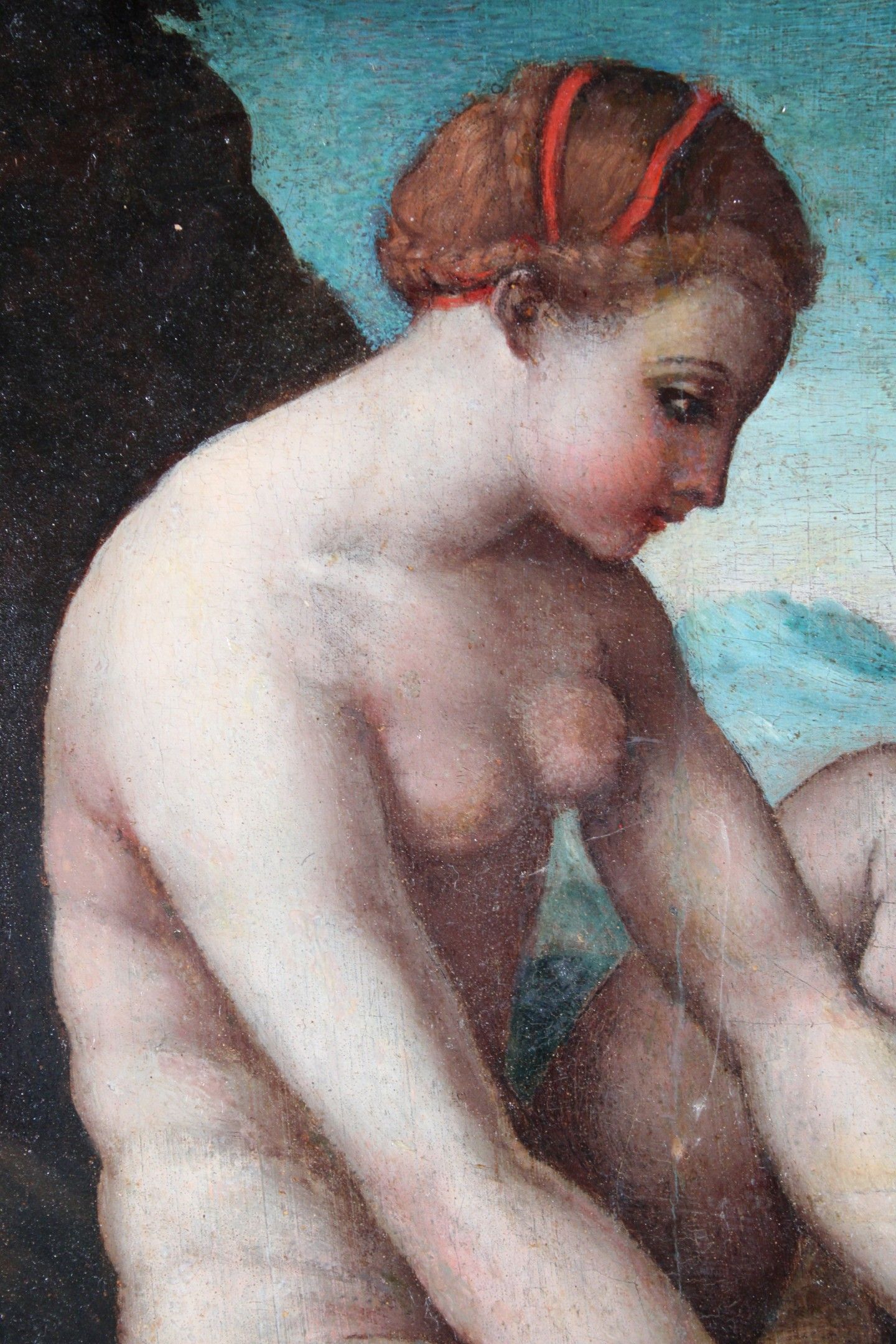 16th CENTURY SPANISH SCHOOL, after RAPHAEL Venus stung by a rose Panel. (old restorations) 42.8 x 32.5 cm Note: Another version of this composition, formerly attributed to Correggio, is in the Isabella Stewart Gardner Museum in Boston (inventory P26w3; canvas, 97 x 72 cm). Both are derived from the engraving by Marco Dente da Ravenna, circa 1516, taken from the decoration by Raphael's workshop for the Stufetta in Rome. Raphael's workshop for the Stufetta of Cardinal Bibbiena. The subject was inspired by The Lamentation of Adonis by the Greek poet Bion (active around 100 BC): Venus, distraught at the death of her lover Adonis, wanders barefoot through the woods and is wounded by brambles. Expert : Stéphane PINTA - Cabinet TURQUIN.
