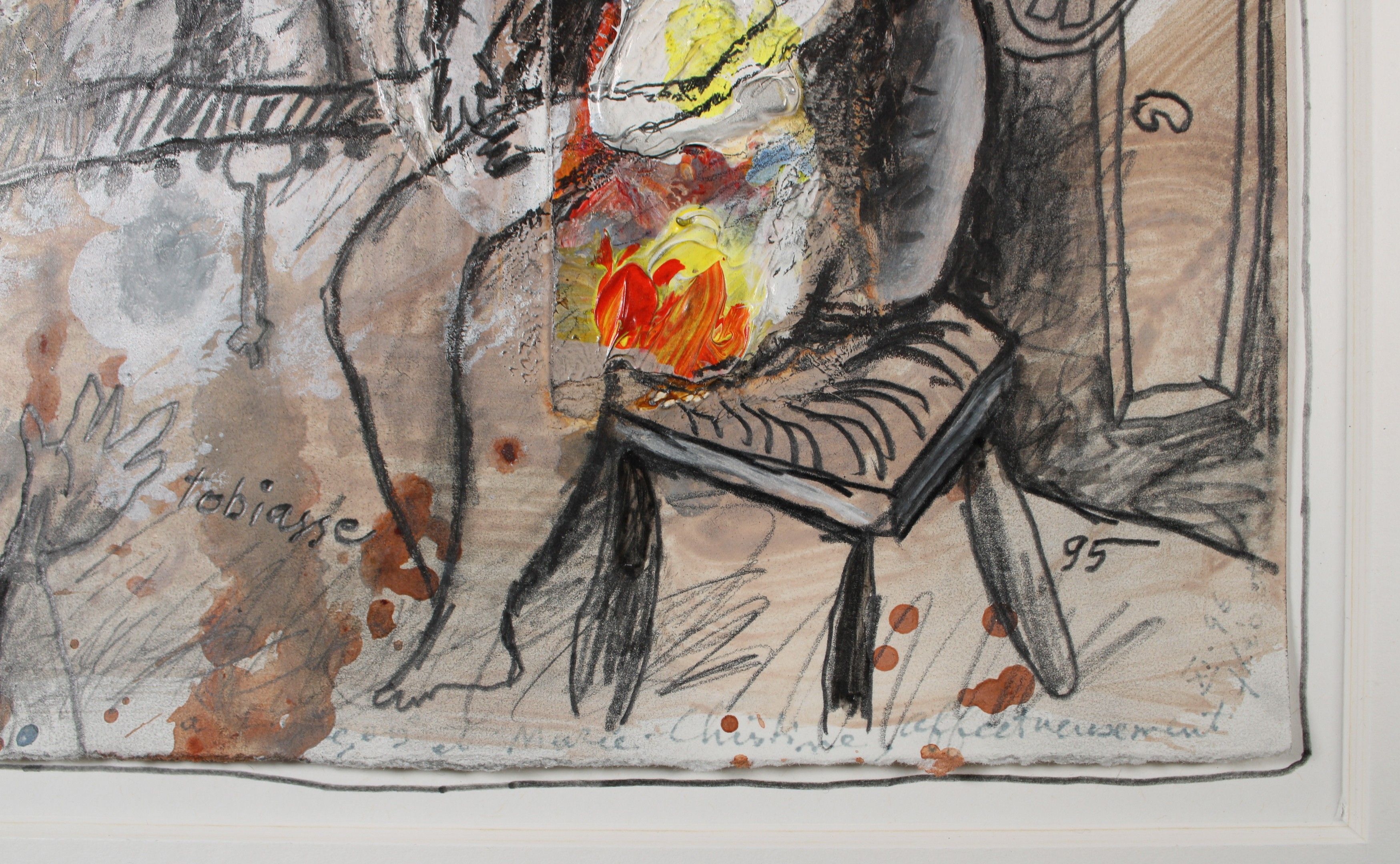 Mixed media including pencil, ink, watercolour and collage on paper. Titled and signed in the composition, dedicated lower right.