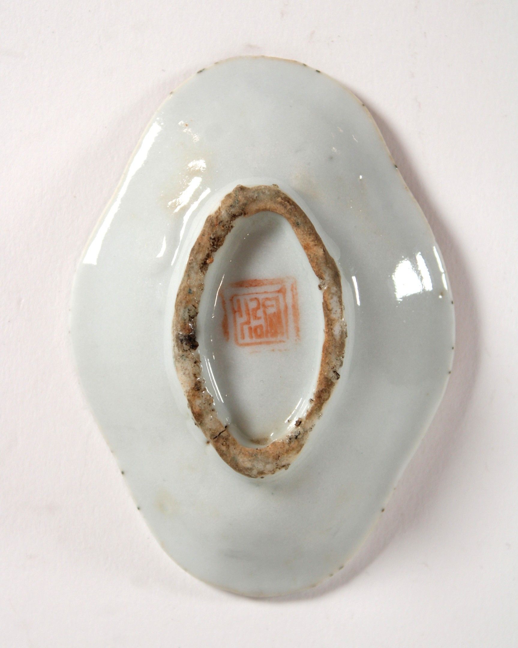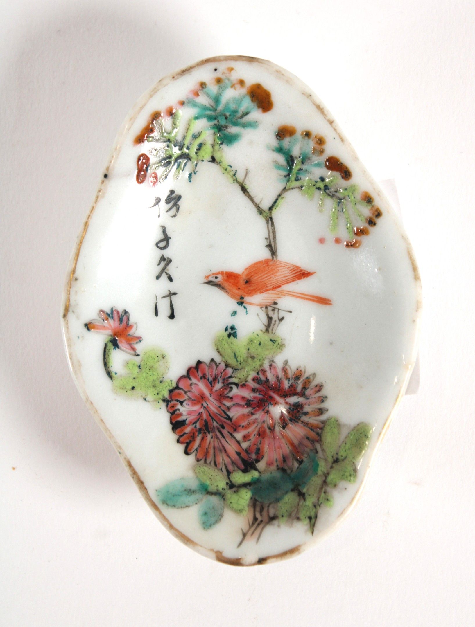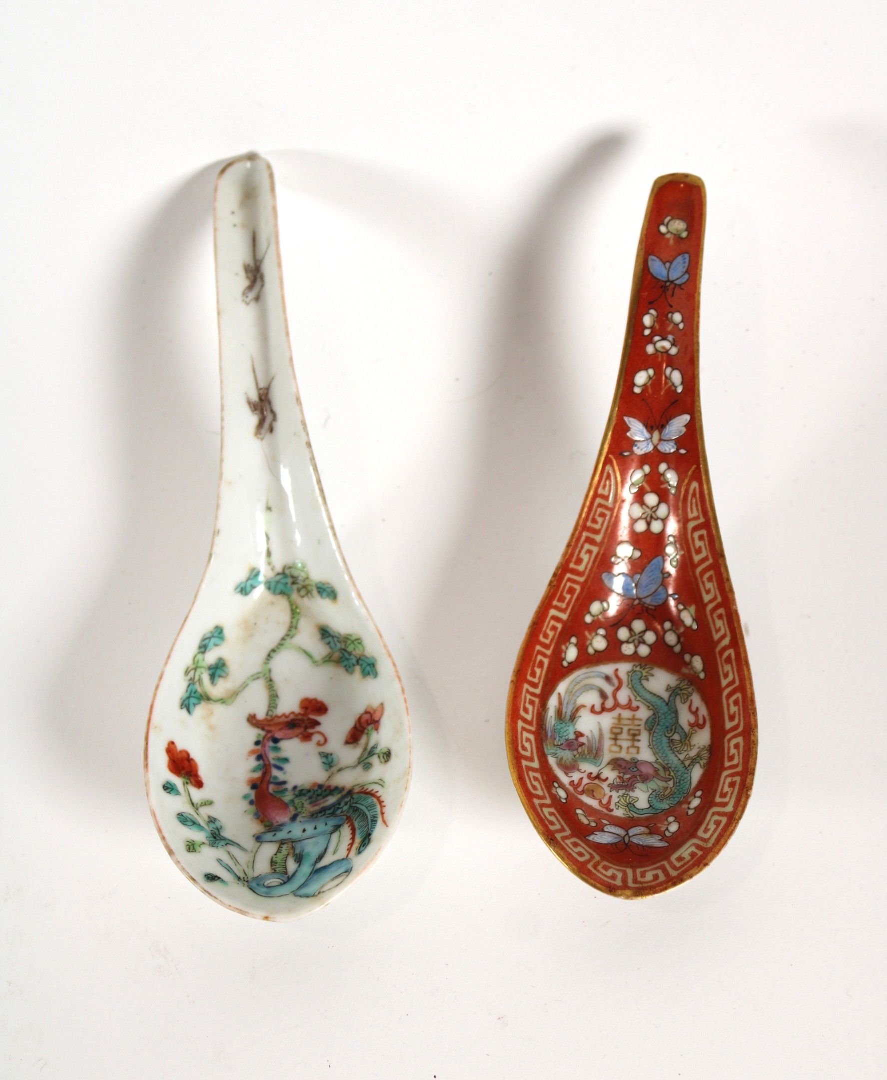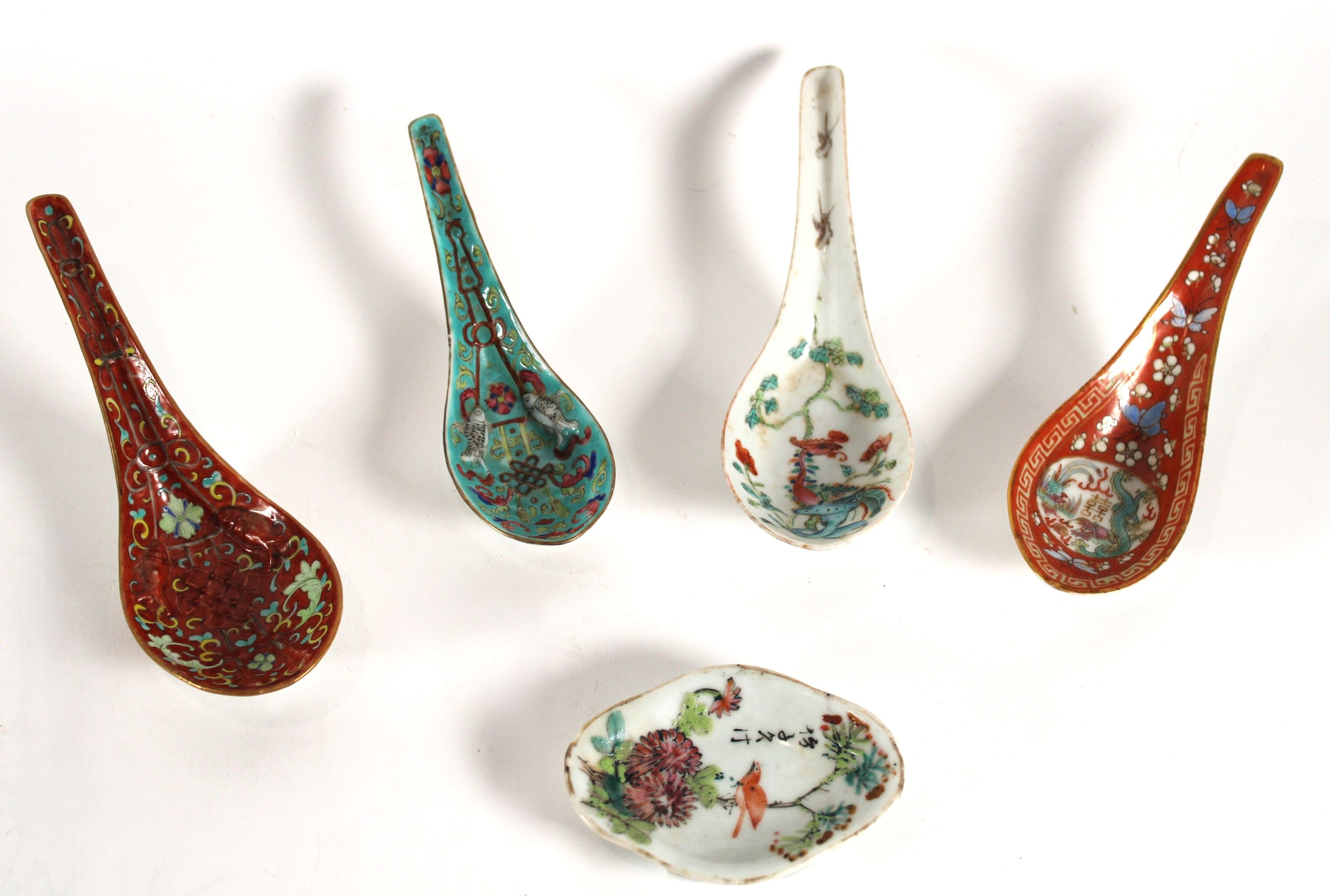 Set of four porcelain spoons decorated in polychrome enamels with birds, dragons, phoenixes and emblems, and a small diamond-shaped bowl decorated with a branching bird.