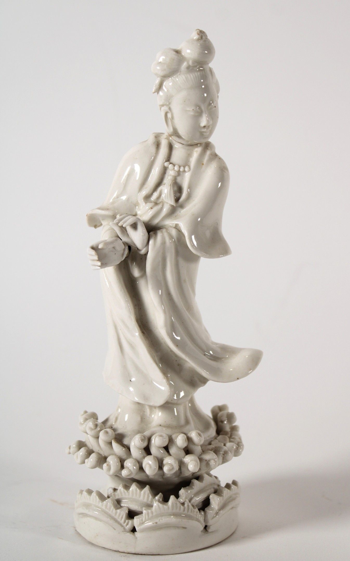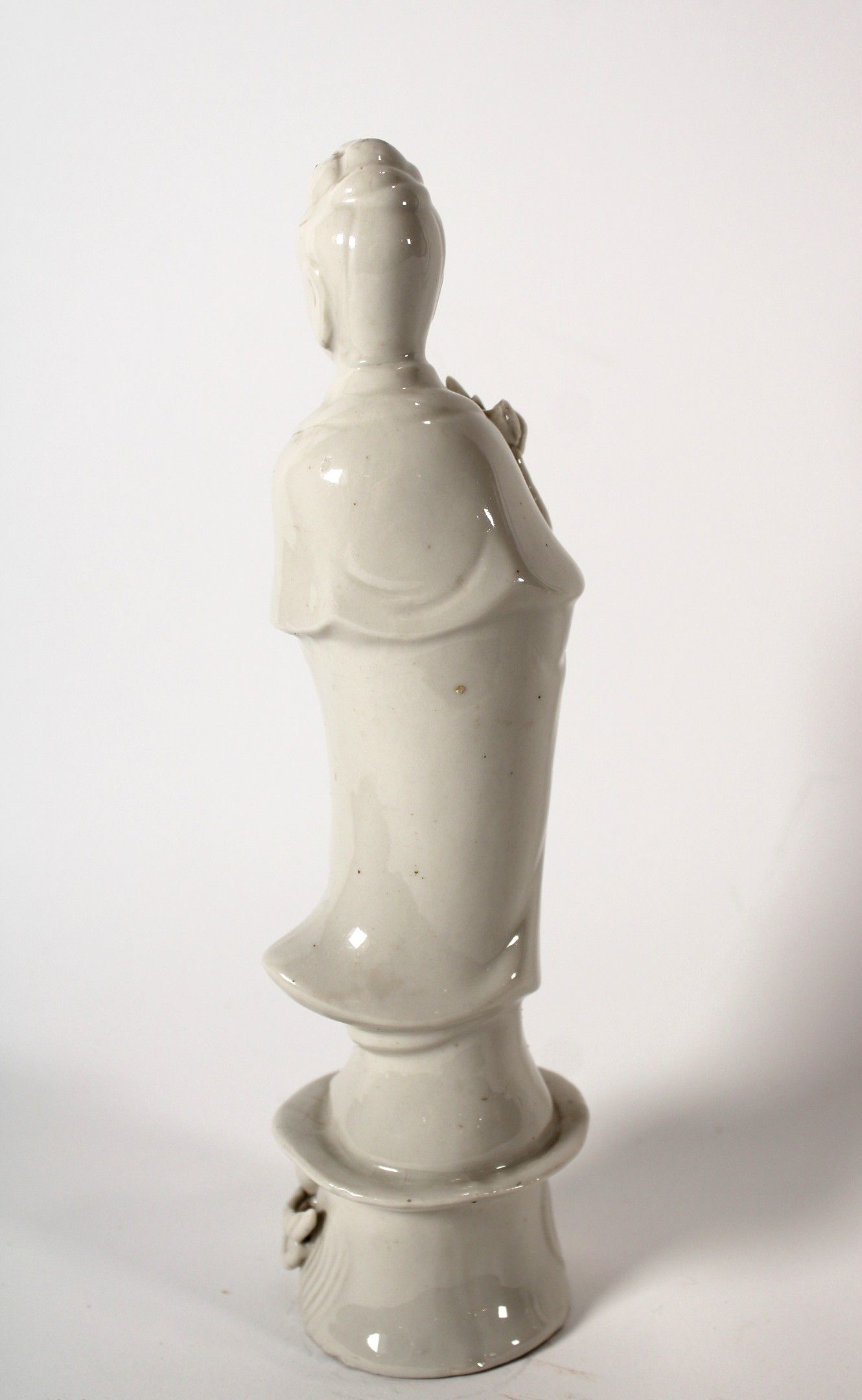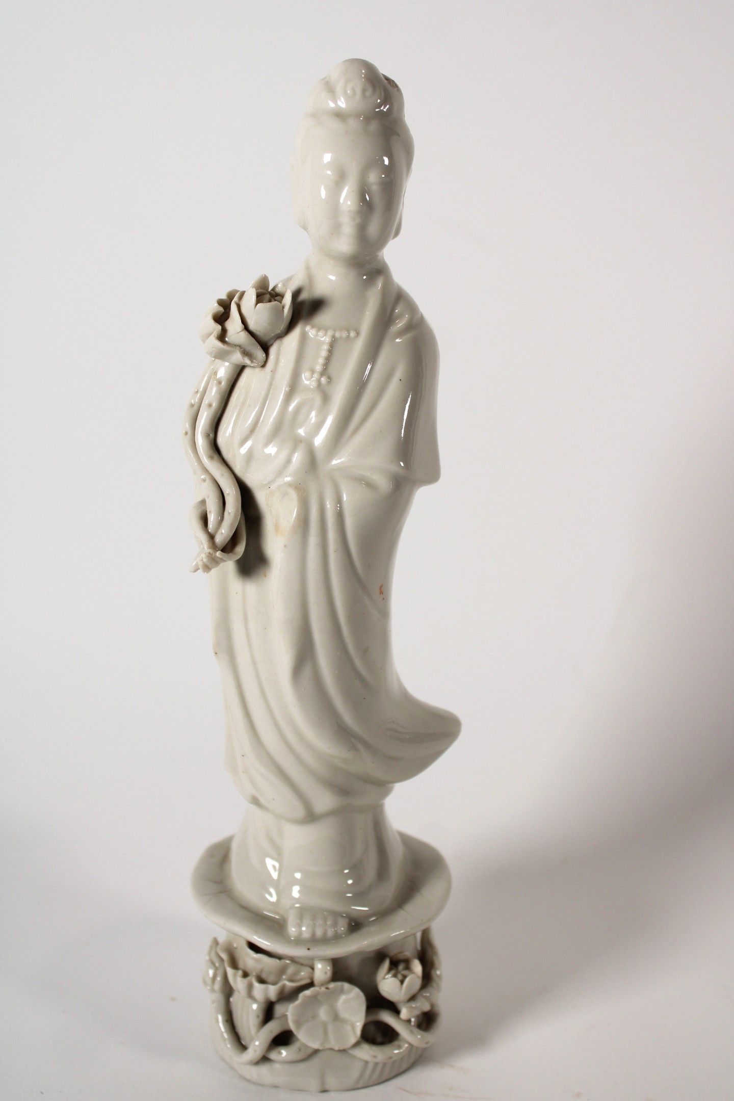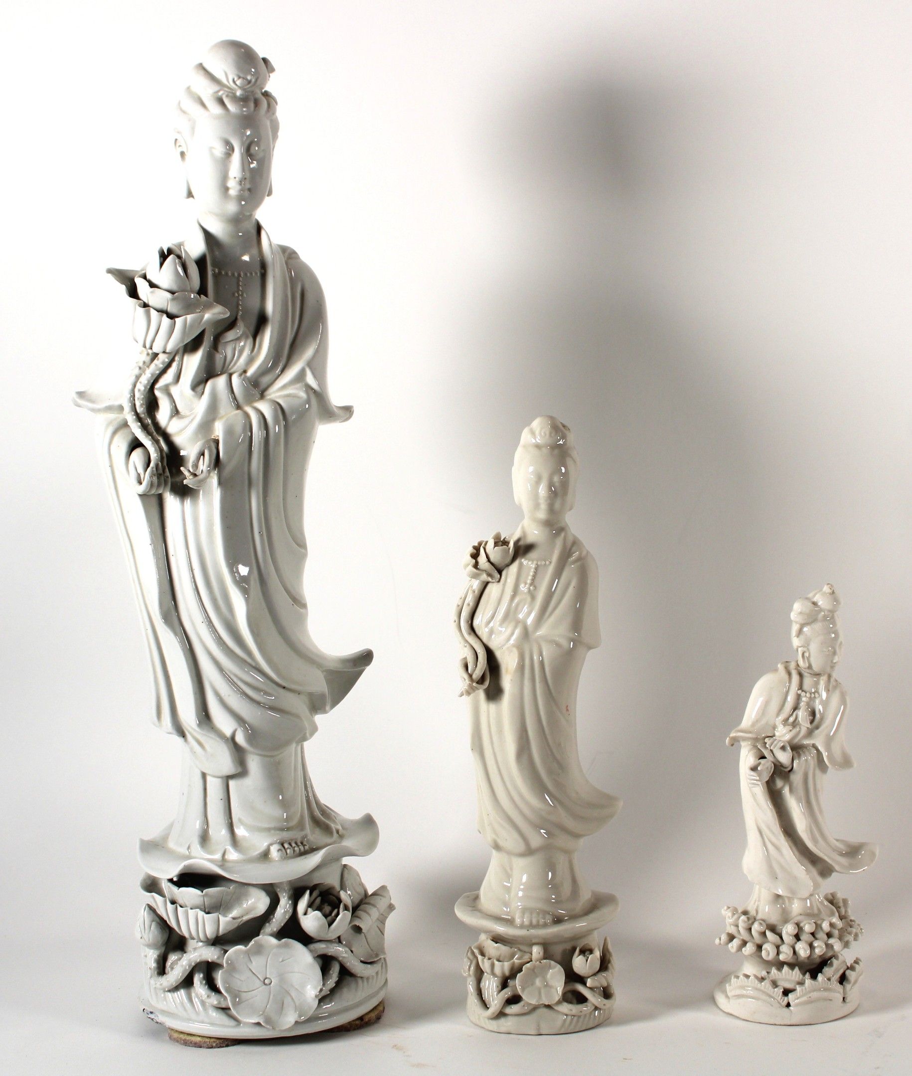 Set of three Chinese white statuettes representing Guanyin standing on stylised bases, holding lotus flowers. Production marks on two of them.