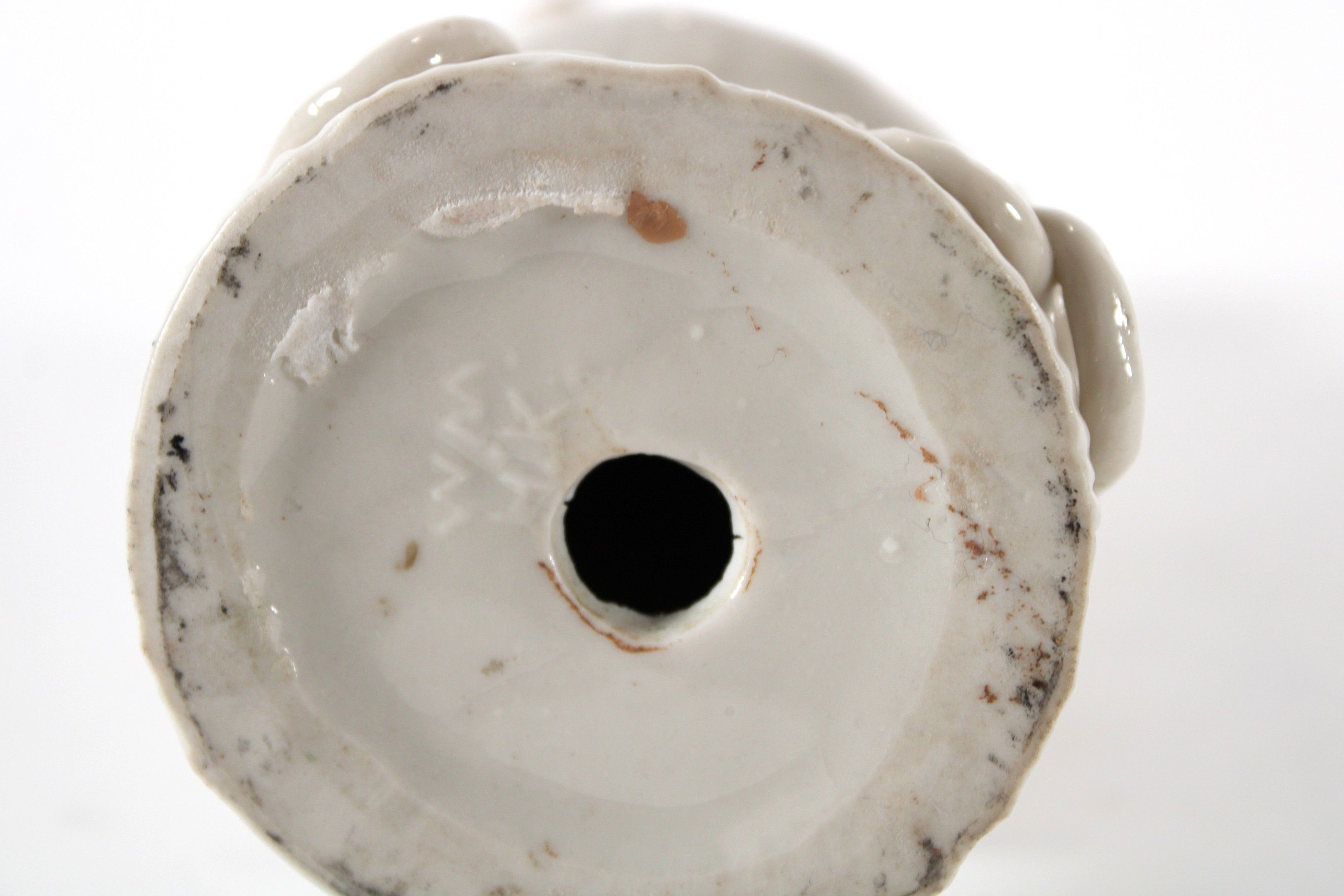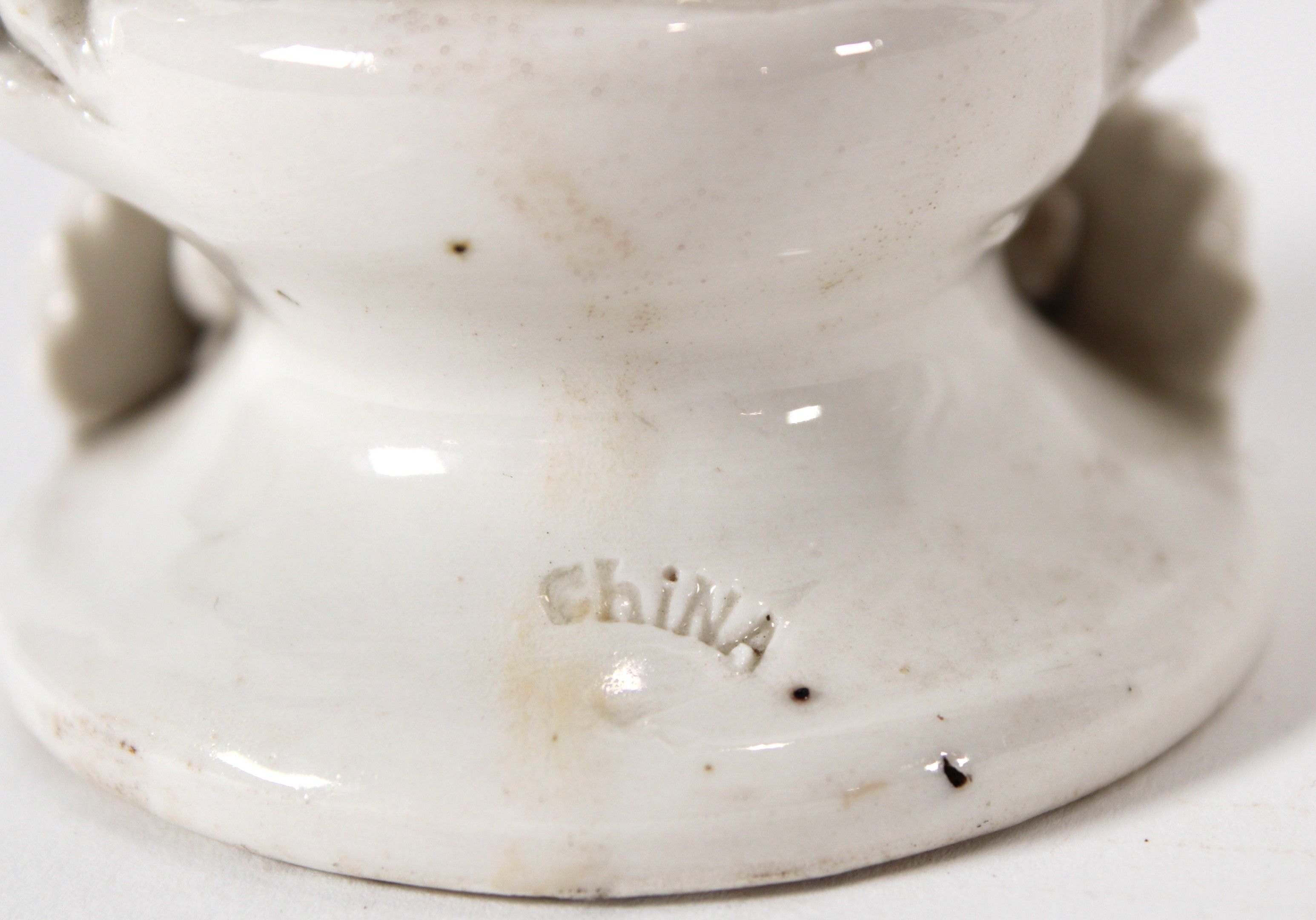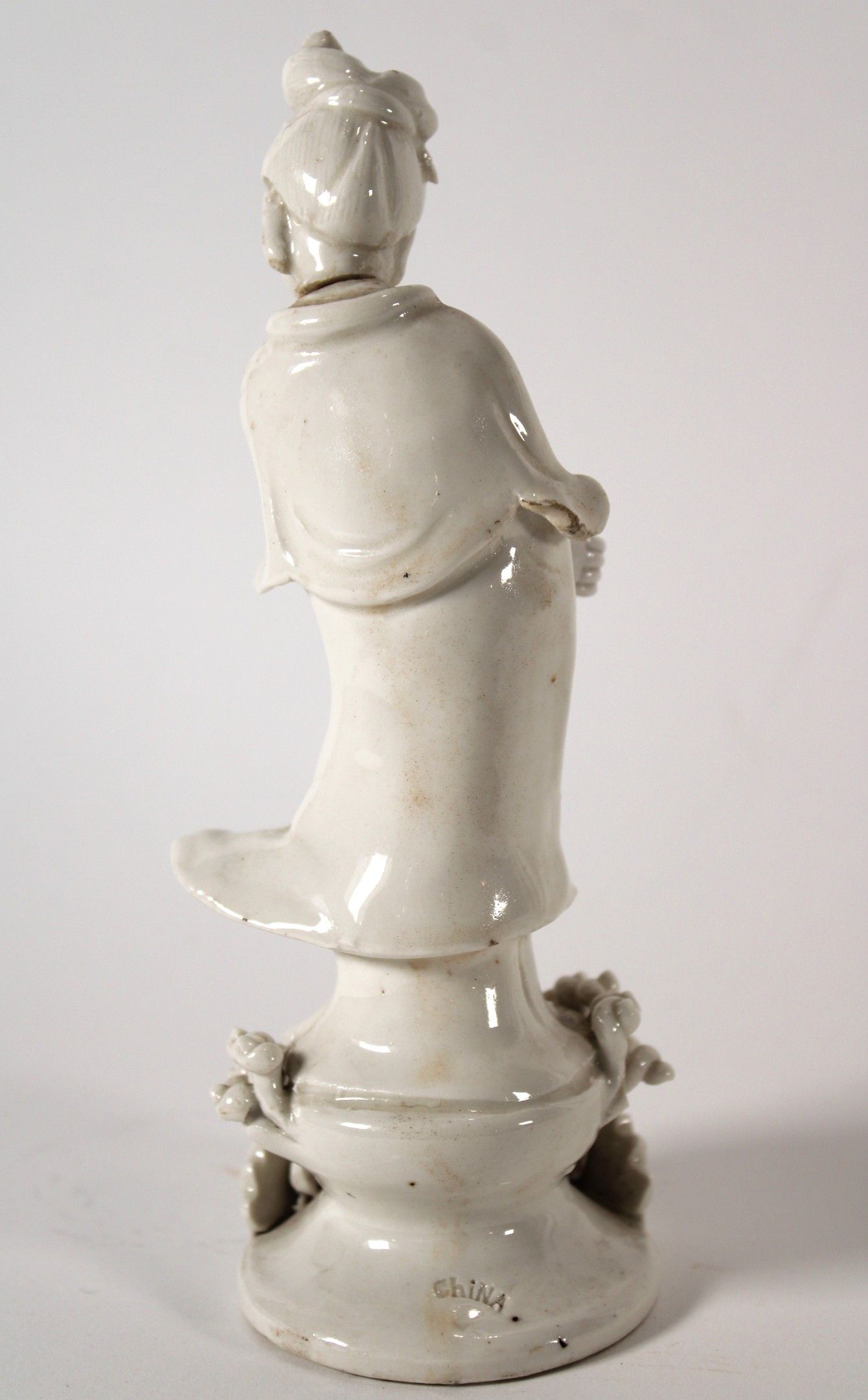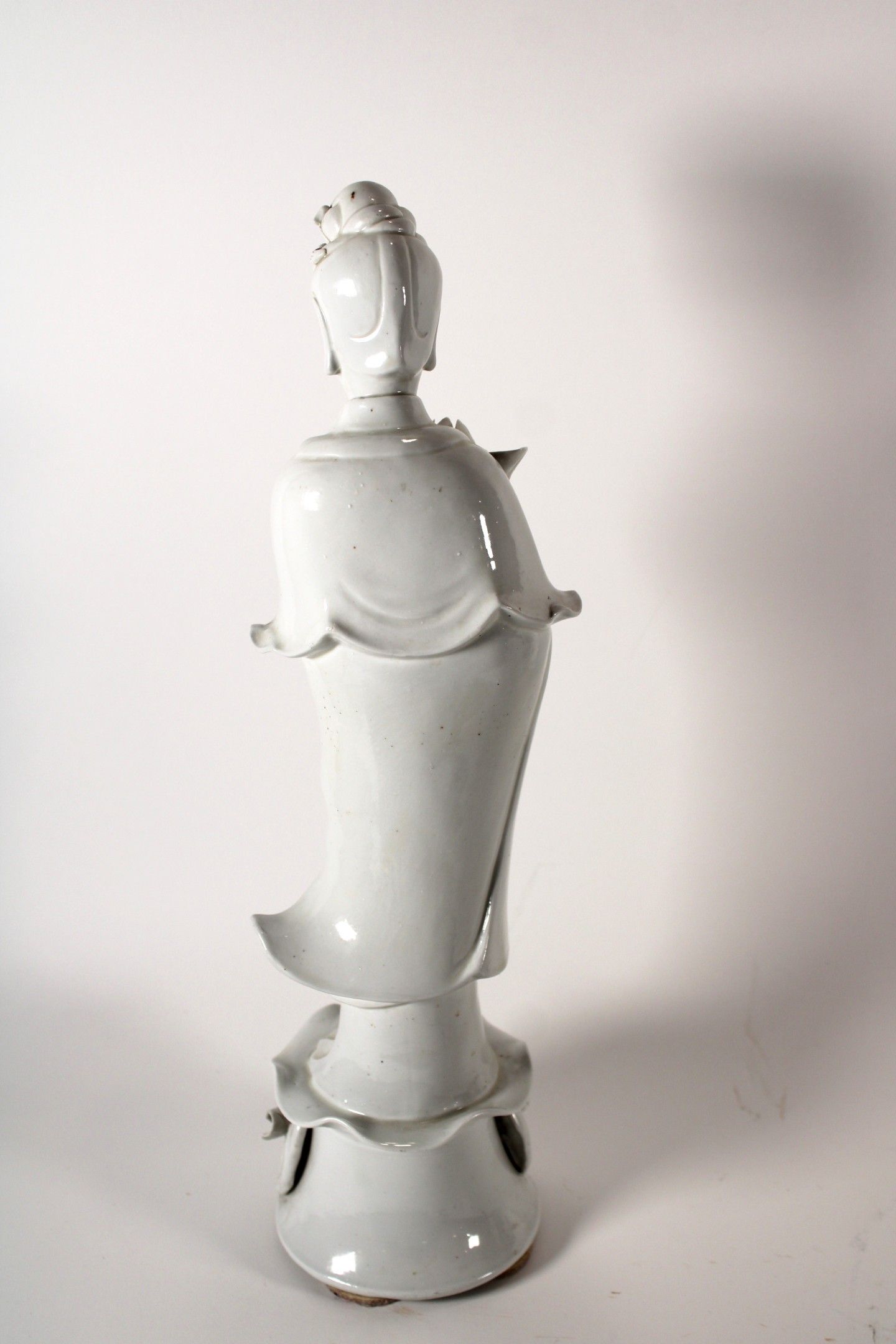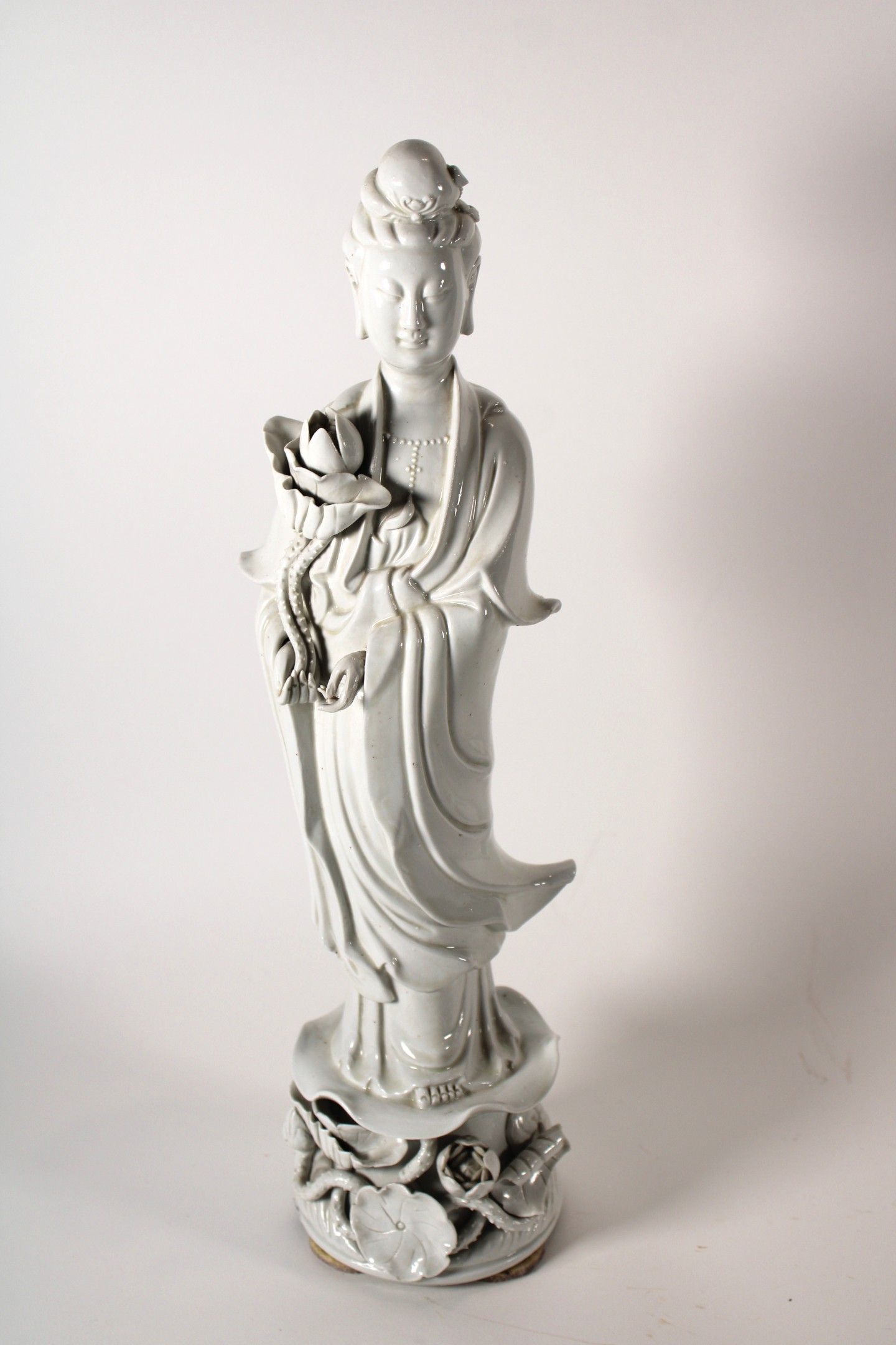 Set of three Chinese white statuettes representing Guanyin standing on stylised bases, holding lotus flowers. Production marks on two of them.