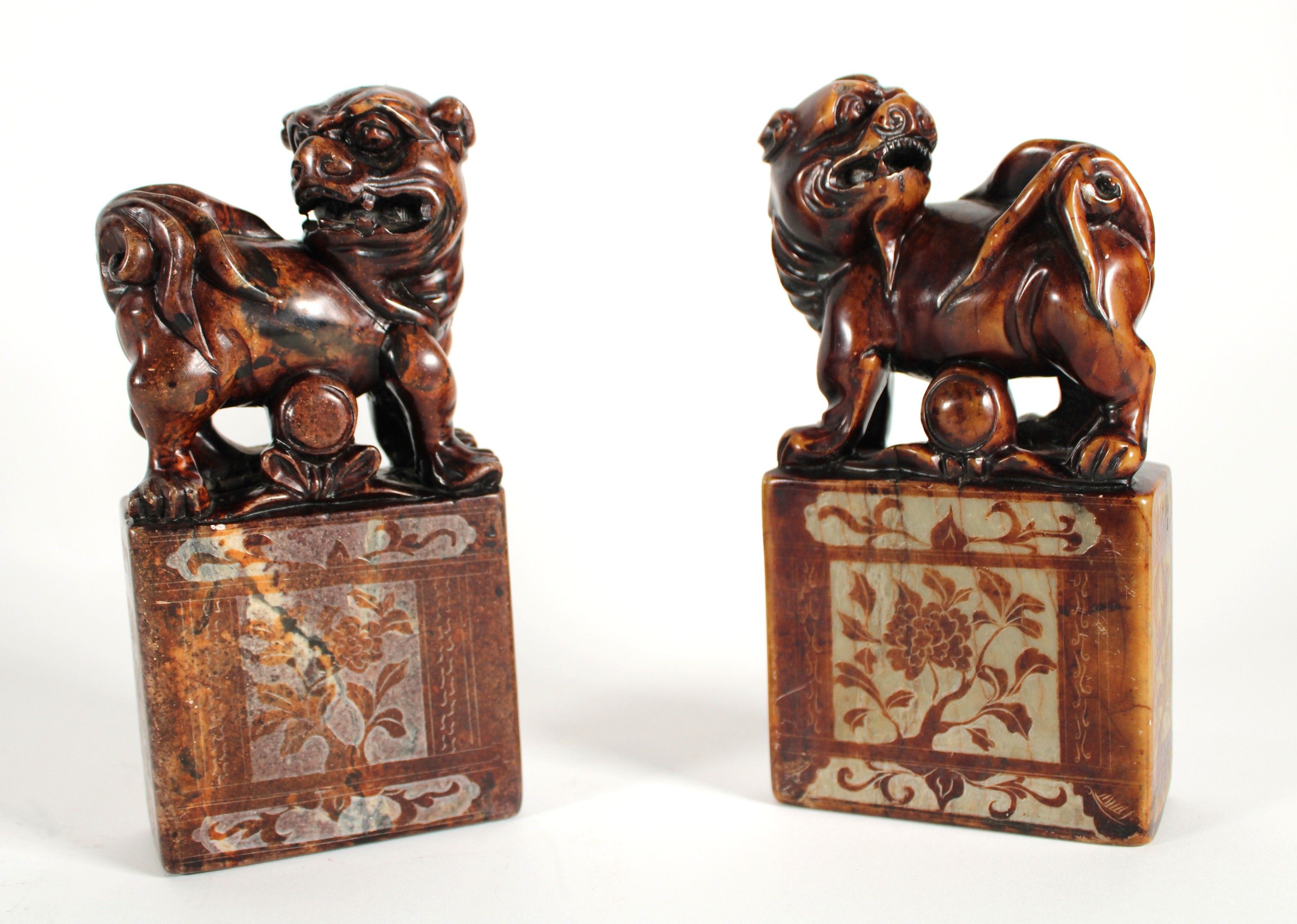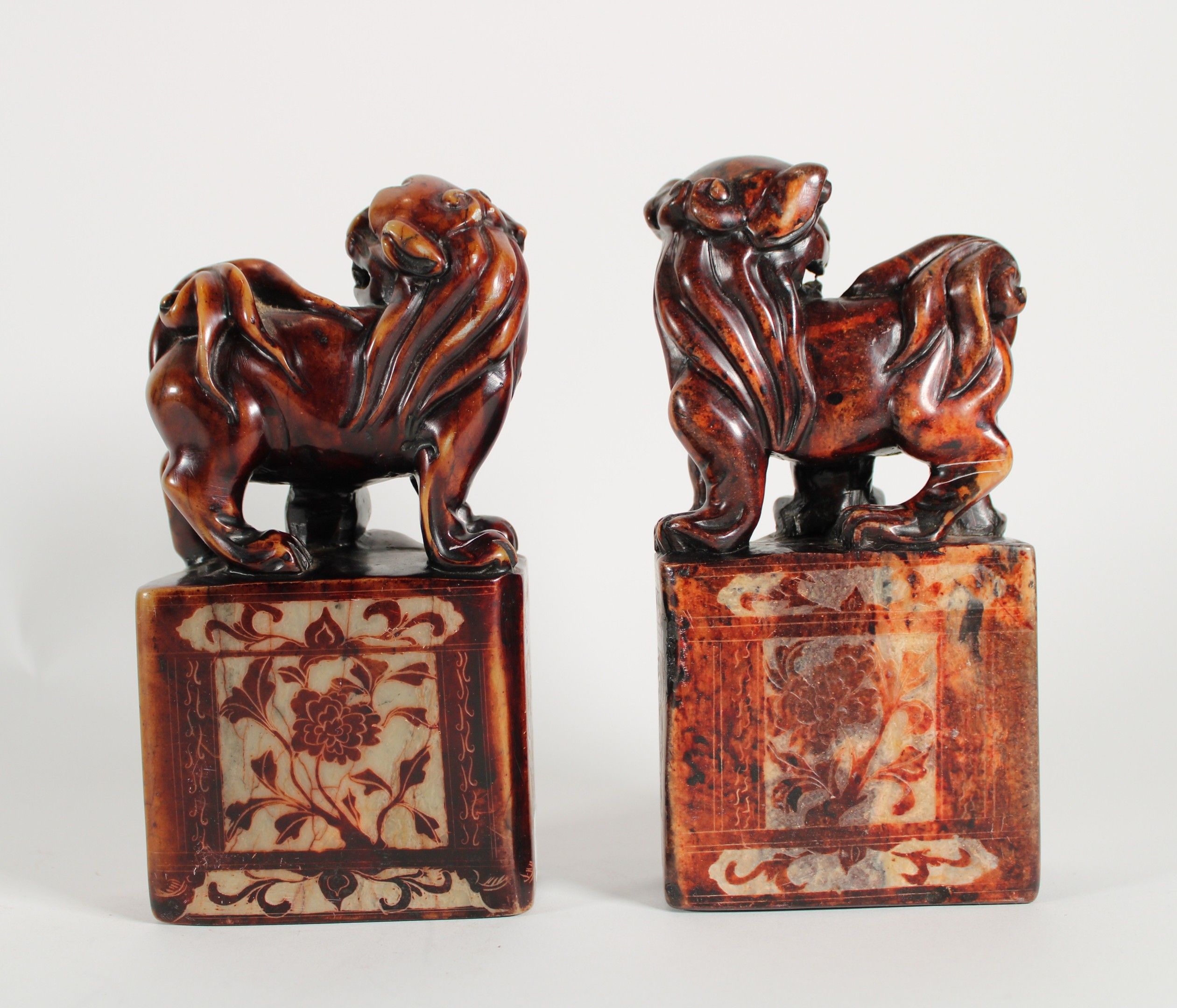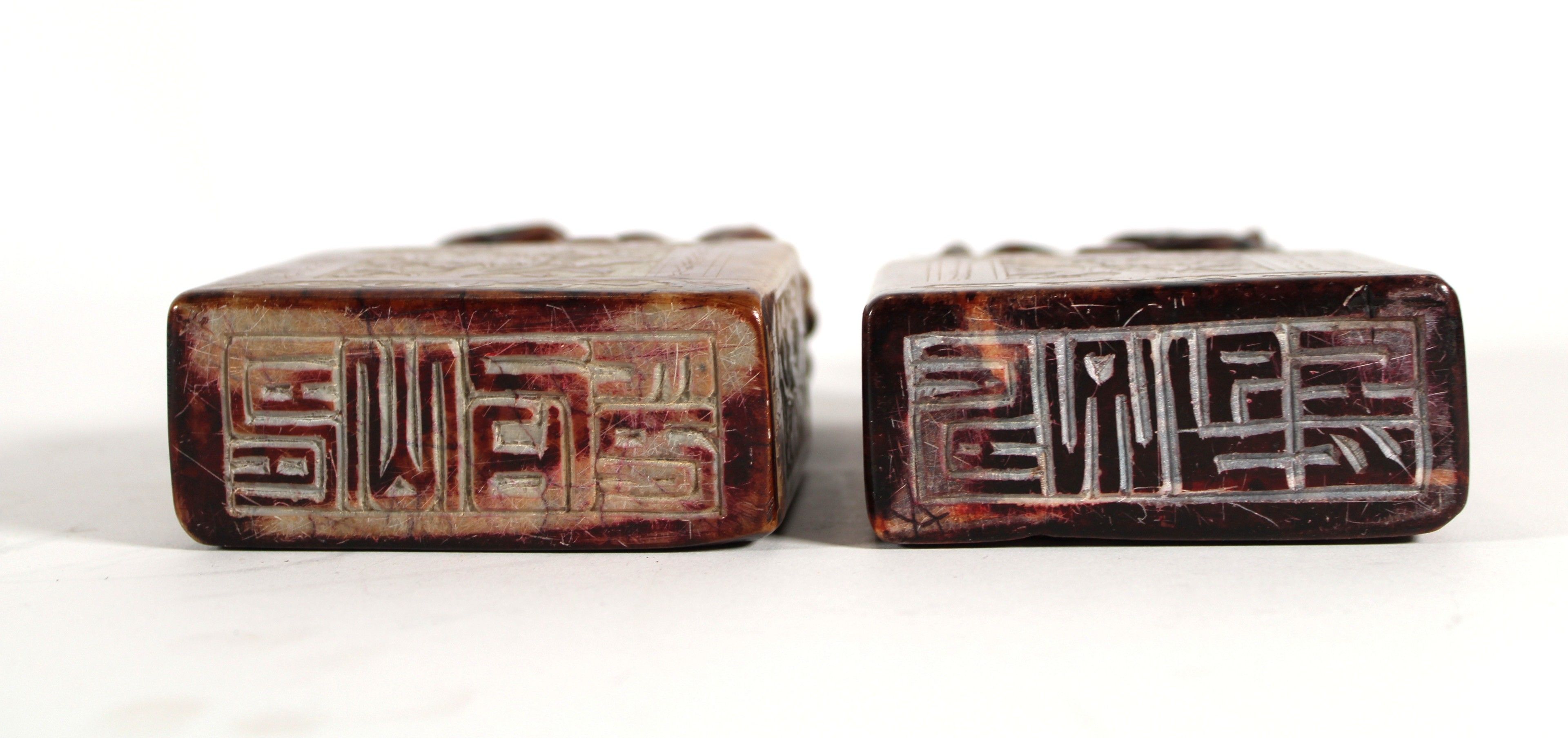 Pair of quadrangular soapstone seals surmounted by Fo dogs.