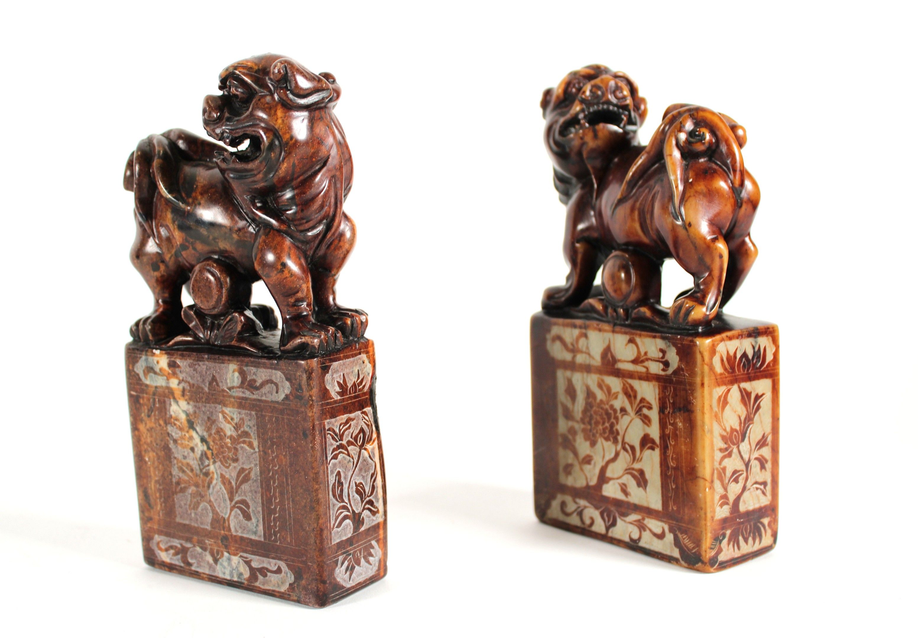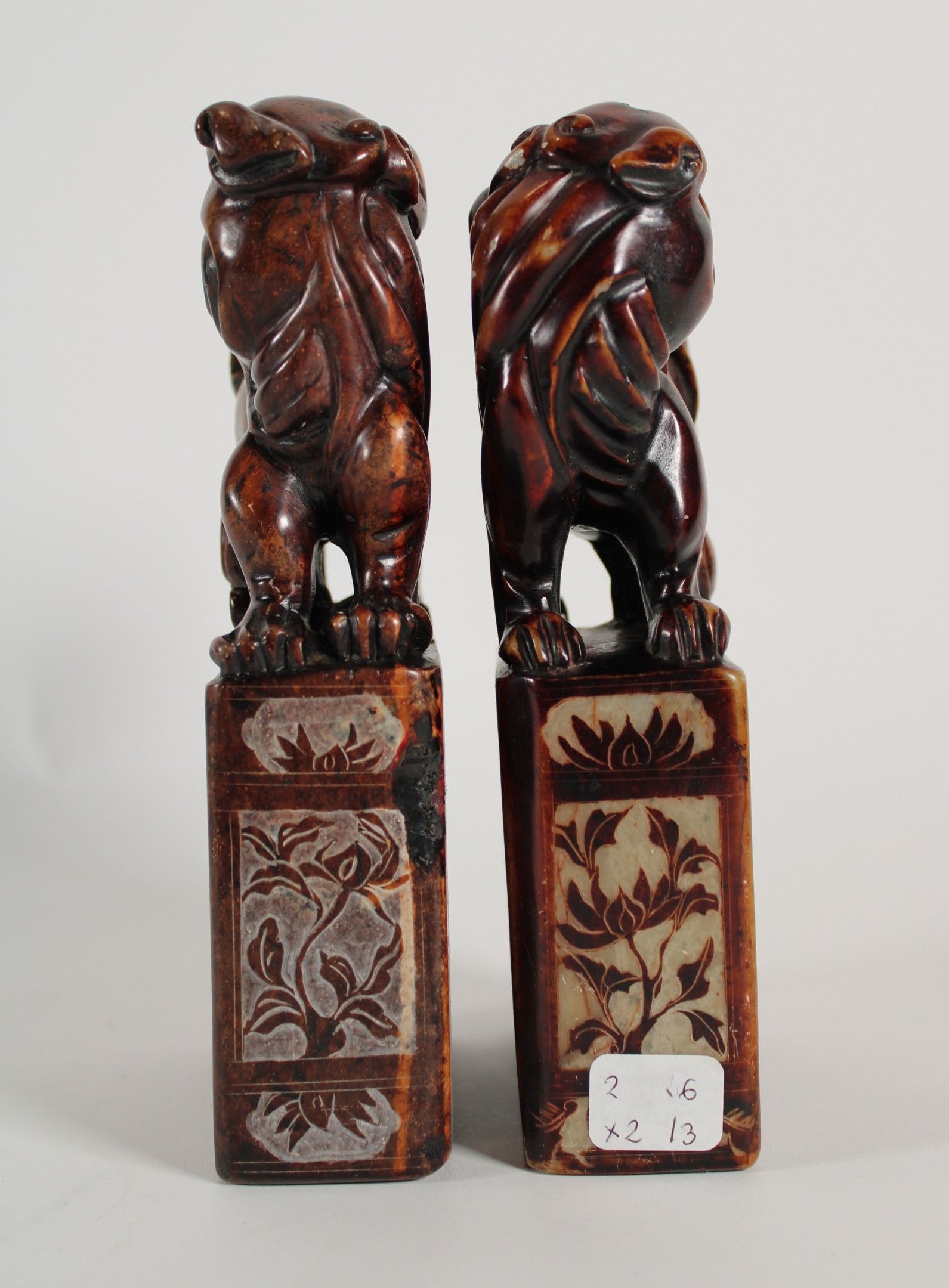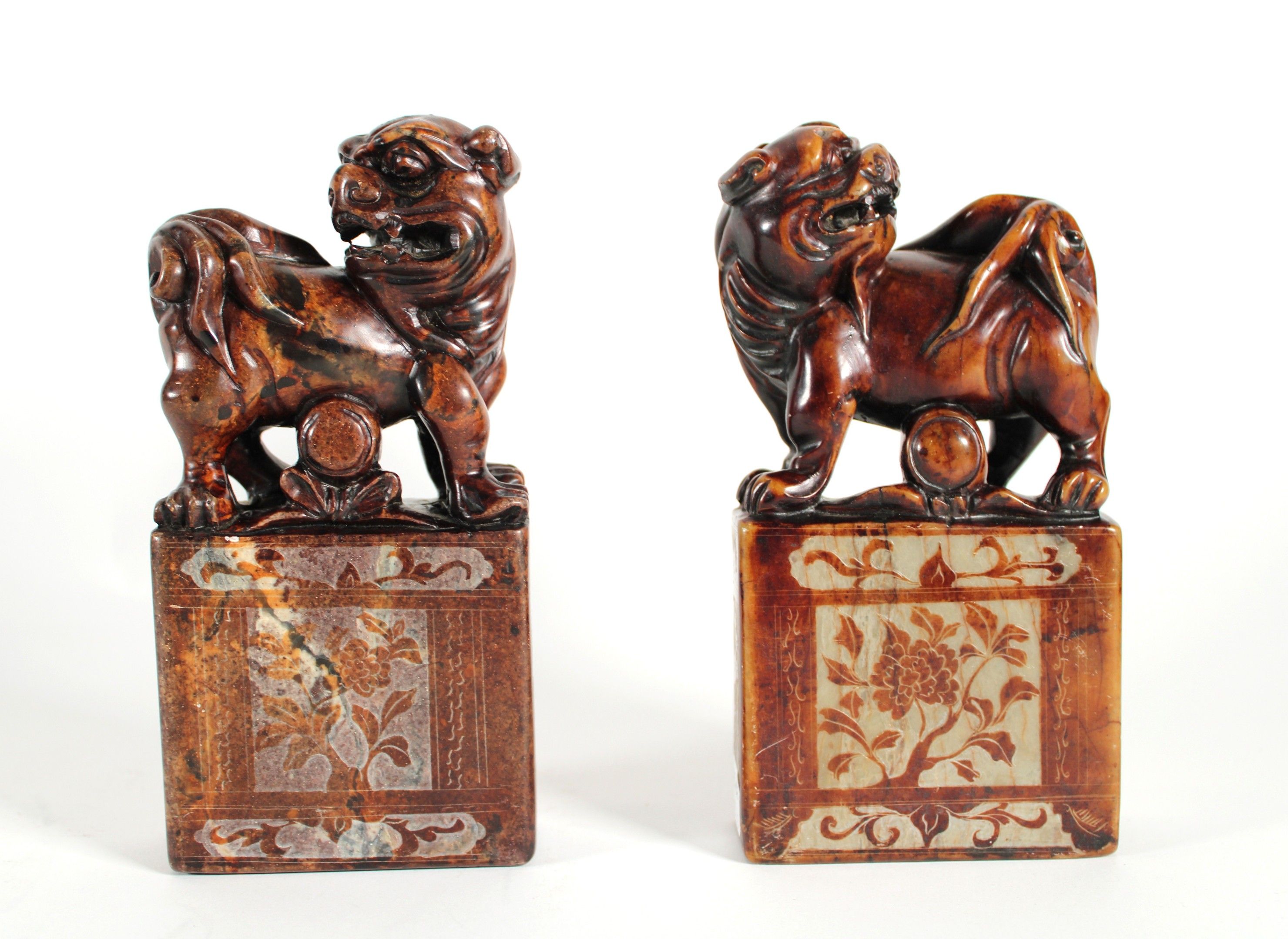Pair of quadrangular soapstone seals surmounted by Fo dogs.