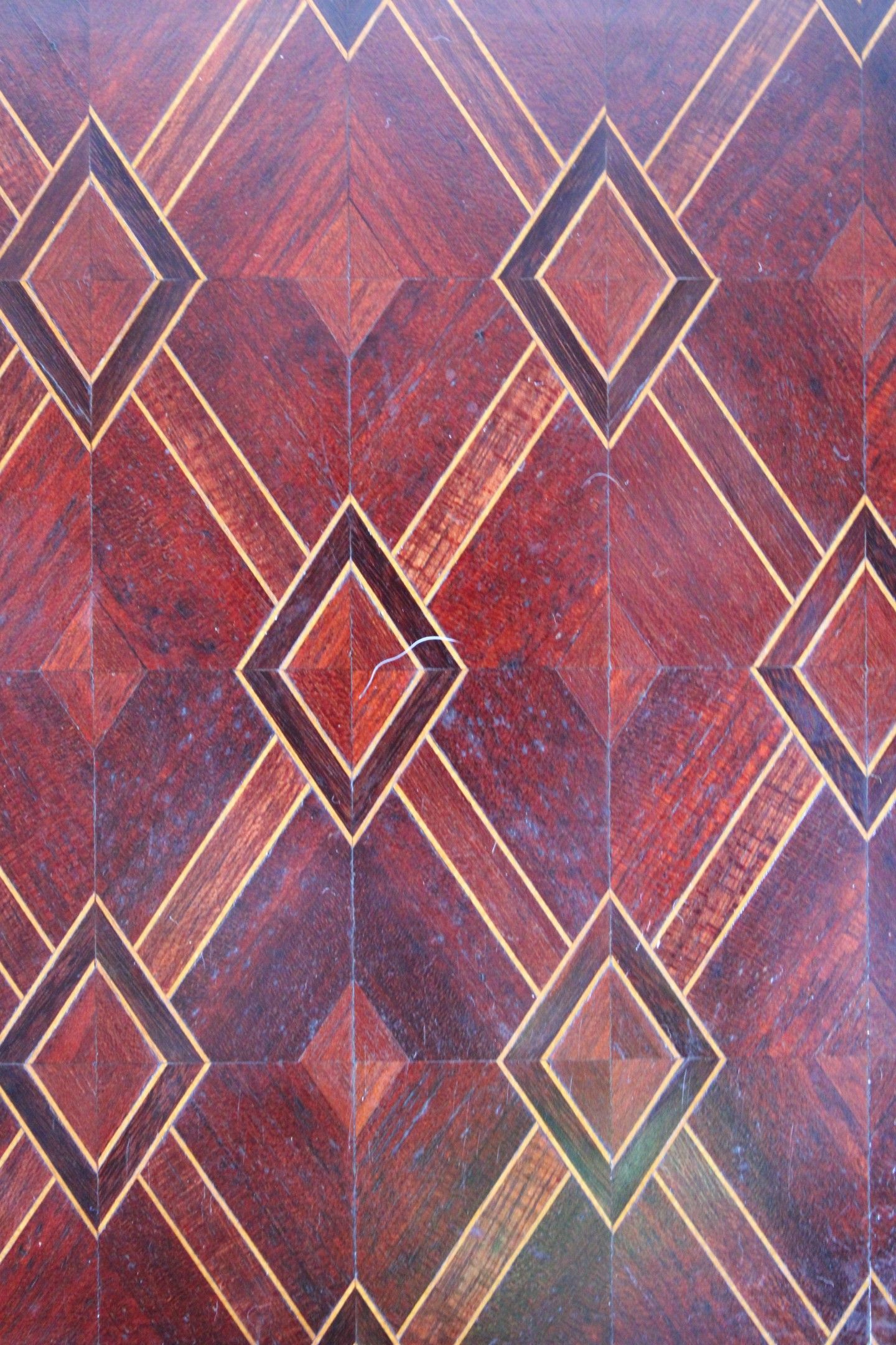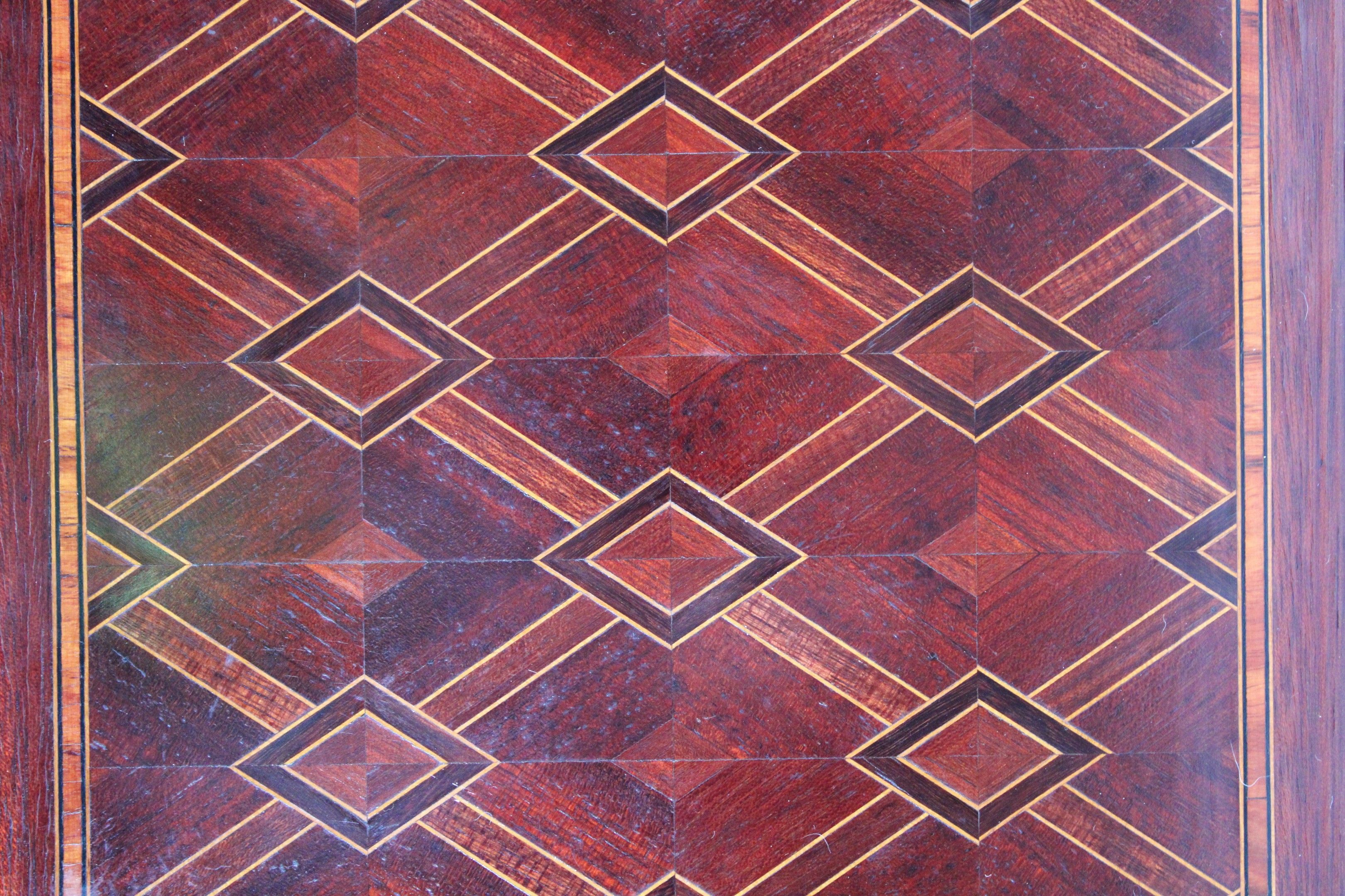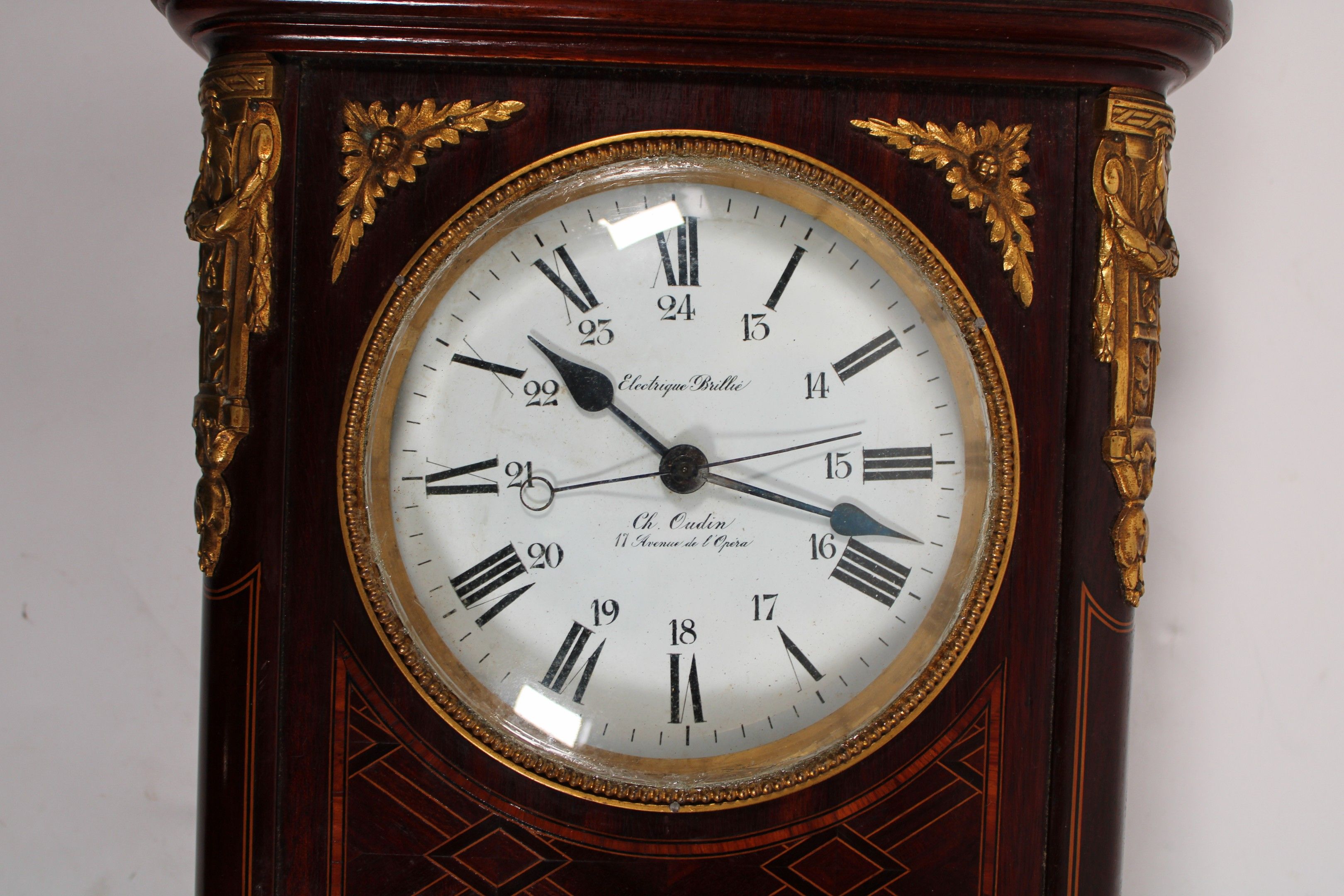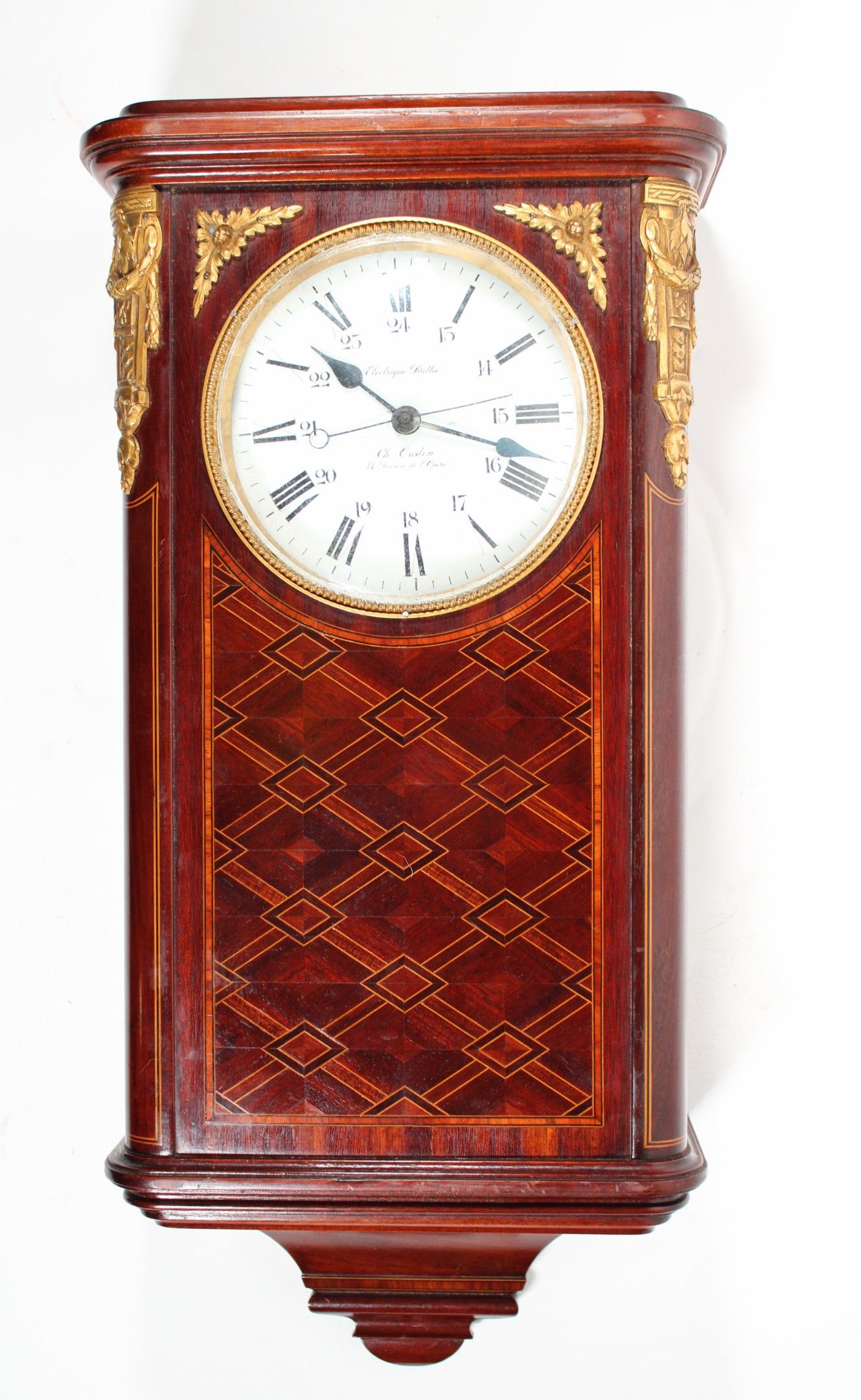 Marble and wood veneer wall clock with geometric marquetry decoration. The circular white enamelled dial with Roman and Arabic numerals in black, signed Charles Oudin 17 avenue de l'Opéra and marked "Electriqué Barillé".