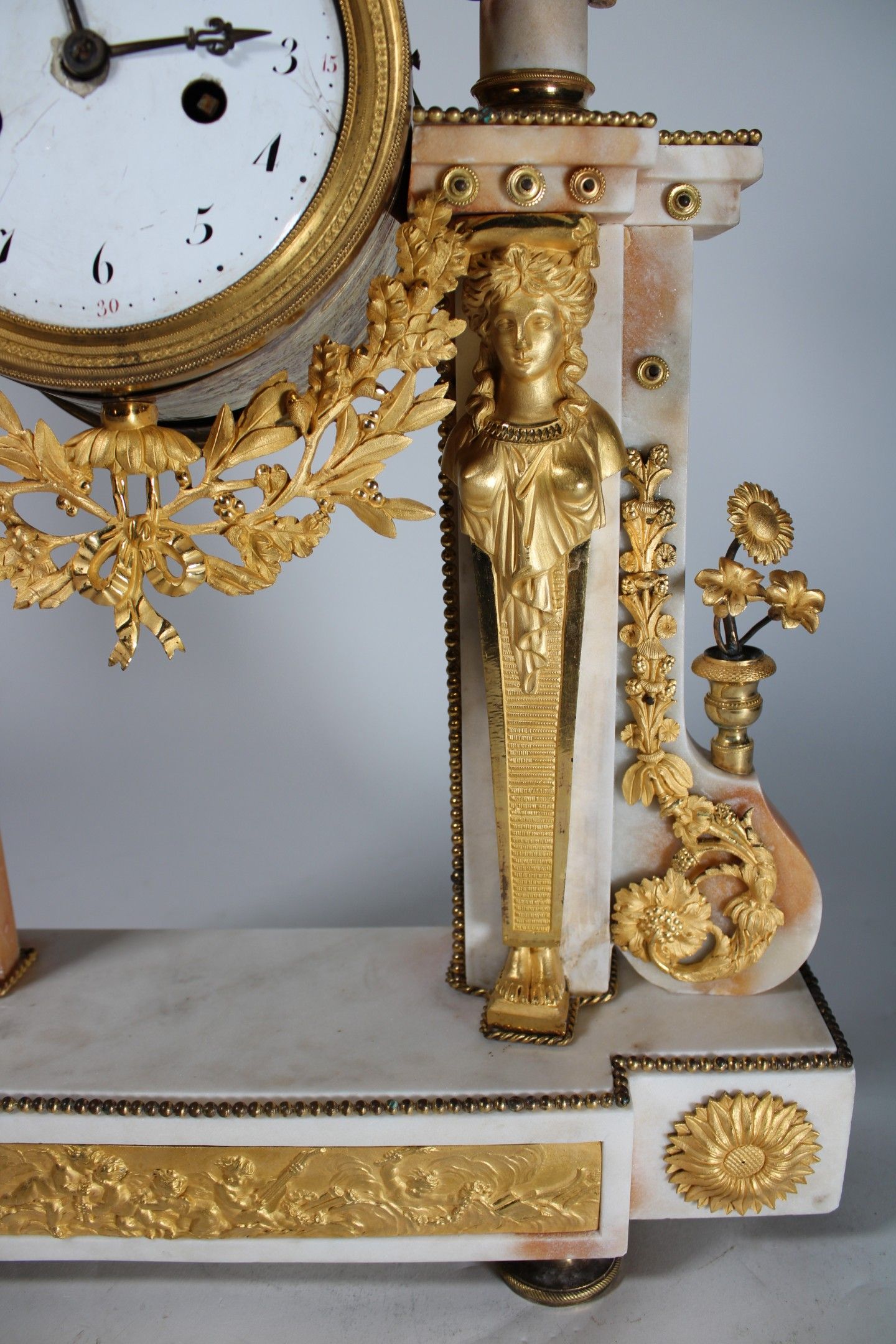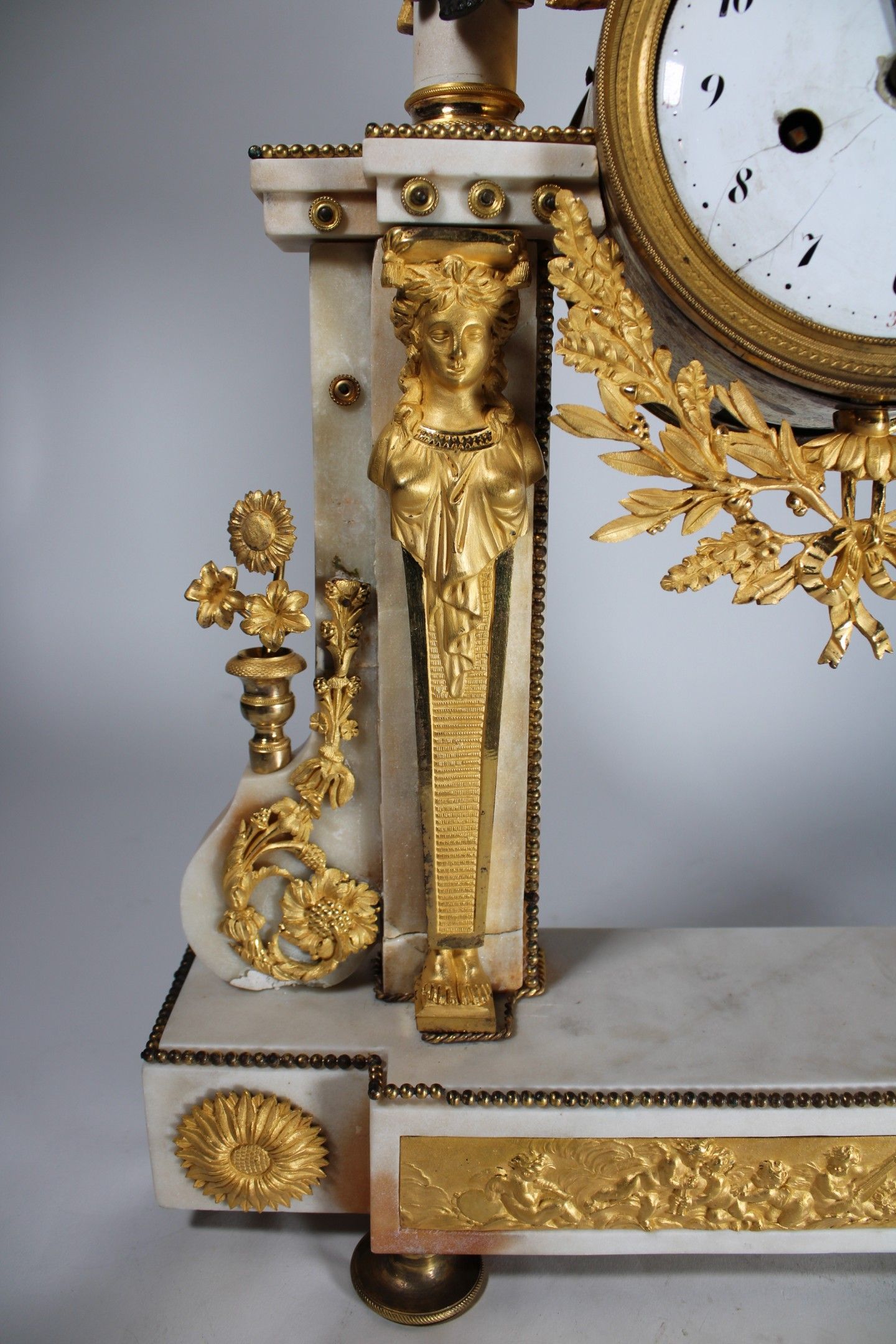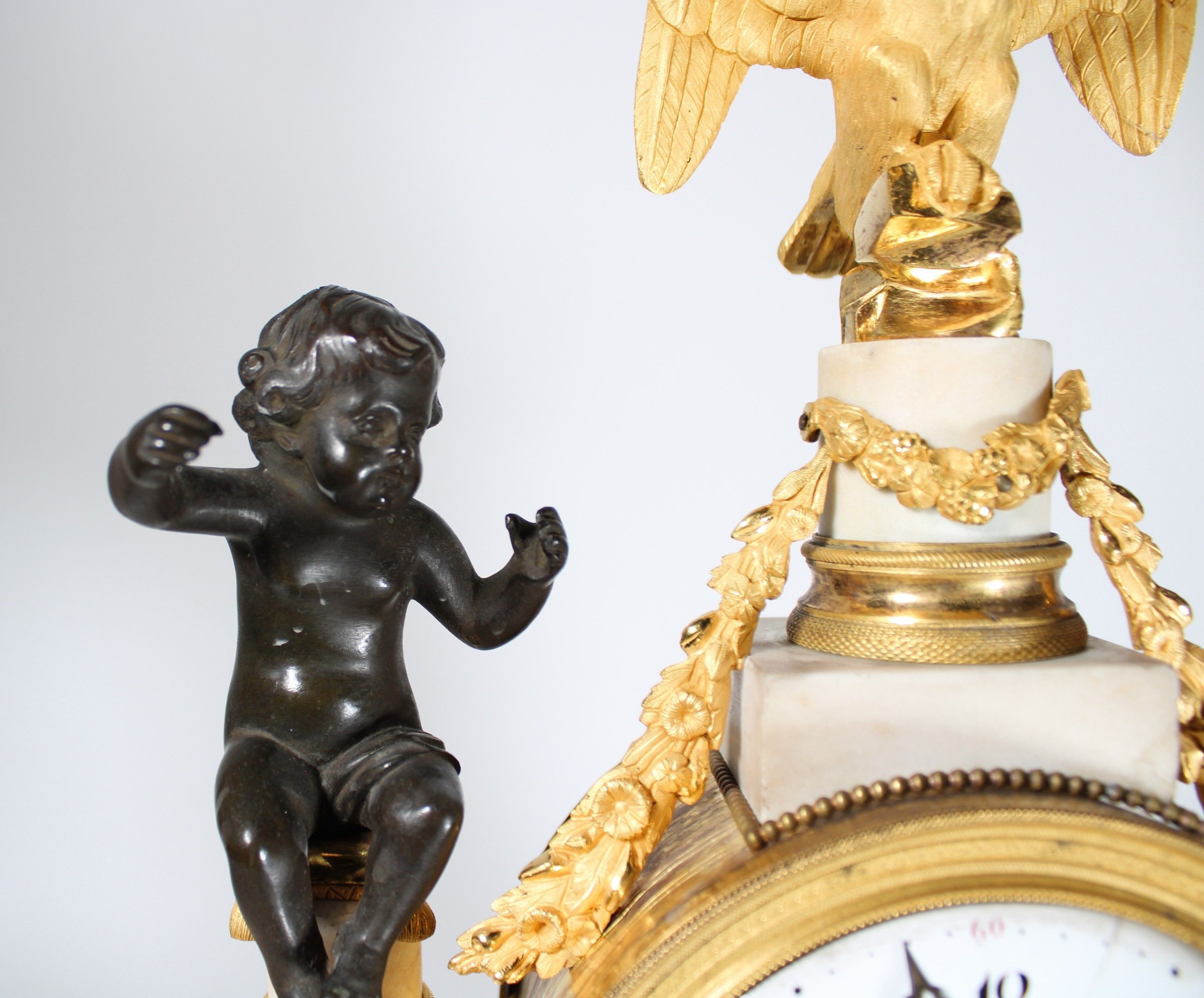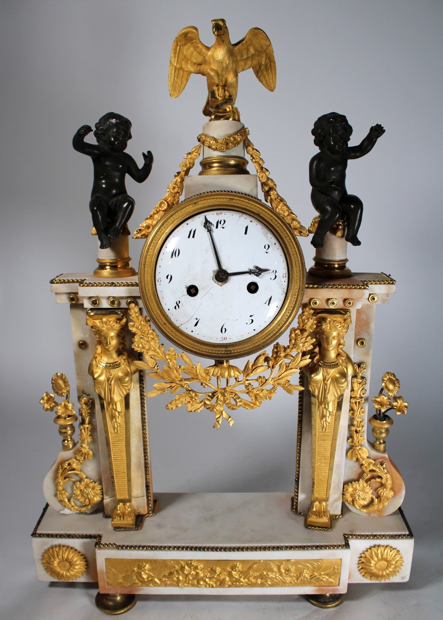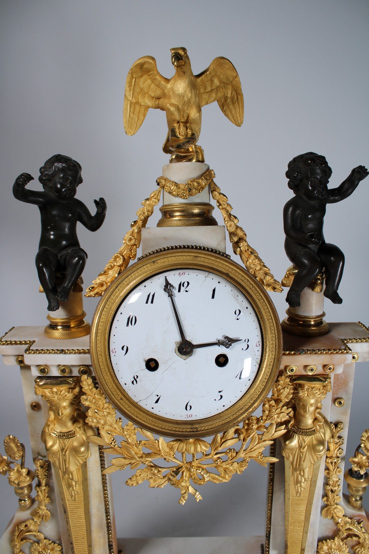 Portico clock in white marble and chased ormolu with a dial on an enamelled plate (cracks) with Arabic numerals surmounted by an eagle and black patina putti and surrounded by columns with caryatids and foliate scrolls. Bas-relief base decorated with cherubs.