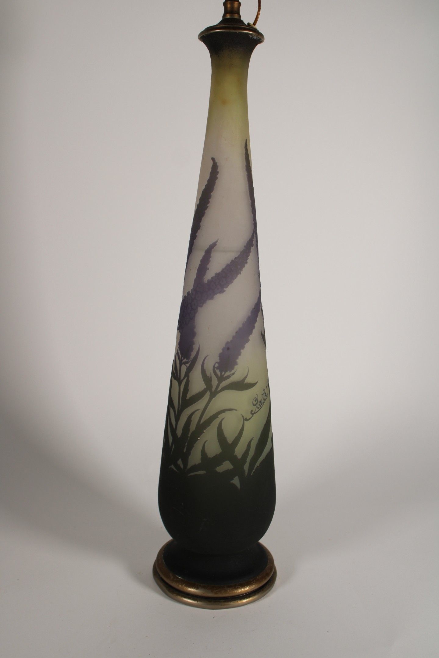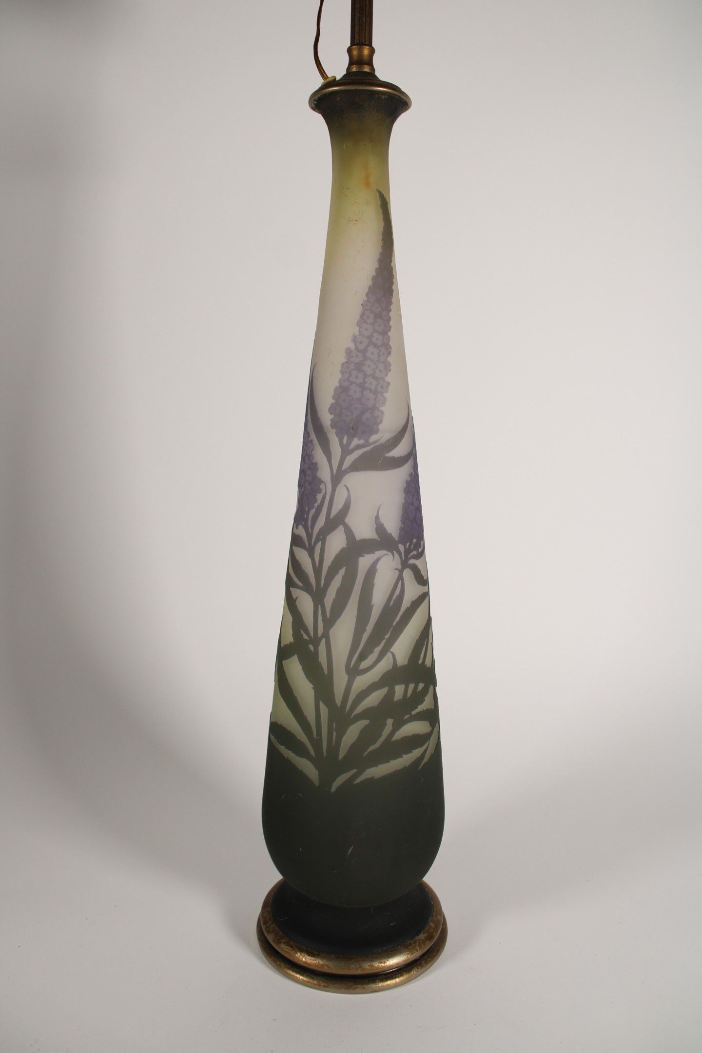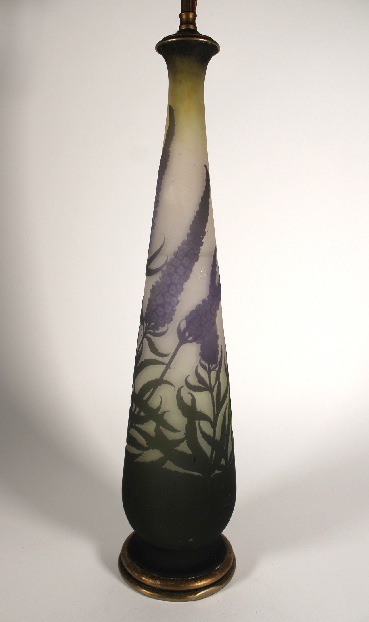 A slender baluster vase on a pedestal in acid-etched multi-layered glass with a buddleia design on a green and white background.