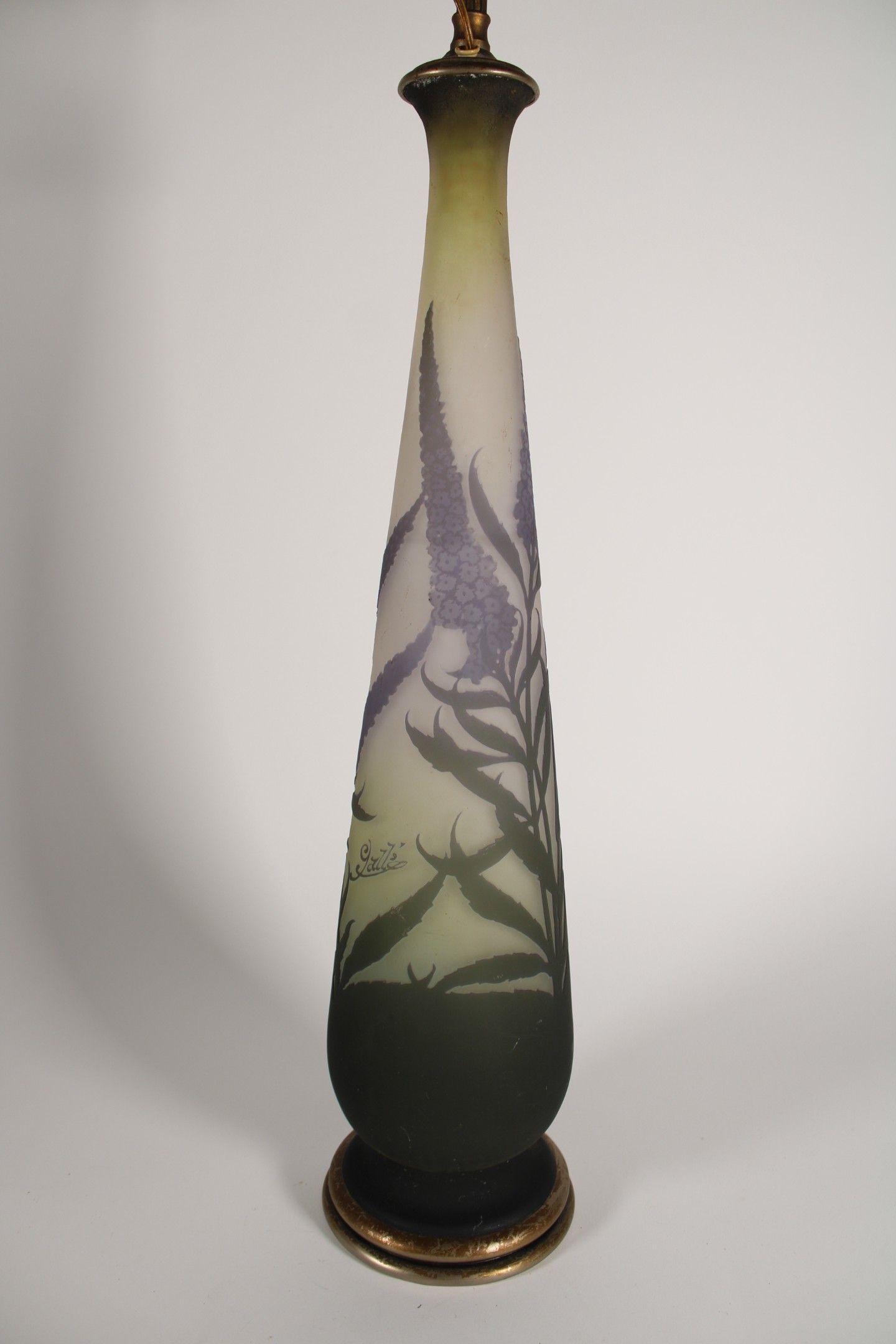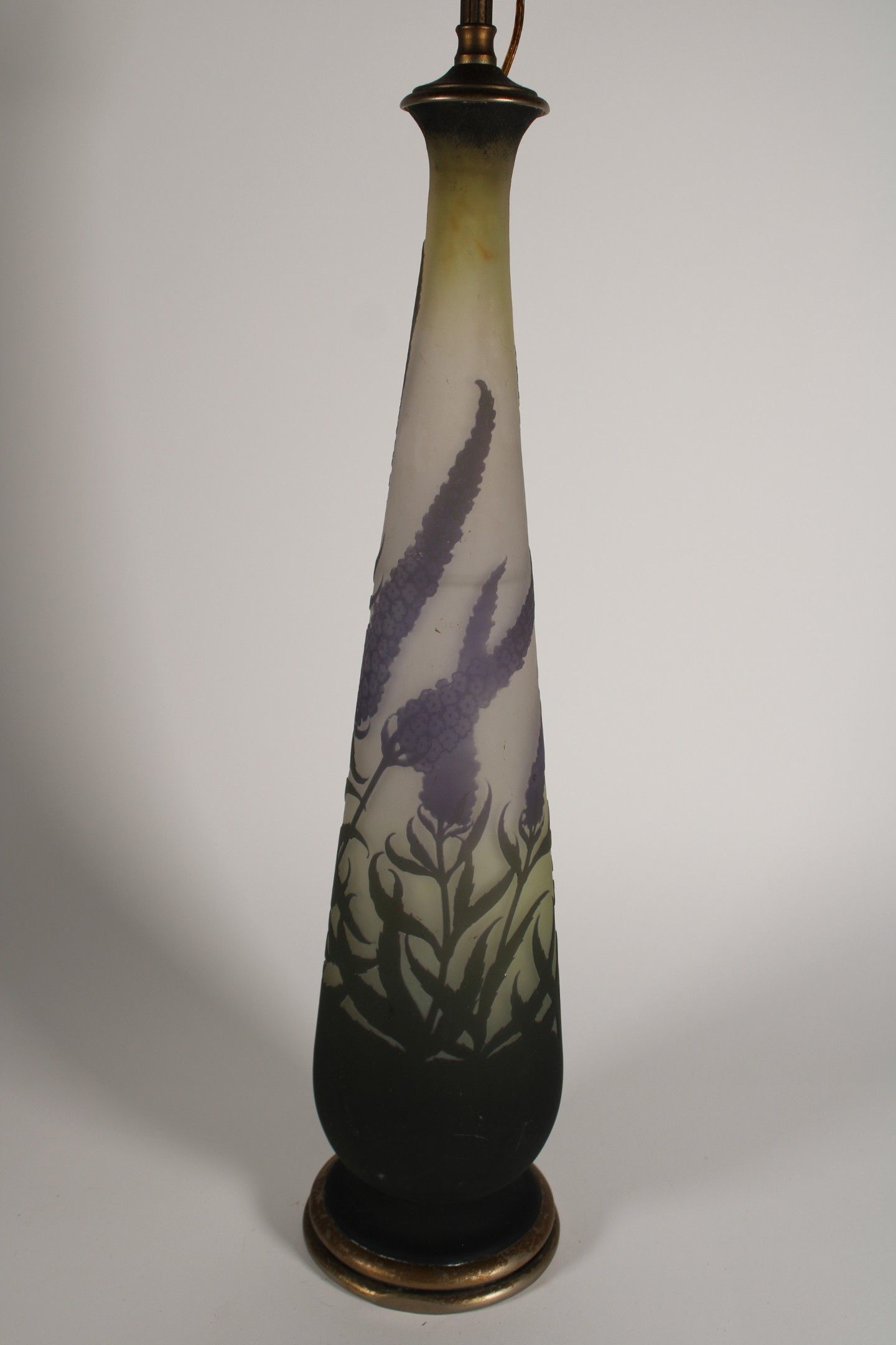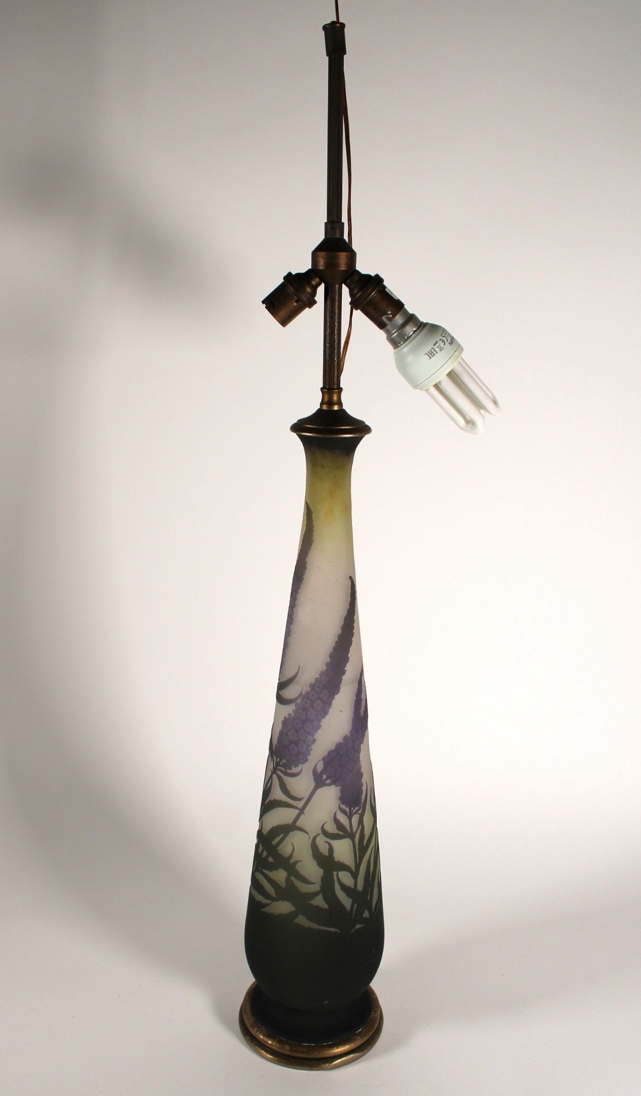 A slender baluster vase on a pedestal in acid-etched multi-layered glass with a buddleia design on a green and white background.