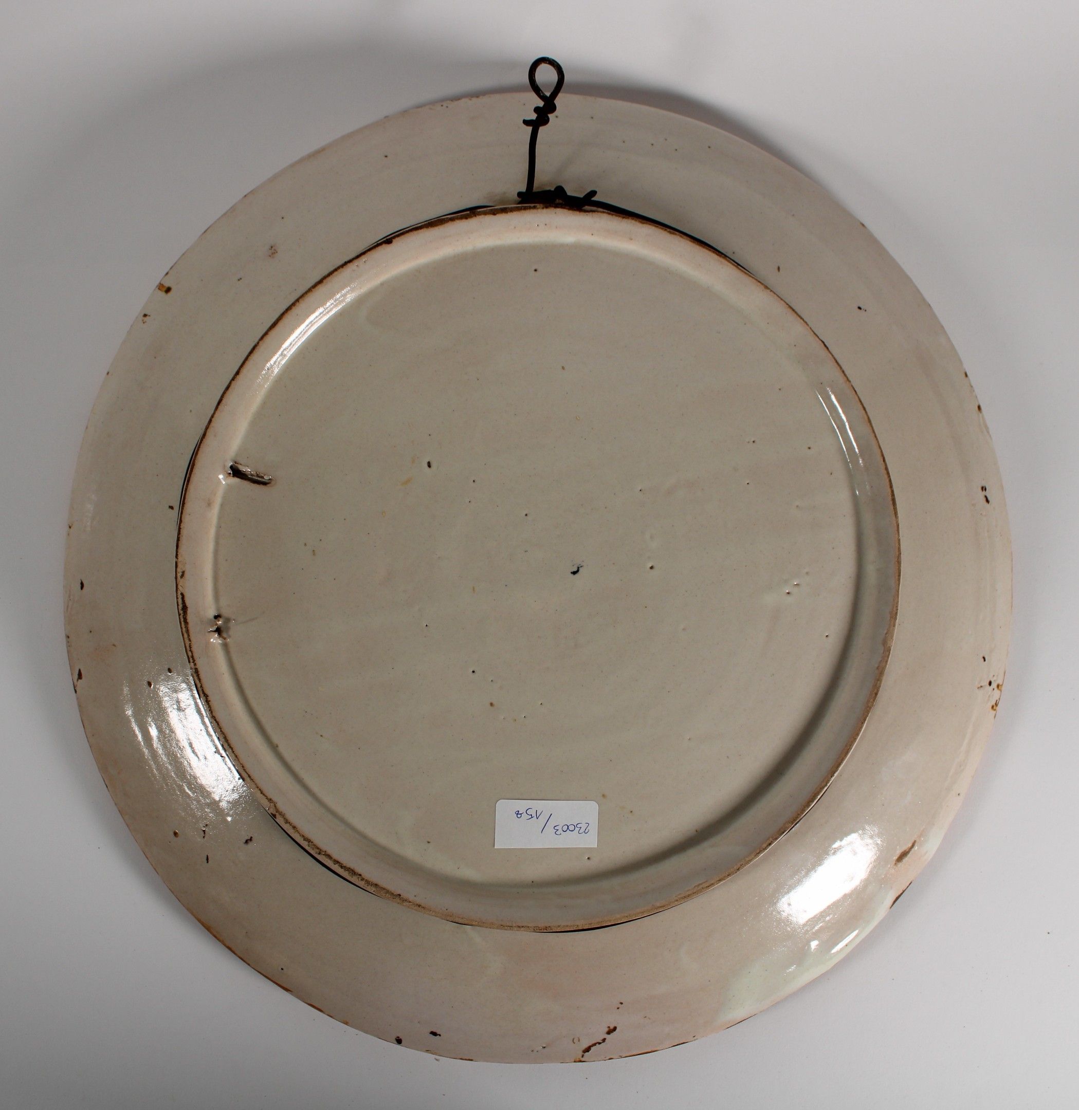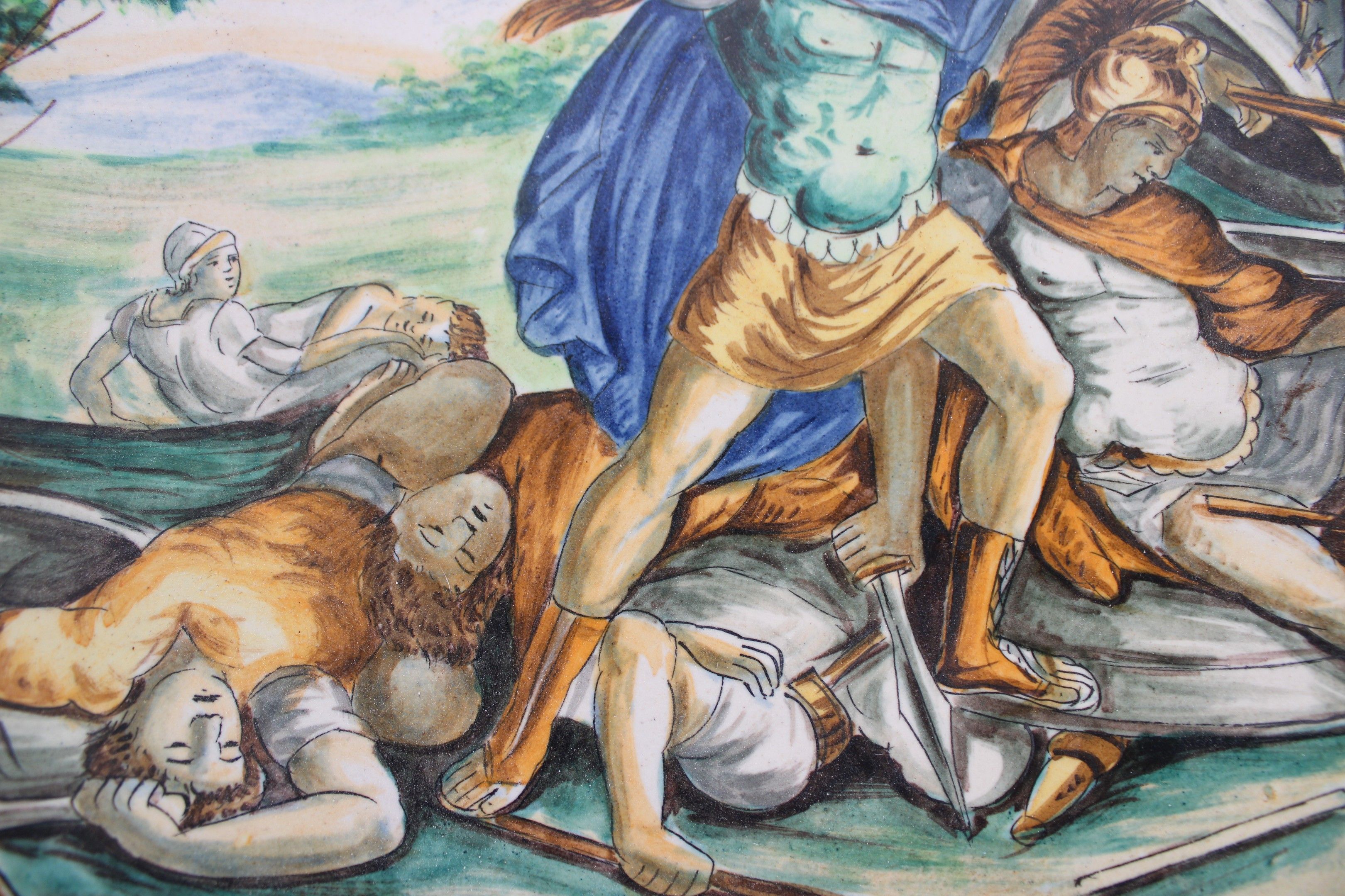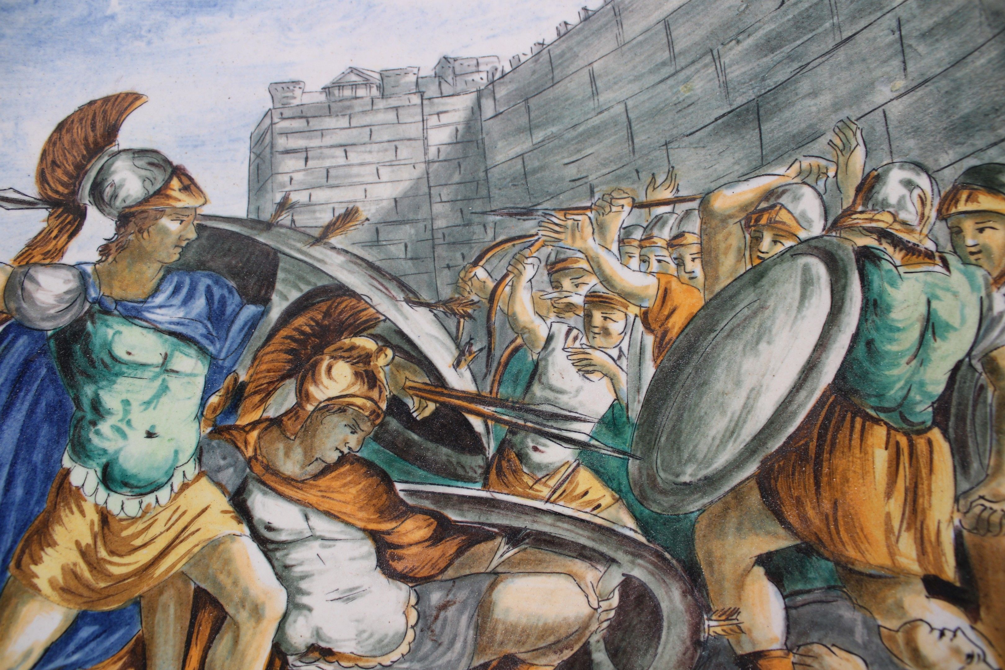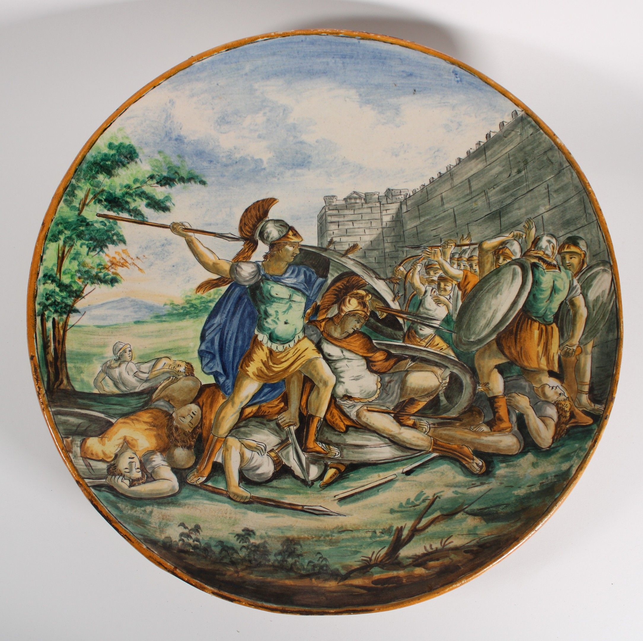 A large polychrome glazed earthenware dish decorated with a battle scene in front of a fortress.