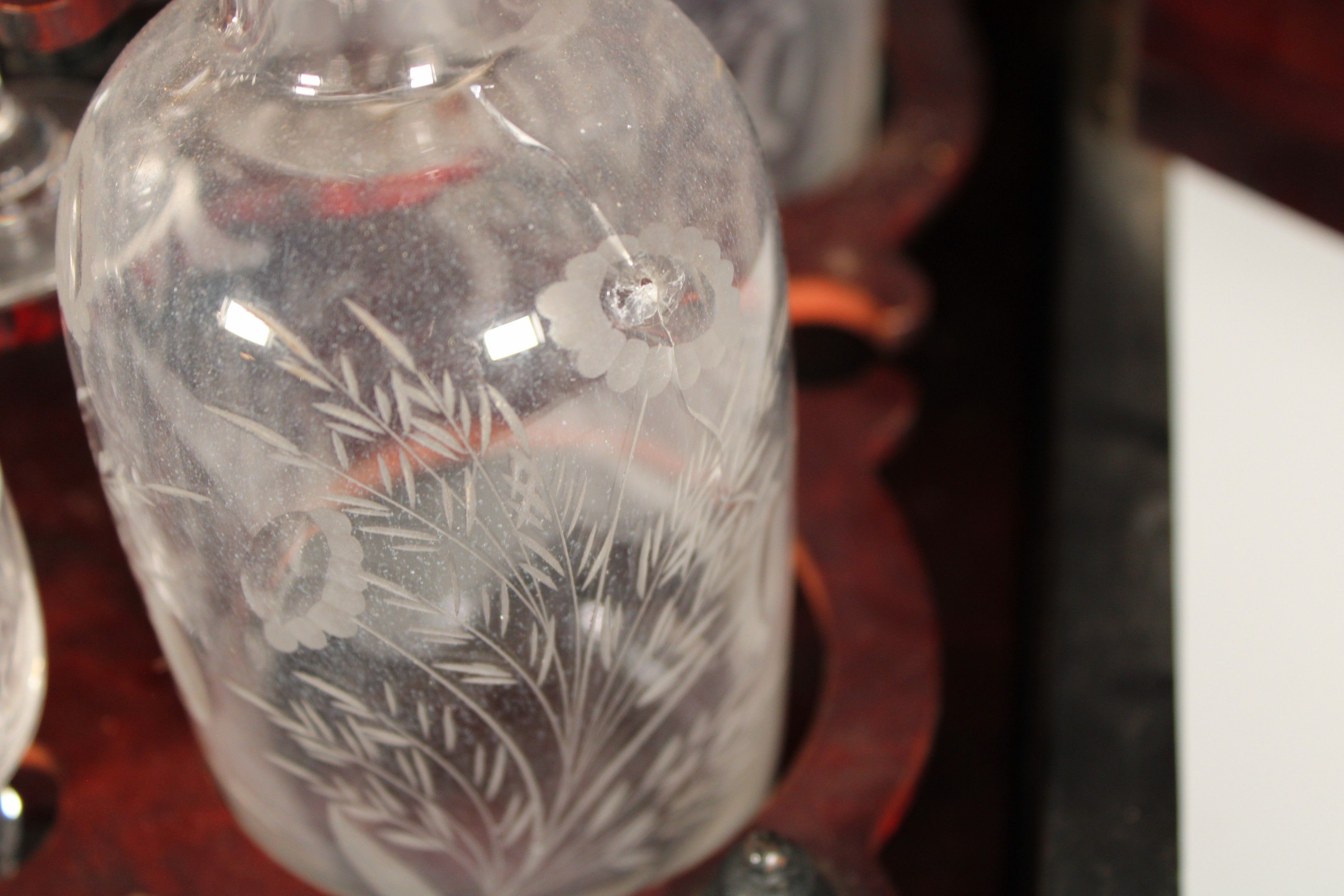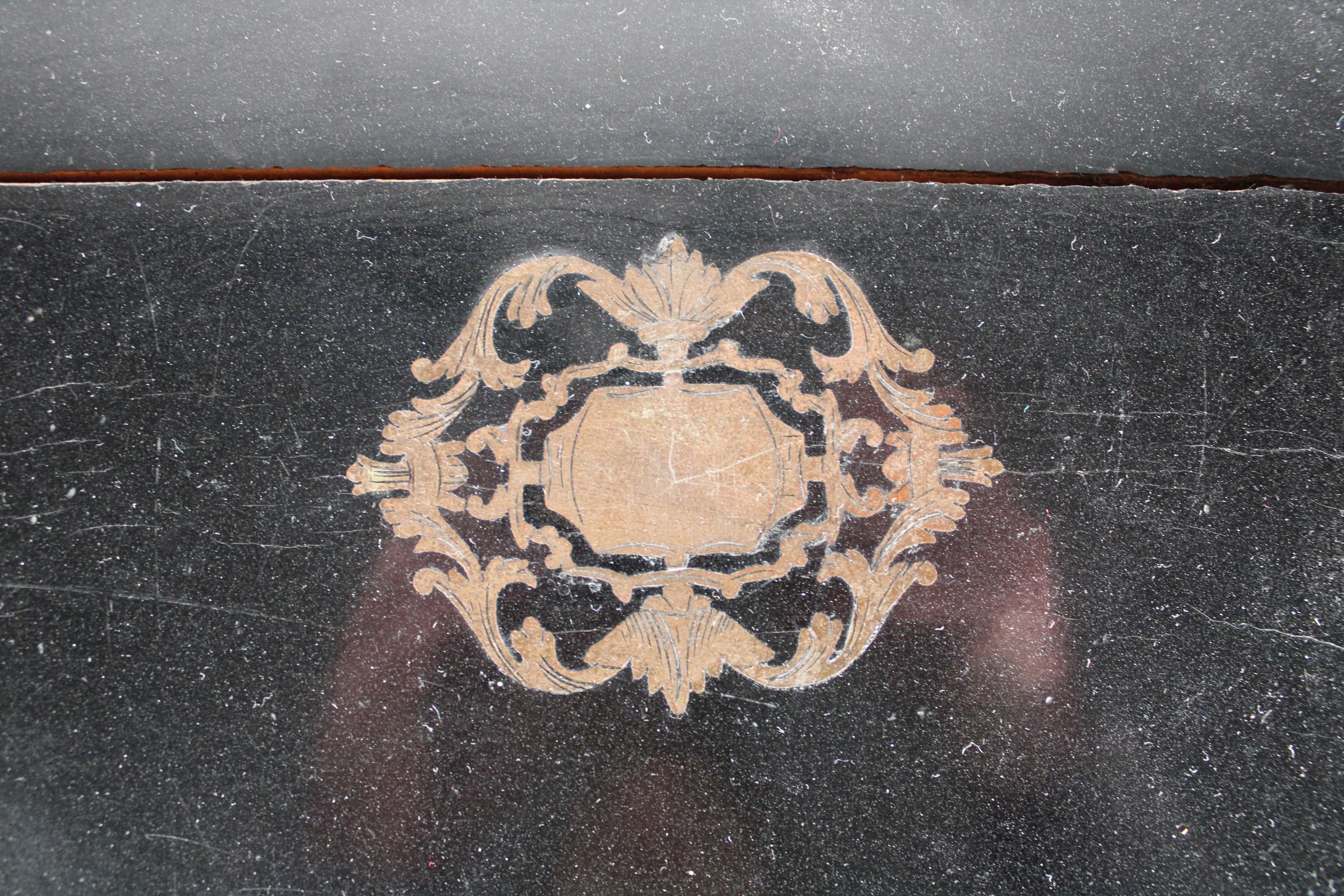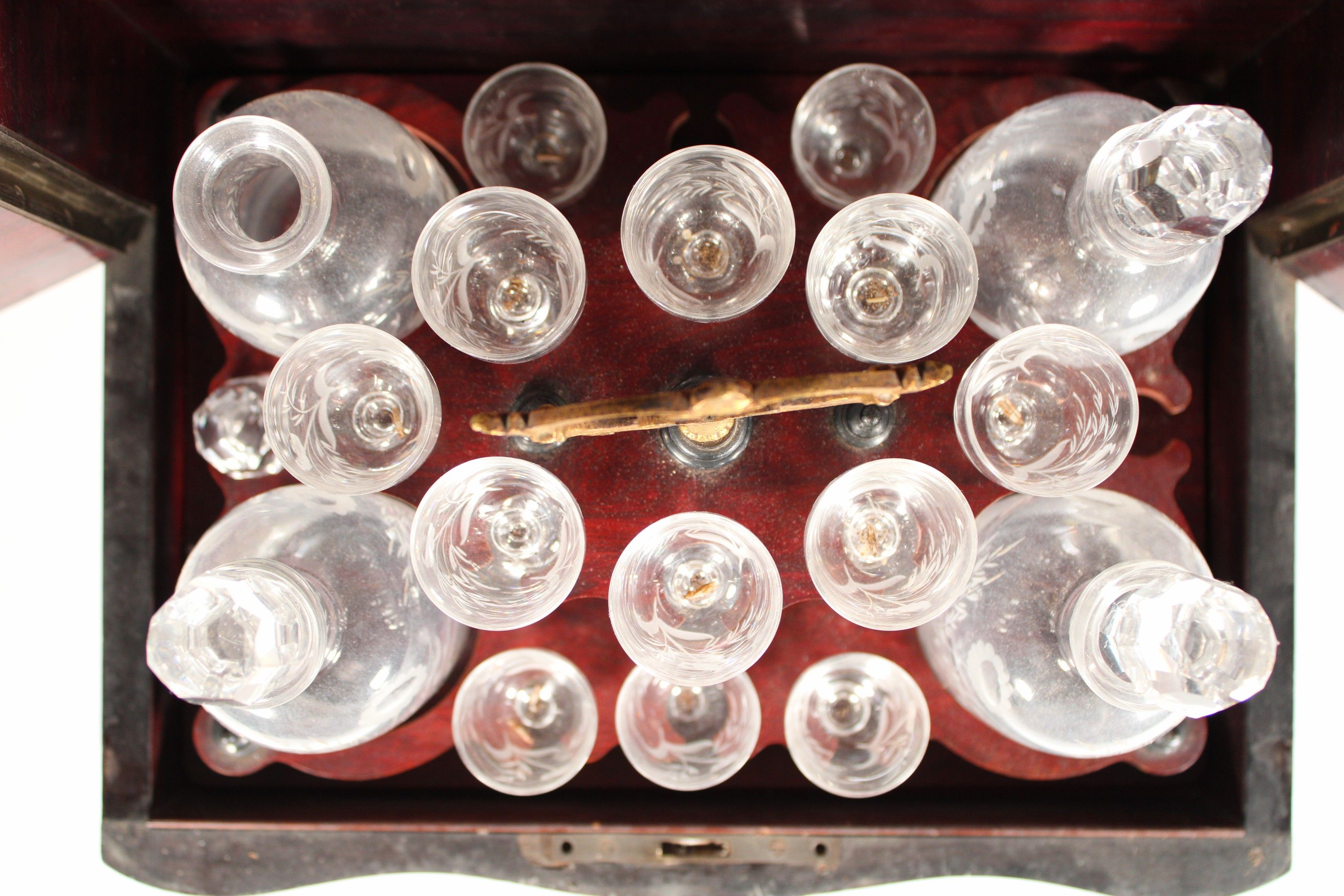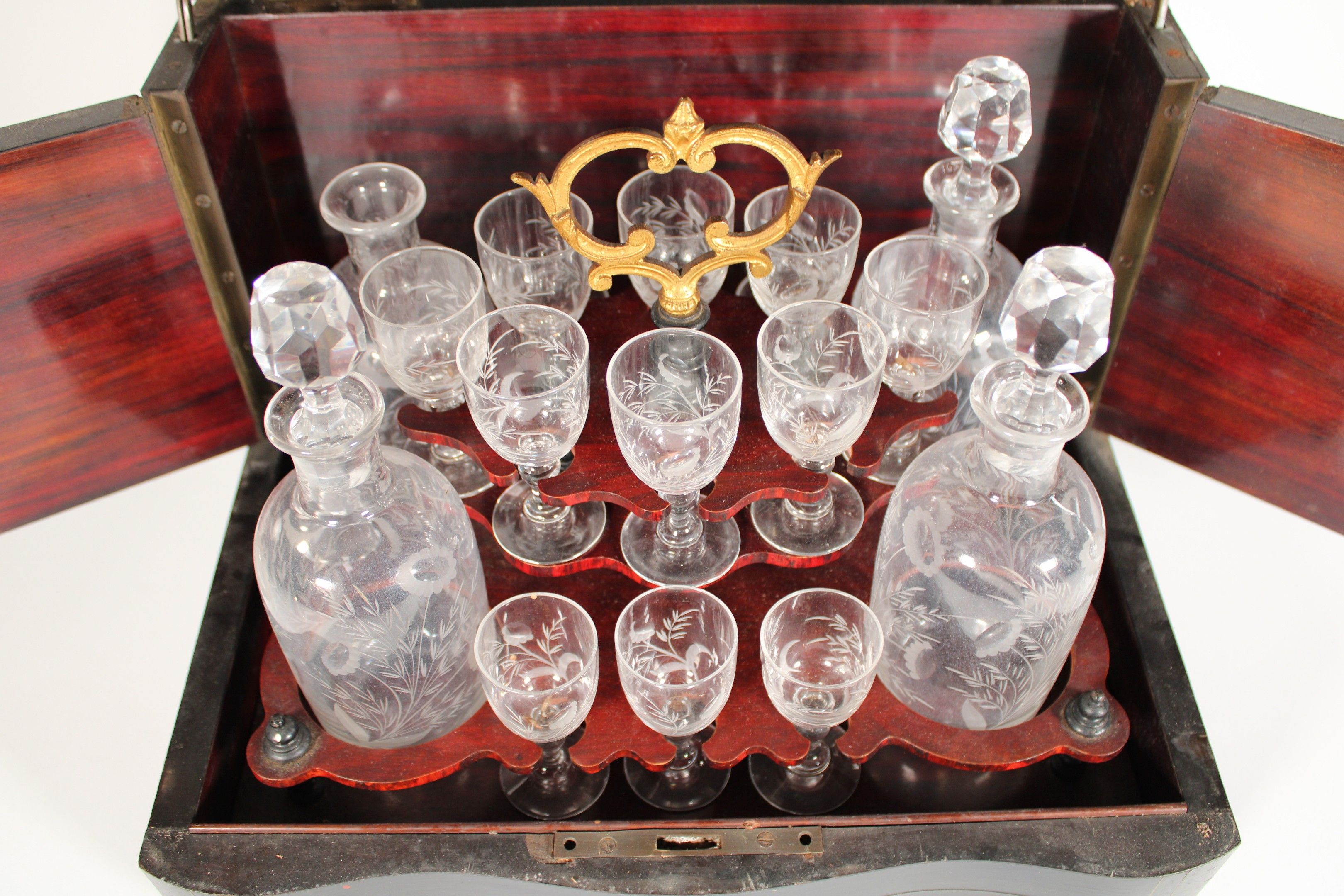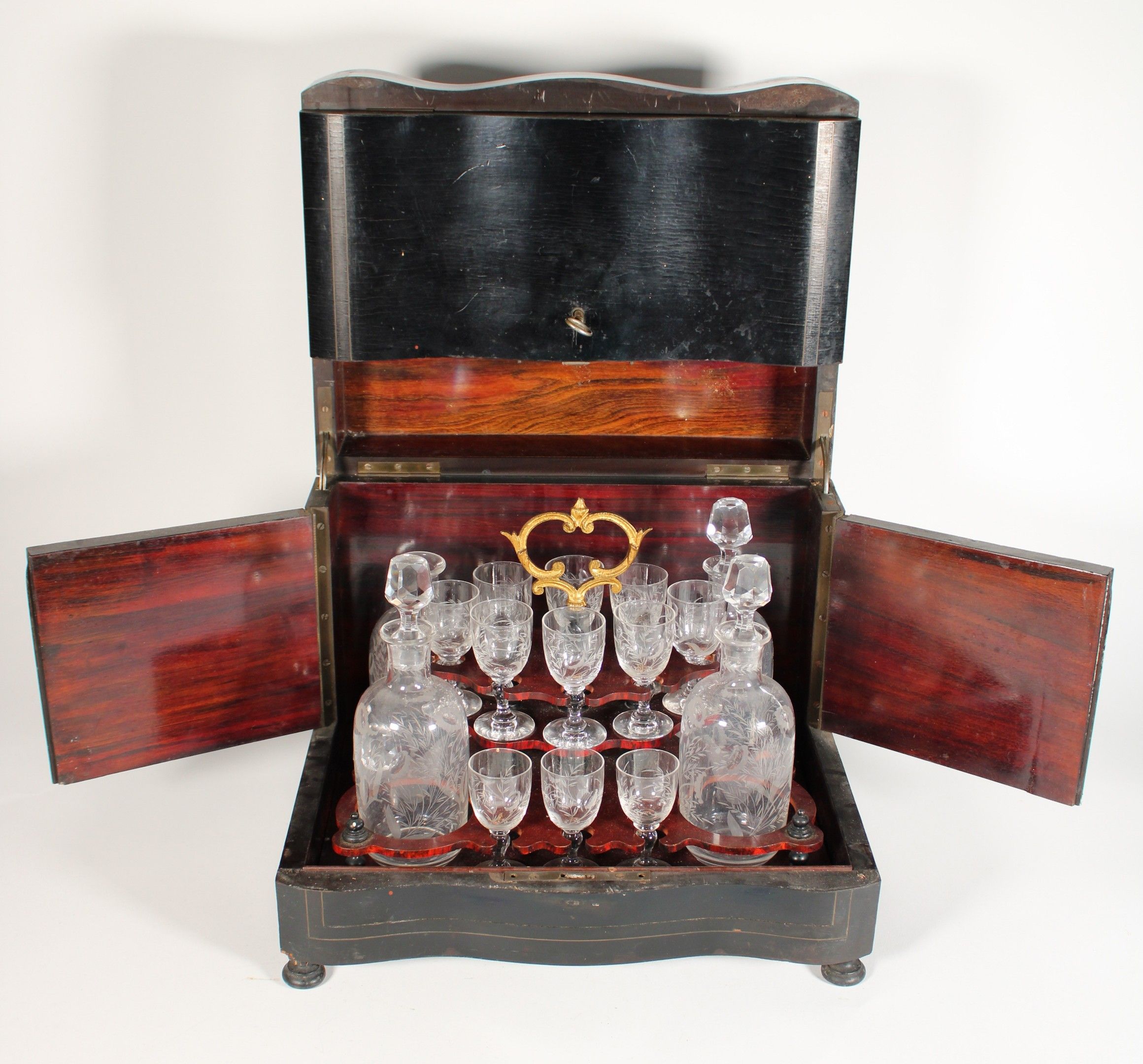 Liqueur cabinet in blackened wood veneer with brass fillet and medallion motif. It includes 4 decanters (one stopper missing, one decanter damaged) and 13 glasses (3 glasses missing), all with engraved floral decoration.